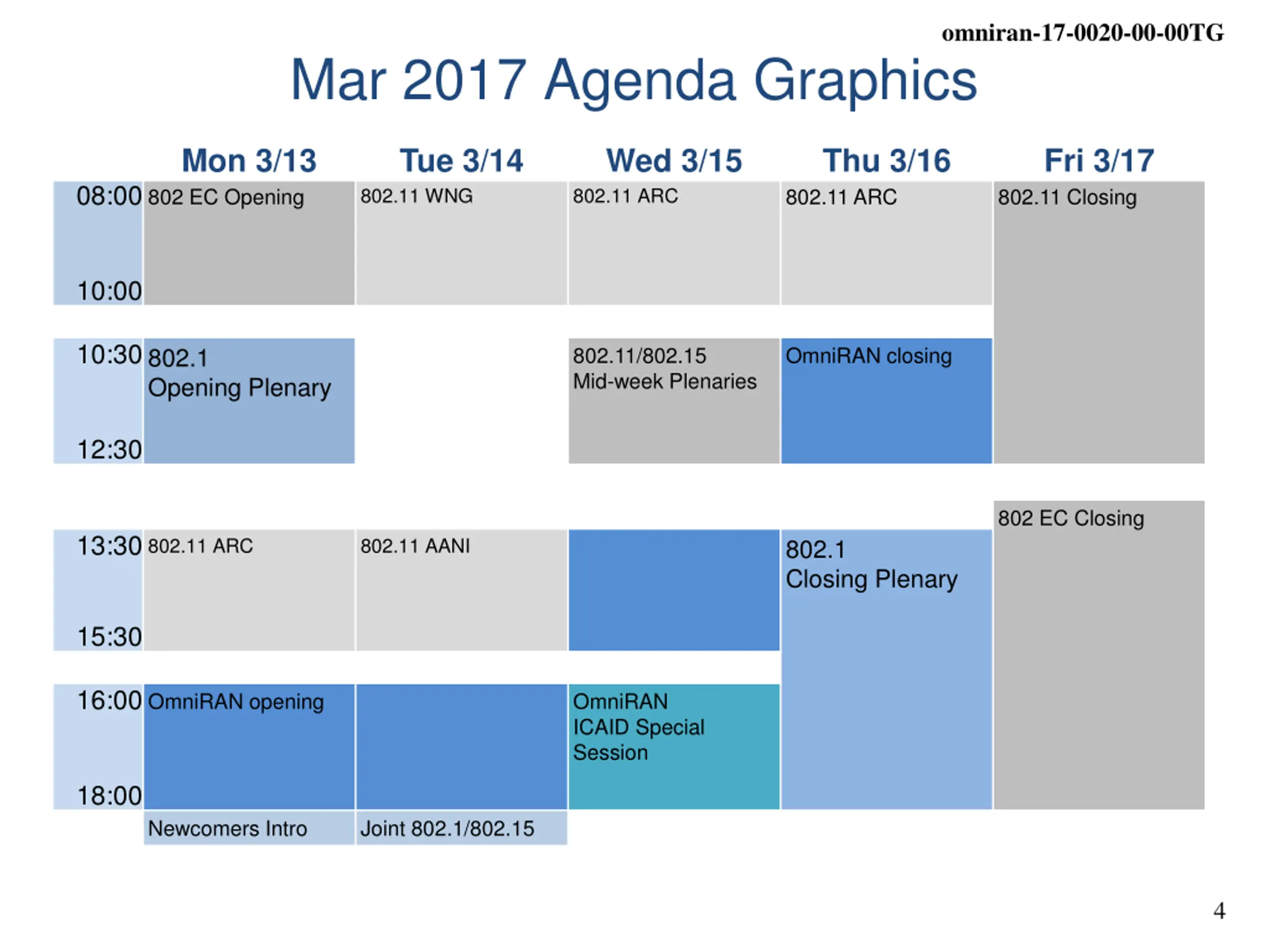 omniran-17-0020-00-00TG Mar 2017 Agenda Graphics Mon 3/13 802 EC Opening Tue 3/14 802.11 WNG Wed 3/15 802.11 ARC Thu 3/16 802.11 ARC Fri 3/17 802.11 Closing 08:00 10:00 10:30 802.1 Opening Plenary 802.11/802.15 Mid-week Plenaries OmniRAN closing 12:30 802 EC Closing 13:30 802.11 ARC 802.11 AANI 802.1 Closing Plenary 15:30 16:00 OmniRAN opening OmniRAN ICAID Special Session 18:00 Newcomers Intro Joint 802.1/802.15 4