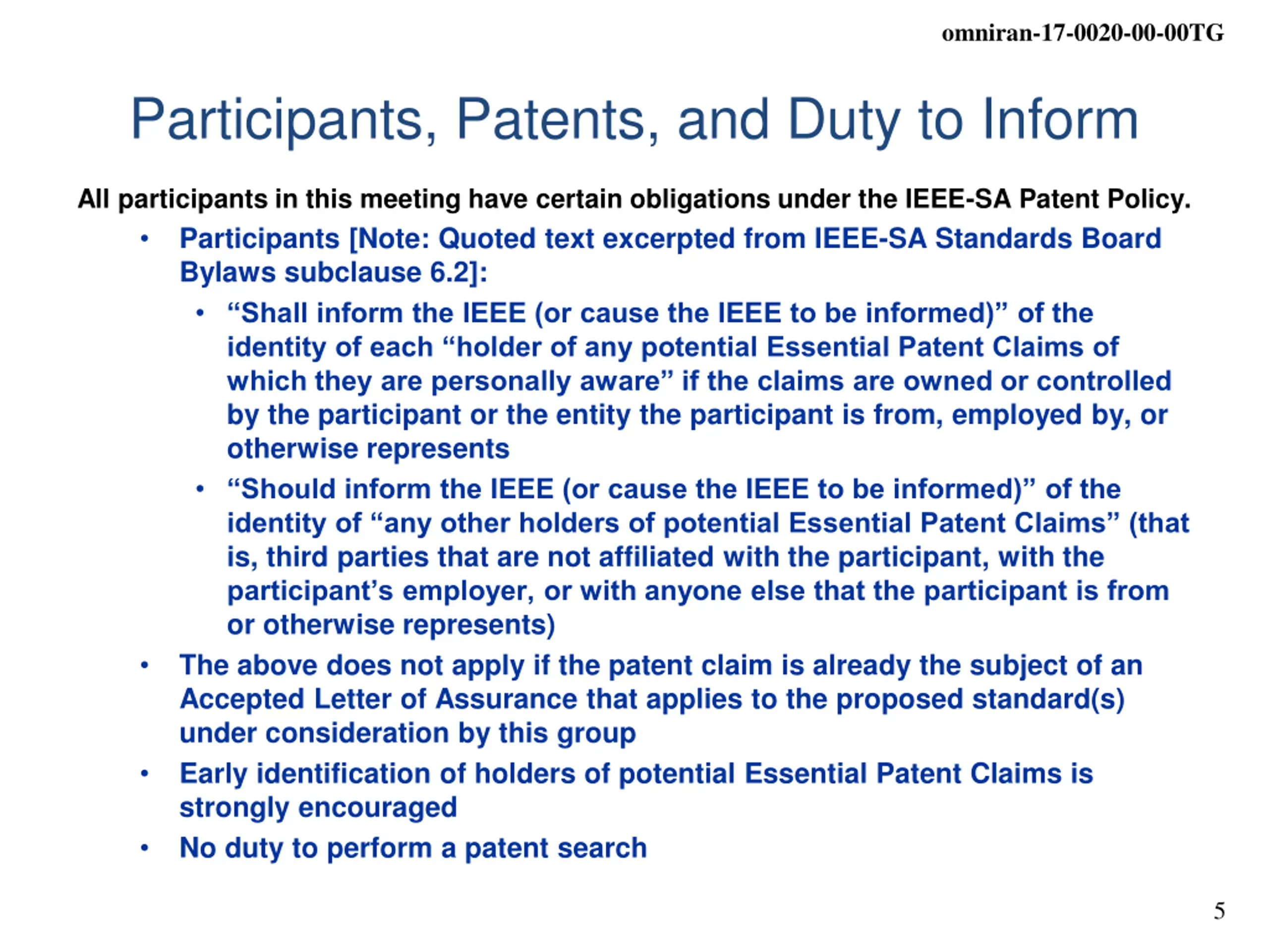omniran-17-0020-00-00TG Participants, Patents, and Duty to Inform All participants in this meeting have certain obligations under the IEEE-SA Patent Policy. Participants [Note: Quoted text excerpted from IEEE-SA Standards Board Bylaws subclause 6.2]: Shall inform the IEEE (or cause the IEEE to be informed) of the identity of each holder of any potential Essential Patent Claims of which they are personally aware if the claims are owned or controlled by the participant or the entity the participant is from, employed by, or otherwise represents Should inform the IEEE (or cause the IEEE to be informed) of the identity of any other holders of potential Essential Patent Claims (that is, third parties that are not affiliated with the participant, with the participant s employer, or with anyone else that the participant is from or otherwise represents) The above does not apply if the patent claim is already the subject of an Accepted Letter of Assurance that applies to the proposed standard(s) under consideration by this group Early identification of holders of potential Essential Patent Claims is strongly encouraged No duty to perform a patent search 5