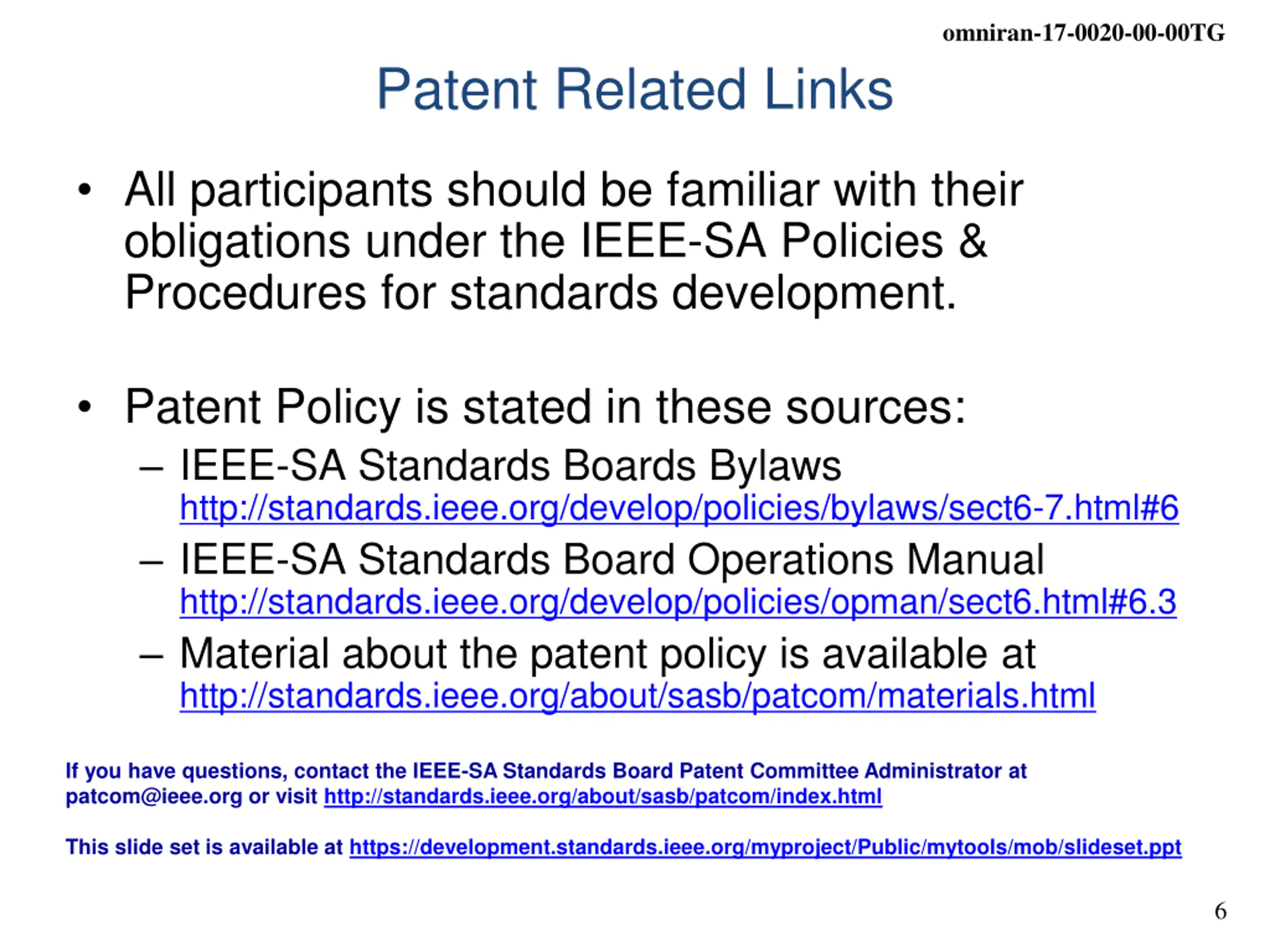 omniran-17-0020-00-00TG Patent Related Links All participants should be familiar with their obligations under the IEEE-SA Policies & Procedures for standards development. Patent Policy is stated in these sources: IEEE-SA Standards Boards Bylaws http://standards.ieee.org/develop/policies/bylaws/sect6-7.html#6 IEEE-SA Standards Board Operations Manual http://standards.ieee.org/develop/policies/opman/sect6.html#6.3 Material about the patent policy is available at http://standards.ieee.org/about/sasb/patcom/materials.html If you have questions, contact the IEEE-SA Standards Board Patent Committee Administrator at patcom@ieee.org or visit http://standards.ieee.org/about/sasb/patcom/index.html This slide set is available at https://development.standards.ieee.org/myproject/Public/mytools/mob/slideset.ppt 6