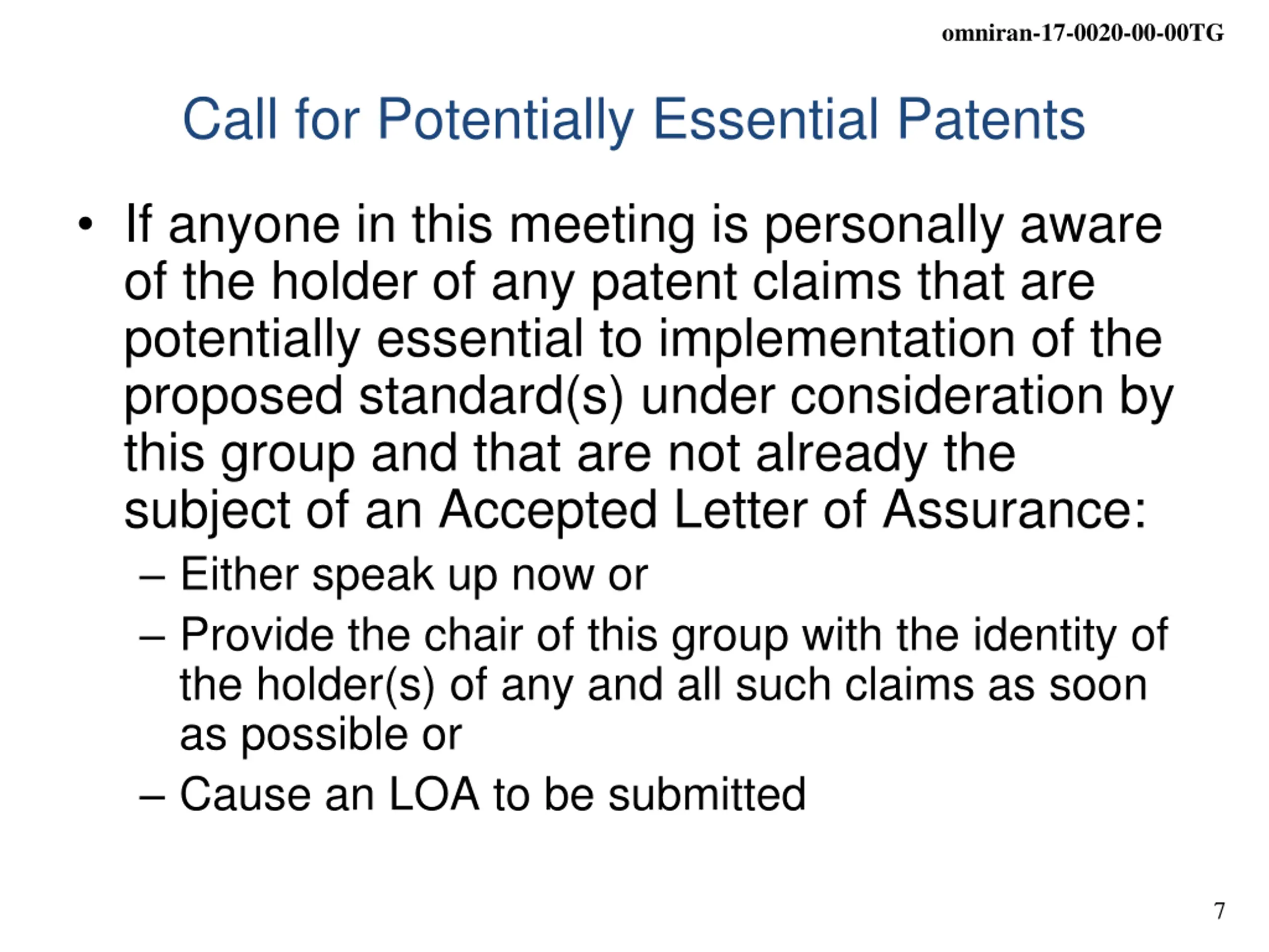 omniran-17-0020-00-00TG Call for Potentially Essential Patents If anyone in this meeting is personally aware of the holder of any patent claims that are potentially essential to implementation of the proposed standard(s) under consideration by this group and that are not already the subject of an Accepted Letter of Assurance: Either speak up now or Provide the chair of this group with the identity of the holder(s) of any and all such claims as soon as possible or Cause an LOA to be submitted 7