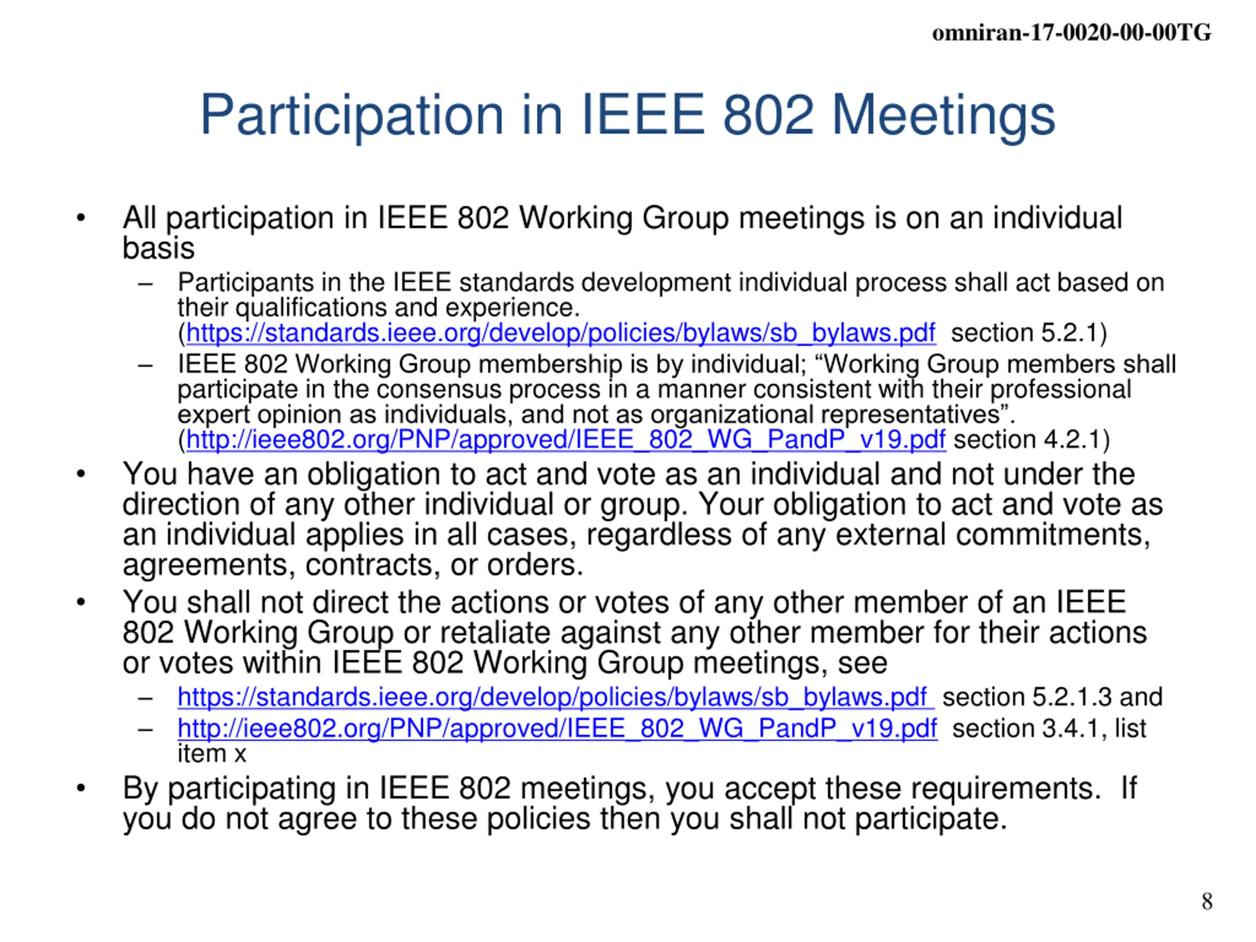 omniran-17-0020-00-00TG Participation in IEEE 802 Meetings All participation in IEEE 802 Working Group meetings is on an individual basis Participants in the IEEE standards development individual process shall act based on their qualifications and experience. (https://standards.ieee.org/develop/policies/bylaws/sb_bylaws.pdf section 5.2.1) IEEE 802 Working Group membership is by individual; Working Group members shall participate in the consensus process in a manner consistent with their professional expert opinion as individuals, and not as organizational representatives . (http://ieee802.org/PNP/approved/IEEE_802_WG_PandP_v19.pdf section 4.2.1) You have an obligation to act and vote as an individual and not under the direction of any other individual or group. Your obligation to act and vote as an individual applies in all cases, regardless of any external commitments, agreements, contracts, or orders. You shall not direct the actions or votes of any other member of an IEEE 802 Working Group or retaliate against any other member for their actions or votes within IEEE 802 Working Group meetings, see https://standards.ieee.org/develop/policies/bylaws/sb_bylaws.pdf section 5.2.1.3 and http://ieee802.org/PNP/approved/IEEE_802_WG_PandP_v19.pdf section 3.4.1, list item x By participating in IEEE 802 meetings, you accept these requirements. If you do not agree to these policies then you shall not participate. 8