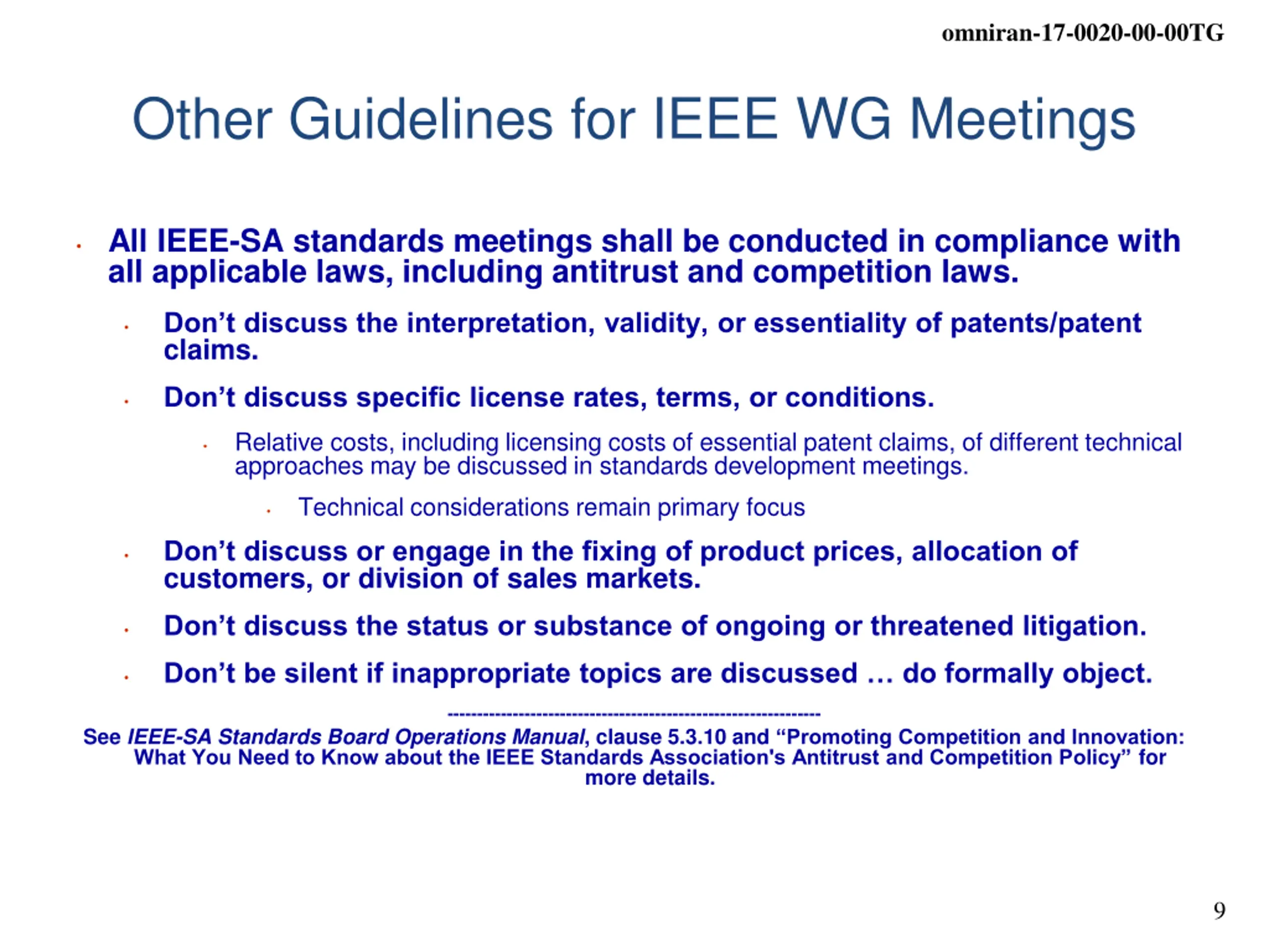 omniran-17-0020-00-00TG Other Guidelines for IEEE WG Meetings All IEEE-SA standards meetings shall be conducted in compliance with all applicable laws, including antitrust and competition laws. Don t discuss the interpretation, validity, or essentiality of patents/patent claims. Don t discuss specific license rates, terms, or conditions. Relative costs, including licensing costs of essential patent claims, of different technical approaches may be discussed in standards development meetings. Technical considerations remain primary focus Don t discuss or engage in the fixing of product prices, allocation of customers, or division of sales markets. Don t discuss the status or substance of ongoing or threatened litigation. Don t be silent if inappropriate topics are discussed do formally object. --------------------------------------------------------------- See IEEE-SA Standards Board Operations Manual, clause 5.3.10 and Promoting Competition and Innovation: What You Need to Know about the IEEE Standards Association's Antitrust and Competition Policy for more details. 9