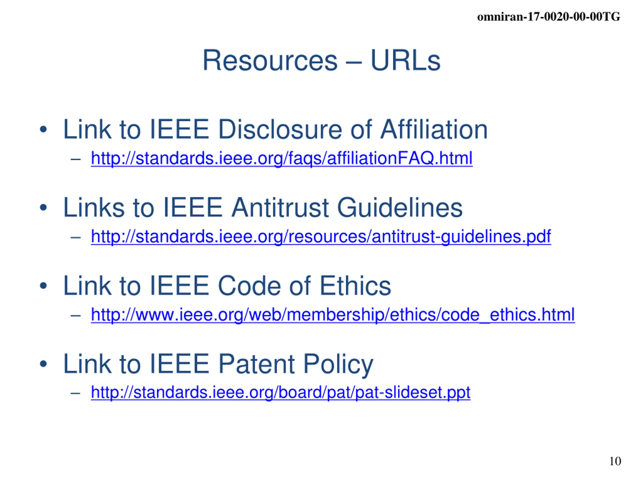 omniran-17-0020-00-00TG Resources URLs Link to IEEE Disclosure of Affiliation http://standards.ieee.org/faqs/affiliationFAQ.html Links to IEEE Antitrust Guidelines http://standards.ieee.org/resources/antitrust-guidelines.pdf Link to IEEE Code of Ethics http://www.ieee.org/web/membership/ethics/code_ethics.html Link to IEEE Patent Policy http://standards.ieee.org/board/pat/pat-slideset.ppt 10