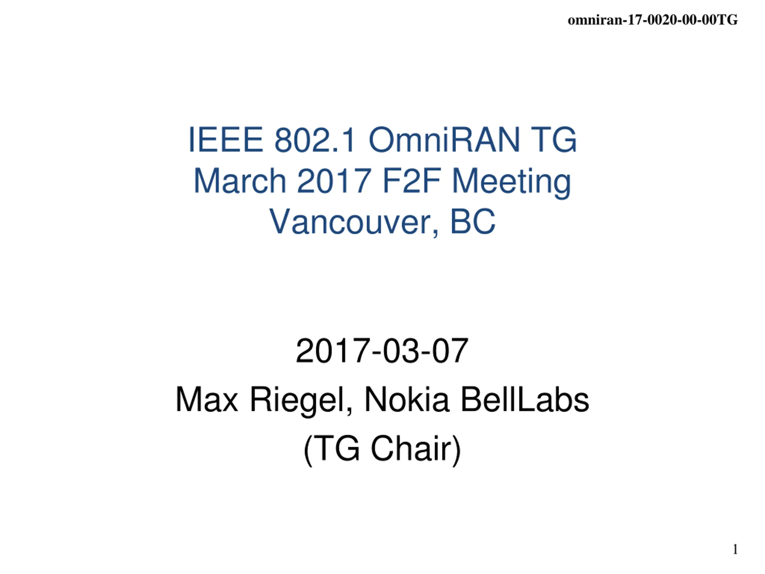 omniran-17-0020-00-00TG IEEE 802.1 OmniRAN TG March 2017 F2F Meeting Vancouver, BC 2017-03-07 Max Riegel, Nokia BellLabs (TG Chair) 1