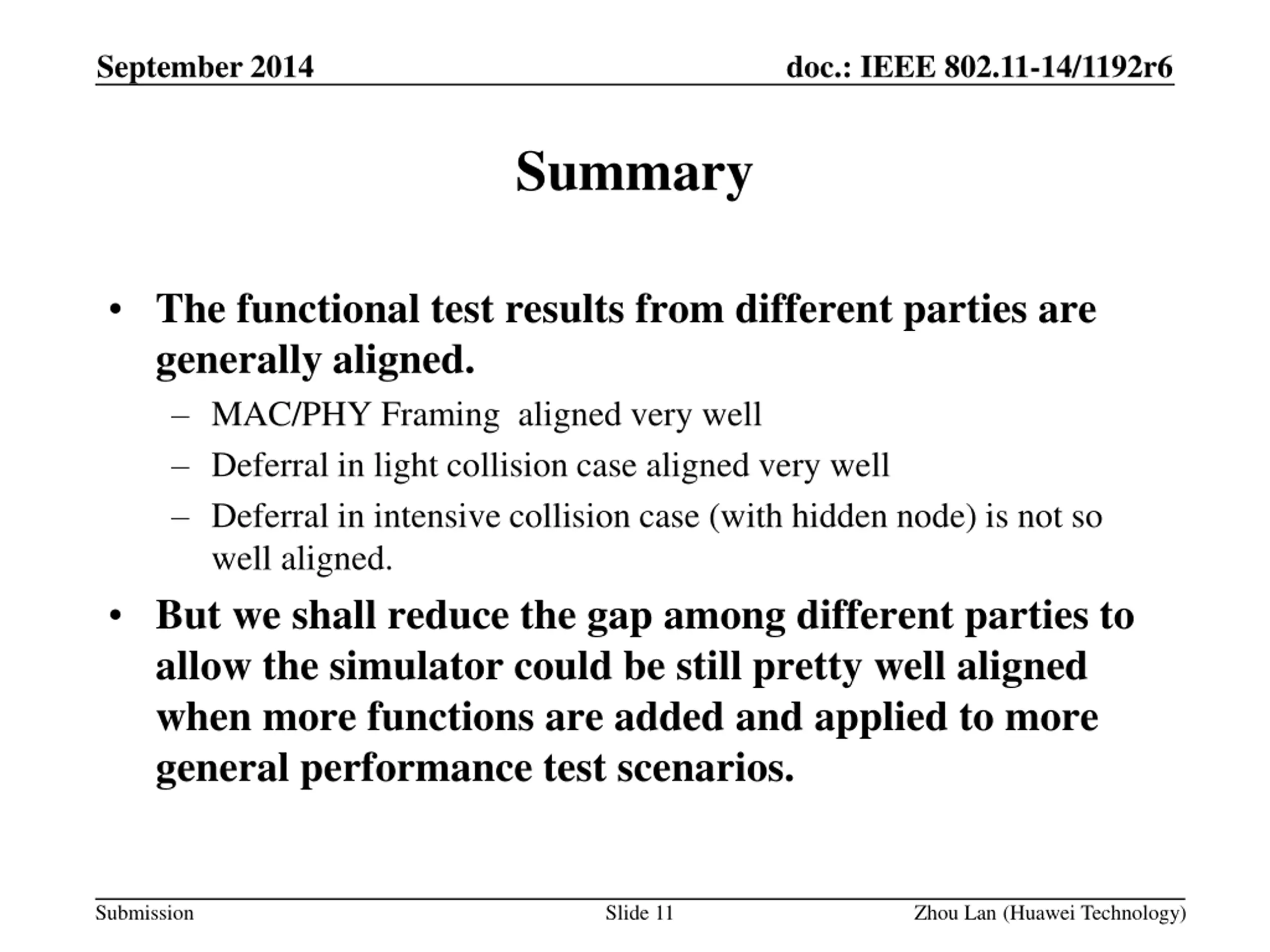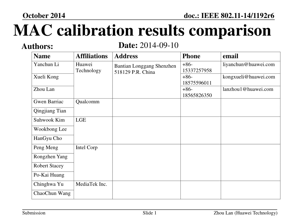 October 2014 doc.: IEEE 802.11-14/1192r6 MAC calibration results comparison Date: 2014-09-10 Authors: Name Affiliations Address Yanchun Li Huawei Technology 518129 P.R. China Xueli Kong Phone +86- 15337257958 +86- 18575596011 +86- 18565826350 email liyanchun@huawei.com Bantian Longgang Shenzhen kongxueli@huawei.com Zhou Lan lanzhou1@huawei.com Gwen Barriac Qualcomm Qingjiang Tian Suhwook Kim LGE Wookbong Lee HanGyu Cho Peng Meng Intel Corp Rongzhen Yang Robert Stacey Po-Kai Huang Chinghwa Yu MediaTek Inc. ChaoChun Wang Submission Slide 1 Zhou Lan (Huawei Technology)