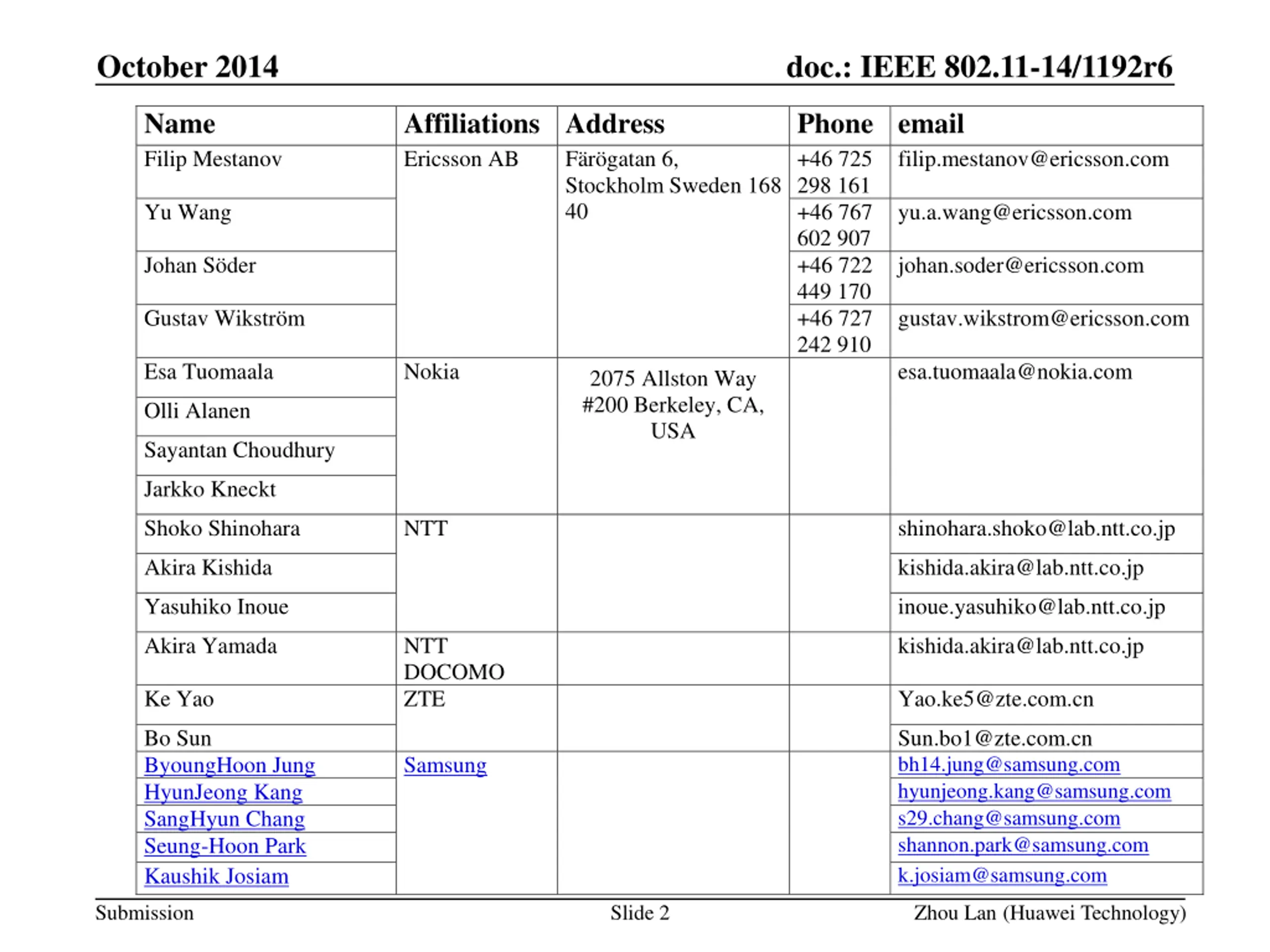 October 2014 doc.: IEEE 802.11-14/1192r6 Name Filip Mestanov Affiliations Address Ericsson AB Phone email +46 725 298 161 +46 767 602 907 +46 722 449 170 +46 727 242 910 F r gatan 6, Stockholm Sweden 168 40 filip.mestanov@ericsson.com Yu Wang yu.a.wang@ericsson.com Johan S der johan.soder@ericsson.com Gustav Wikstr m gustav.wikstrom@ericsson.com Esa Tuomaala Nokia esa.tuomaala@nokia.com 2075 Allston Way #200 Berkeley, CA, USA Olli Alanen Sayantan Choudhury Jarkko Kneckt Shoko Shinohara NTT shinohara.shoko@lab.ntt.co.jp Akira Kishida kishida.akira@lab.ntt.co.jp Yasuhiko Inoue inoue.yasuhiko@lab.ntt.co.jp Akira Yamada NTT DOCOMO ZTE kishida.akira@lab.ntt.co.jp Ke Yao Yao.ke5@zte.com.cn Bo Sun ByoungHoon Jung HyunJeong Kang SangHyun Chang Seung-Hoon Park Kaushik Josiam Sun.bo1@zte.com.cn bh14.jung@samsung.com hyunjeong.kang@samsung.com s29.chang@samsung.com shannon.park@samsung.com k.josiam@samsung.com Samsung Submission Slide 2 Zhou Lan (Huawei Technology)
