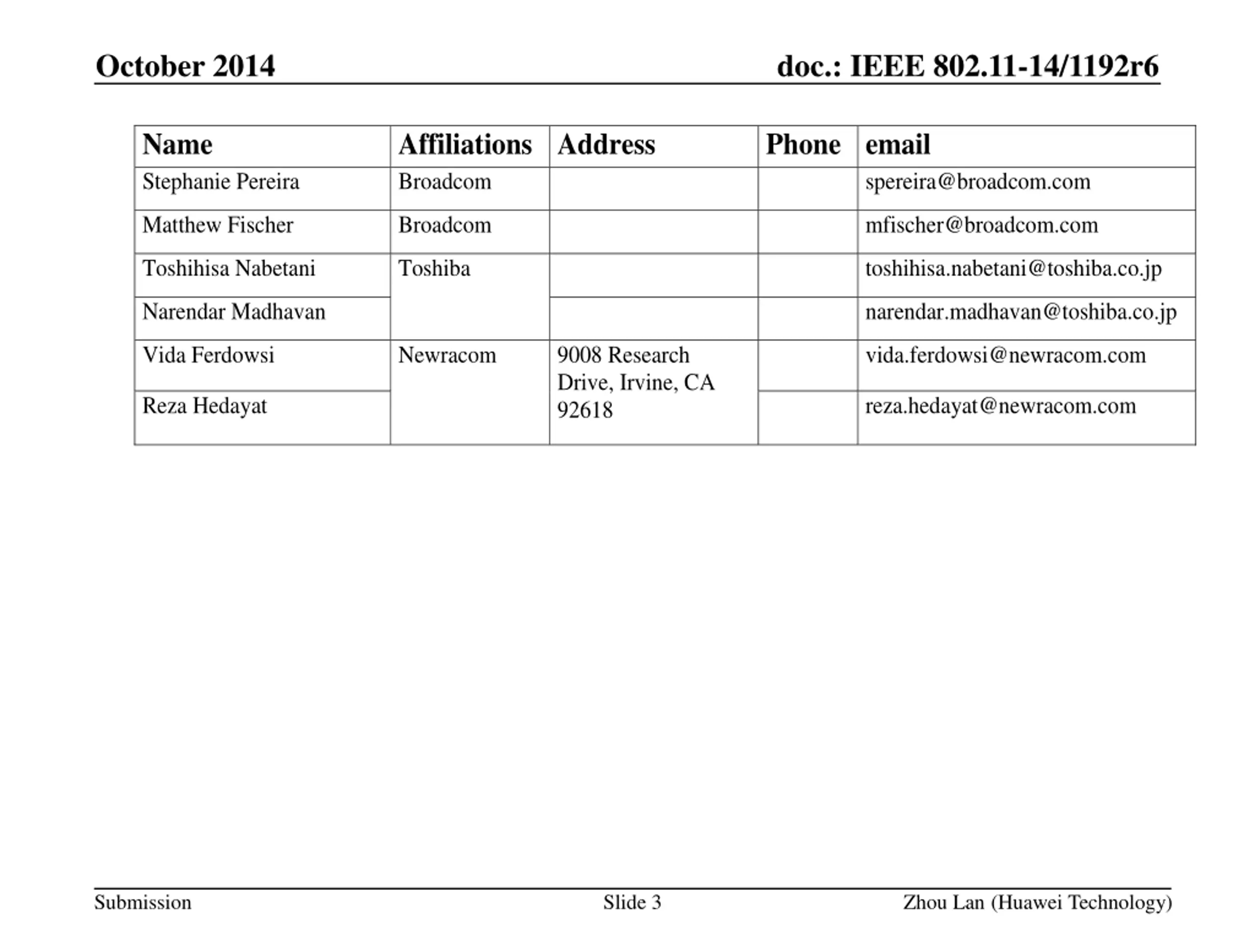 October 2014 doc.: IEEE 802.11-14/1192r6 Name Stephanie Pereira Affiliations Address Broadcom Phone email spereira@broadcom.com Matthew Fischer Broadcom mfischer@broadcom.com Toshihisa Nabetani Toshiba toshihisa.nabetani@toshiba.co.jp Narendar Madhavan narendar.madhavan@toshiba.co.jp 9008 Research Drive, Irvine, CA 92618 Vida Ferdowsi Newracom vida.ferdowsi@newracom.com Reza Hedayat reza.hedayat@newracom.com Submission Slide 3 Zhou Lan (Huawei Technology)