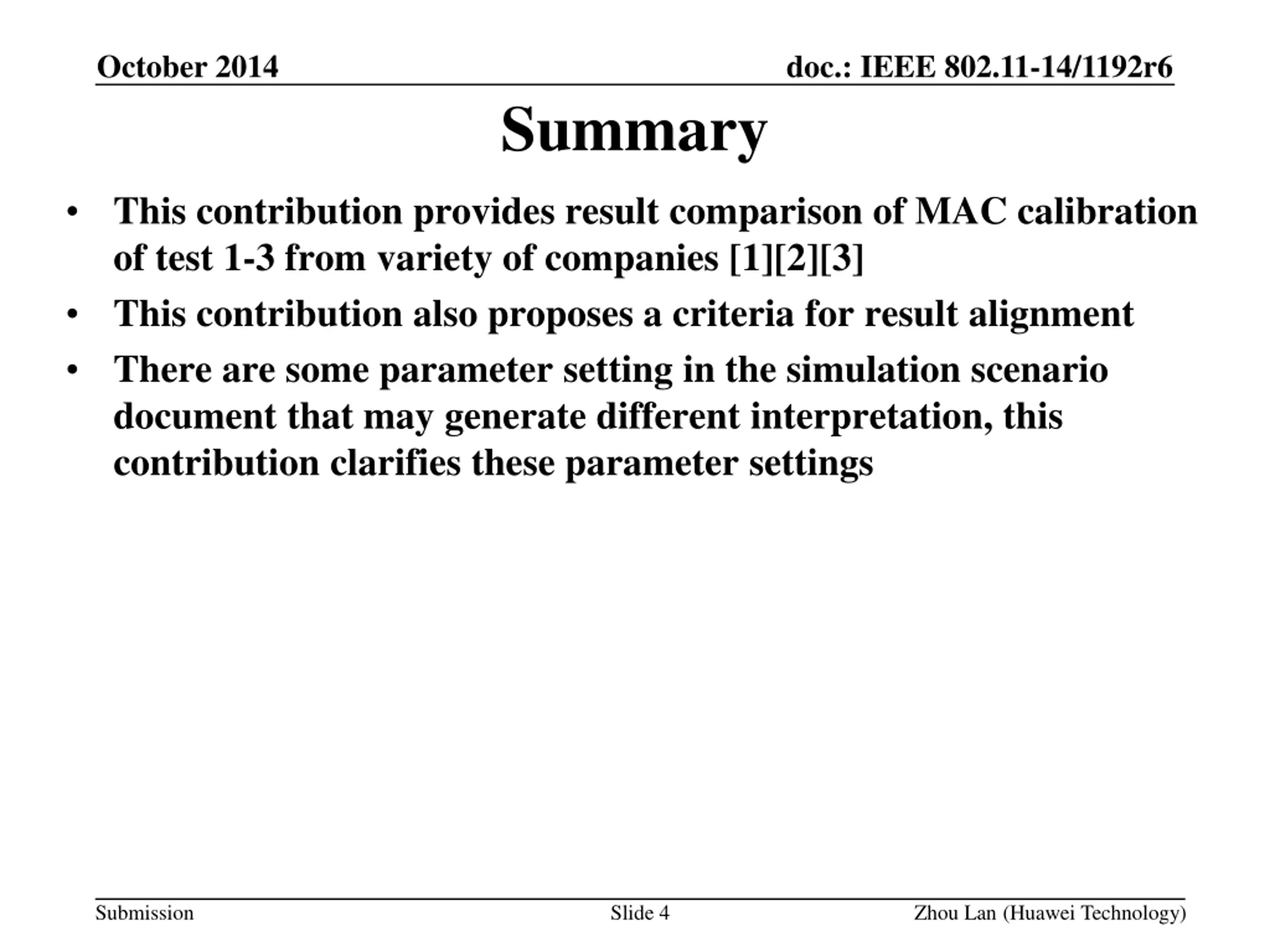 October 2014 doc.: IEEE 802.11-14/1192r6 Summary This contribution provides result comparison of MAC calibration of test 1-3 from variety of companies [1][2][3] This contribution also proposes a criteria for result alignment There are some parameter setting in the simulation scenario document that may generate different interpretation, this contribution clarifies these parameter settings Submission Slide 4 Zhou Lan (Huawei Technology)