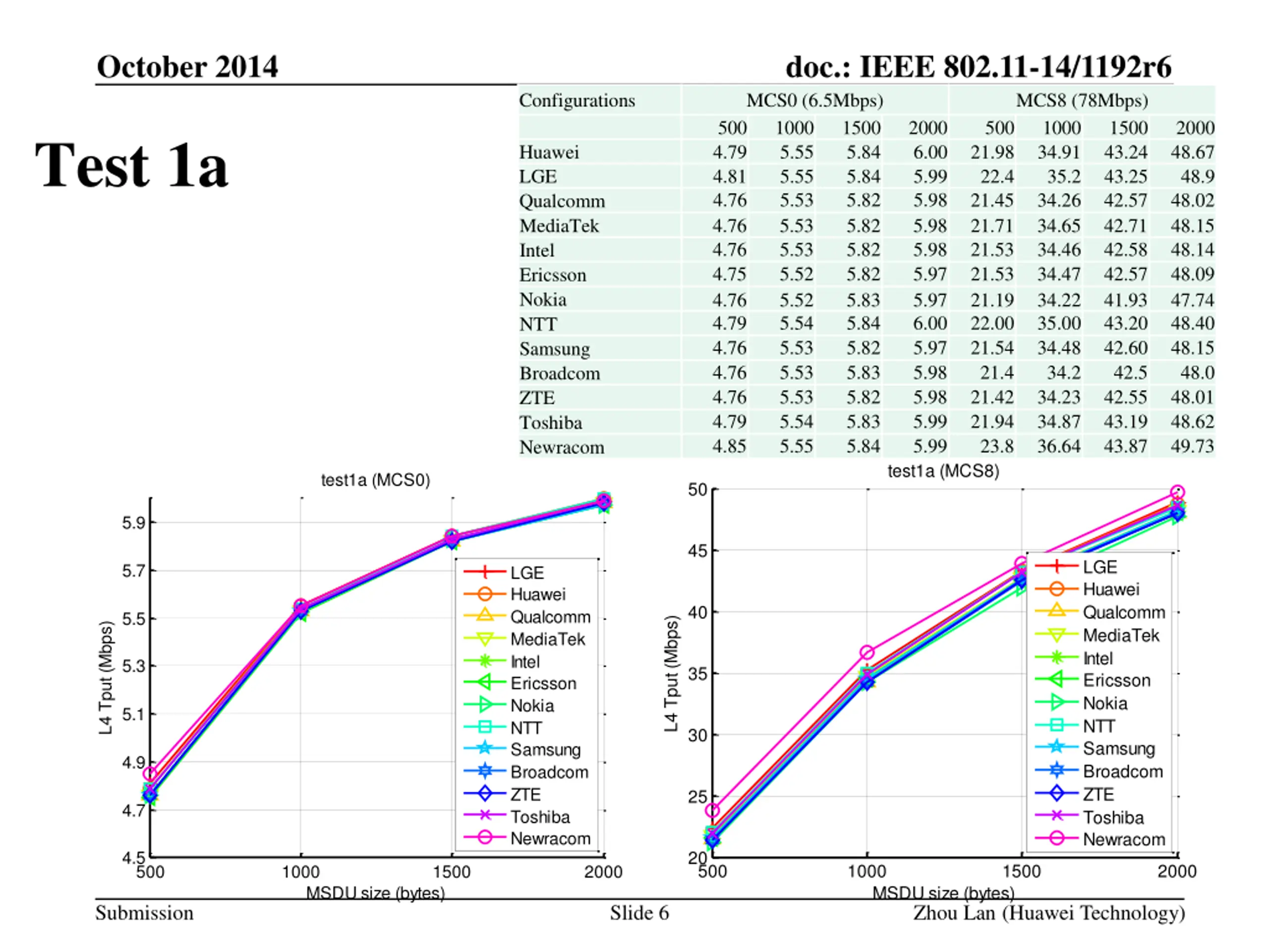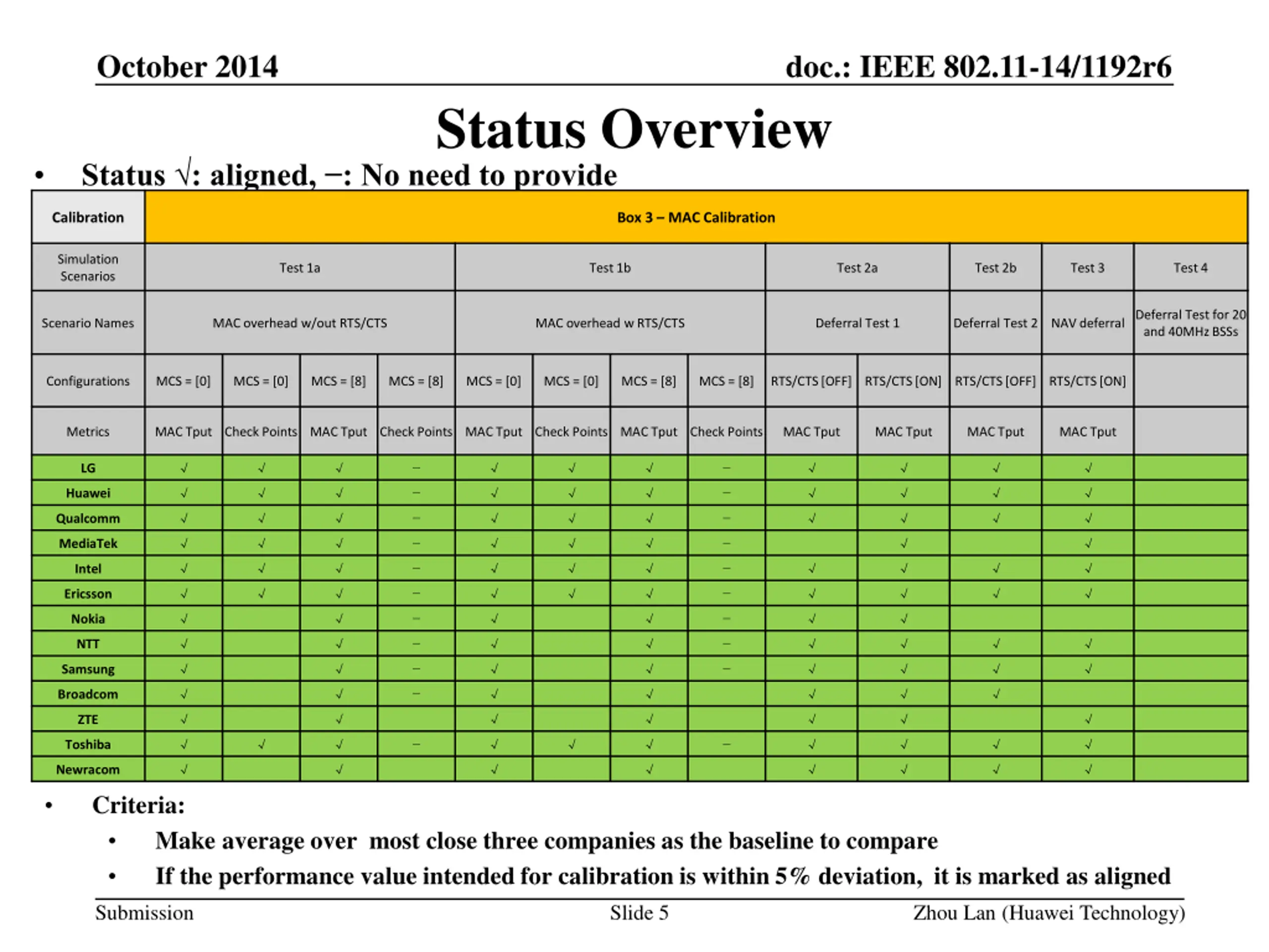 October 2014 doc.: IEEE 802.11-14/1192r6 Status Overview Status : aligned, : No need to provide Calibration Box 3 MAC Calibration Simulation Scenarios Test 1a Test 1b Test 2a Test 2b Test 3 Test 4 Deferral Test for 20 and 40MHz BSSs Scenario Names MAC overhead w/out RTS/CTS MAC overhead w RTS/CTS Deferral Test 1 Deferral Test 2 NAV deferral Configurations MCS = [0] MCS = [0] MCS = [8] MCS = [8] MCS = [0] MCS = [0] MCS = [8] MCS = [8] RTS/CTS [OFF] RTS/CTS [ON] RTS/CTS [OFF] RTS/CTS [ON] Metrics MAC Tput Check Points MAC Tput Check Points MAC Tput Check Points MAC Tput Check Points MAC Tput MAC Tput MAC Tput MAC Tput LG Huawei Qualcomm MediaTek Intel Ericsson Nokia NTT Samsung Broadcom ZTE Toshiba Newracom Criteria: Make average over most close three companies as the baseline to compare If the performance value intended for calibration is within 5% deviation, it is marked as aligned Submission Slide 5 Zhou Lan (Huawei Technology)