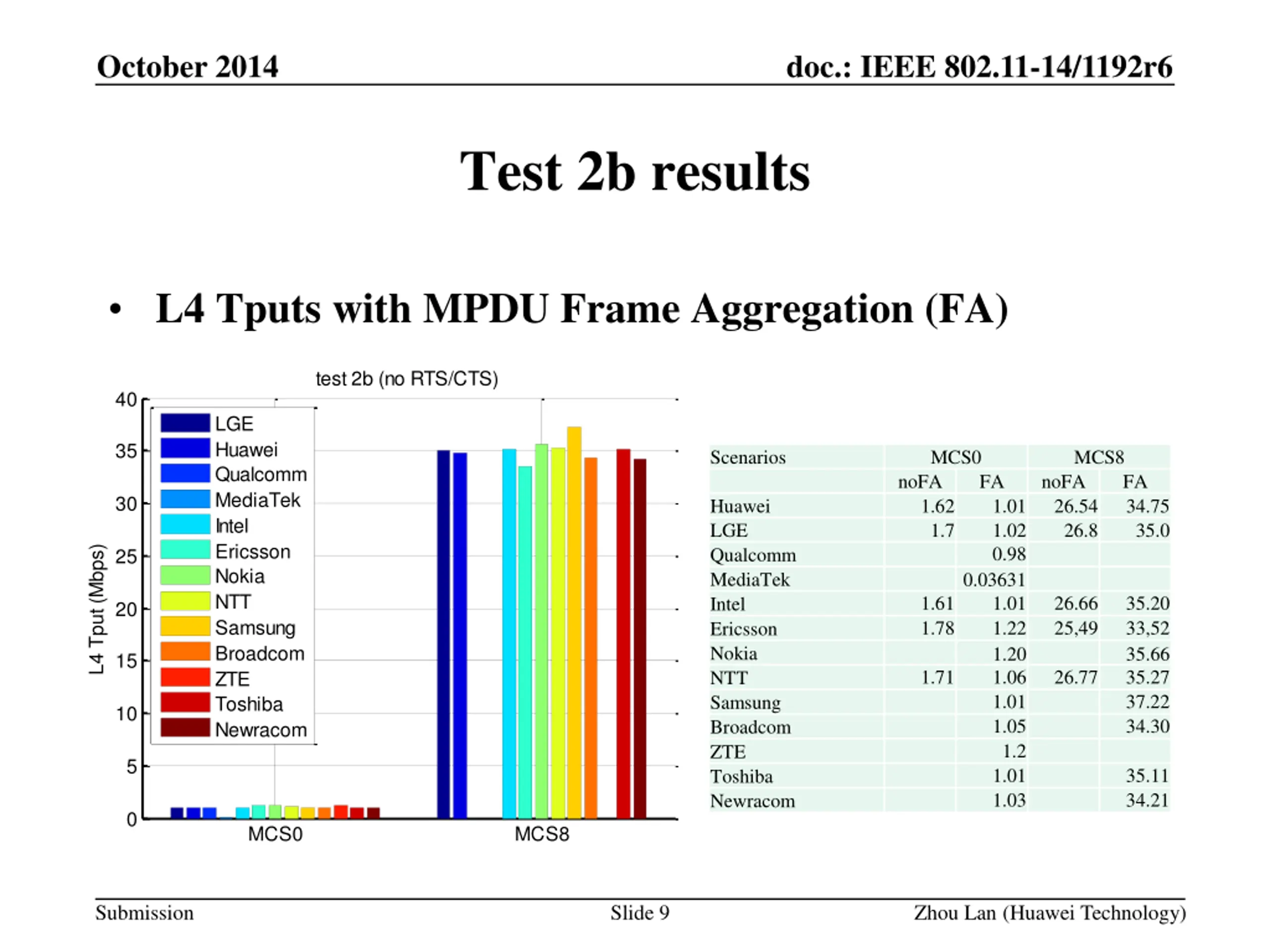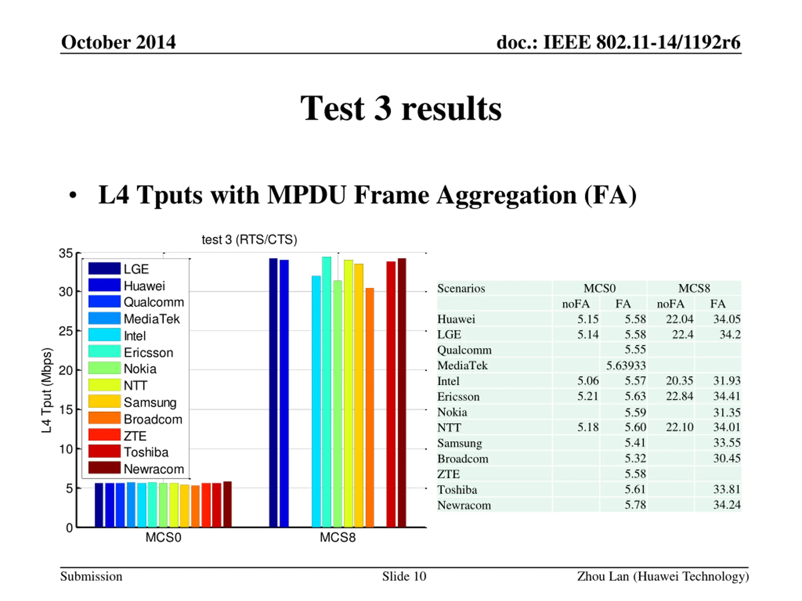 October 2014 doc.: IEEE 802.11-14/1192r6 Test 2b results L4 Tputs with MPDU Frame Aggregation (FA) test 2b (no RTS/CTS) 40 LGE Huawei Qualcomm MediaTek Intel Ericsson Nokia NTT Samsung Broadcom ZTE Toshiba Newracom 35 Scenarios MCS0 MCS8 noFA FA noFA 26.54 26.8 FA 34.75 35.0 30 Huawei LGE Qualcomm MediaTek Intel Ericsson Nokia NTT Samsung Broadcom ZTE Toshiba Newracom 1.62 1.7 1.01 1.02 0.98 L4 Tput (Mbps) 25 0.03631 1.01 1.22 1.20 1.06 1.01 1.05 1.61 1.78 26.66 25,49 35.20 33,52 35.66 35.27 37.22 34.30 20 15 1.71 26.77 10 1.2 1.01 1.03 5 35.11 34.21 0 MCS0 MCS8 Submission Slide 9 Zhou Lan (Huawei Technology)