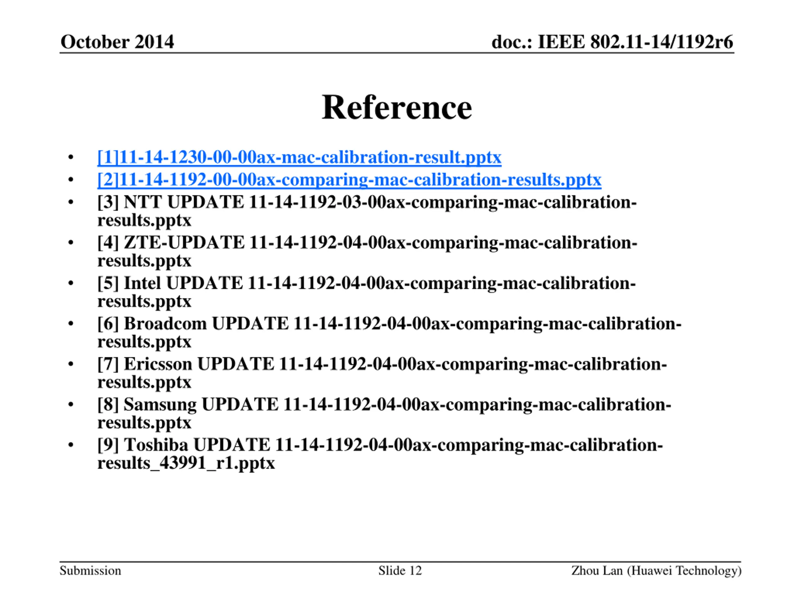 October 2014 doc.: IEEE 802.11-14/1192r6 Reference [1]11-14-1230-00-00ax-mac-calibration-result.pptx [2]11-14-1192-00-00ax-comparing-mac-calibration-results.pptx [3] NTT UPDATE 11-14-1192-03-00ax-comparing-mac-calibration- results.pptx [4] ZTE-UPDATE 11-14-1192-04-00ax-comparing-mac-calibration- results.pptx [5] Intel UPDATE 11-14-1192-04-00ax-comparing-mac-calibration- results.pptx [6] Broadcom UPDATE 11-14-1192-04-00ax-comparing-mac-calibration- results.pptx [7] Ericsson UPDATE 11-14-1192-04-00ax-comparing-mac-calibration- results.pptx [8] Samsung UPDATE 11-14-1192-04-00ax-comparing-mac-calibration- results.pptx [9] Toshiba UPDATE 11-14-1192-04-00ax-comparing-mac-calibration- results_43991_r1.pptx Submission Slide 12 Zhou Lan (Huawei Technology)