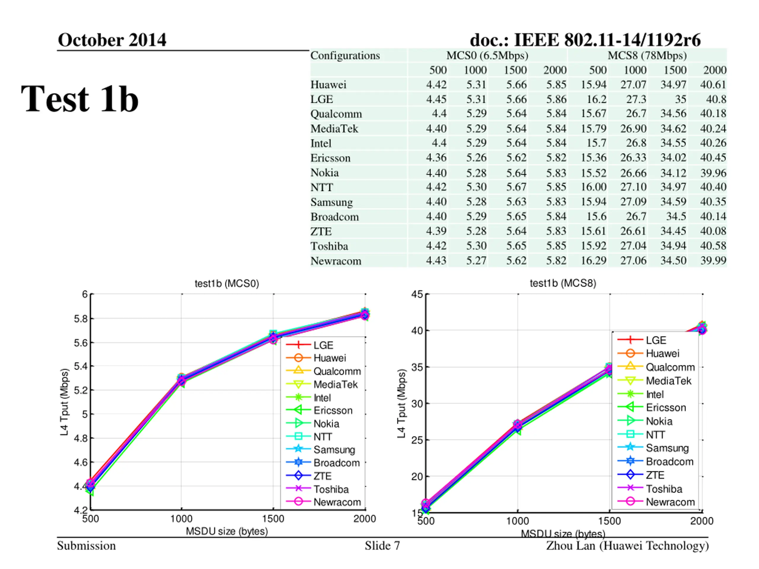 AP1 October 2014 doc.: IEEE 802.11-14/1192r6 MCS0 (6.5Mbps) 500 1000 1500 2000 4.79 5.55 5.84 6.00 4.81 5.55 5.84 5.99 4.76 5.53 5.82 5.98 4.76 5.53 5.82 5.98 4.76 5.53 5.82 5.98 4.75 5.52 5.82 5.97 4.76 5.52 5.83 5.97 4.79 5.54 5.84 6.00 4.76 5.53 5.82 5.97 4.76 5.53 5.83 5.98 4.76 5.53 5.82 5.98 4.79 5.54 5.83 5.99 4.85 5.55 5.84 5.99 Configurations MCS8 (78Mbps) 1000 21.98 34.91 22.4 35.2 21.45 34.26 21.71 34.65 21.53 34.46 21.53 34.47 21.19 34.22 22.00 35.00 21.54 34.48 21.4 34.2 21.42 34.23 21.94 34.87 23.8 36.64 500 1500 43.24 43.25 42.57 42.71 42.58 42.57 41.93 43.20 42.60 42.5 42.55 43.19 43.87 2000 48.67 48.9 48.02 48.15 48.14 48.09 47.74 48.40 48.15 48.0 48.01 48.62 49.73 Test 1a Huawei LGE Qualcomm MediaTek Intel Ericsson Nokia NTT Samsung Broadcom ZTE Toshiba Newracom test1a (MCS8) test1a (MCS0) 50 5.9 45 LGE Huawei Qualcomm MediaTek Intel Ericsson Nokia NTT Samsung Broadcom ZTE Toshiba Newracom 5.7 LGE Huawei Qualcomm MediaTek Intel Ericsson Nokia NTT Samsung Broadcom ZTE Toshiba Newracom 40 5.5 L4 Tput (Mbps) L4 Tput (Mbps) 5.3 35 5.1 30 4.9 25 4.7 4.5 20 500 1000 1500 2000 500 1000 1500 2000 MSDU size (bytes) MSDU size (bytes) Submission Slide 6 Zhou Lan (Huawei Technology)