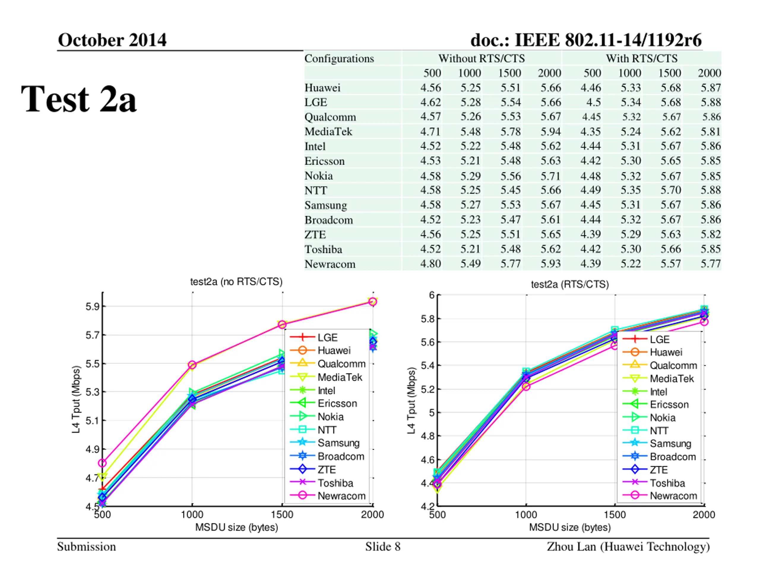 AP1 October 2014 doc.: IEEE 802.11-14/1192r6 MCS0 (6.5Mbps) 500 1000 1500 2000 4.42 5.31 5.66 5.85 4.45 5.31 5.66 5.86 4.4 5.29 5.64 5.84 4.40 5.29 5.64 5.84 4.4 5.29 5.64 5.84 4.36 5.26 5.62 5.82 4.40 5.28 5.64 5.83 4.42 5.30 5.67 5.85 4.40 5.28 5.63 5.83 4.40 5.29 5.65 5.84 4.39 5.28 5.64 5.83 4.42 5.30 5.65 5.85 4.43 5.27 5.62 5.82 Configurations MCS8 (78Mbps) 1000 15.94 27.07 16.2 27.3 15.67 26.7 15.79 26.90 15.7 26.8 15.36 26.33 15.52 26.66 16.00 27.10 15.94 27.09 15.6 26.7 15.61 26.61 15.92 27.04 16.29 27.06 500 1500 34.97 2000 40.61 40.8 40.18 40.24 40.26 40.45 39.96 40.40 40.35 40.14 40.08 40.58 39.99 Test 1b Huawei LGE Qualcomm MediaTek Intel Ericsson Nokia NTT Samsung Broadcom ZTE Toshiba Newracom 35 34.56 34.62 34.55 34.02 34.12 34.97 34.59 34.5 34.45 34.94 34.50 test1b (MCS8) test1b (MCS0) 45 6 5.8 40 LGE Huawei Qualcomm MediaTek Intel Ericsson Nokia NTT Samsung Broadcom ZTE Toshiba Newracom 5.6 LGE Huawei Qualcomm MediaTek Intel Ericsson Nokia NTT Samsung Broadcom ZTE Toshiba Newracom 5.4 35 L4 Tput (Mbps) L4 Tput (Mbps) 5.2 30 5 4.8 25 4.6 20 4.4 4.2 15 500 1000 1500 2000 500 1000 1500 2000 MSDU size (bytes) MSDU size (bytes) Submission Slide 7 Zhou Lan (Huawei Technology)