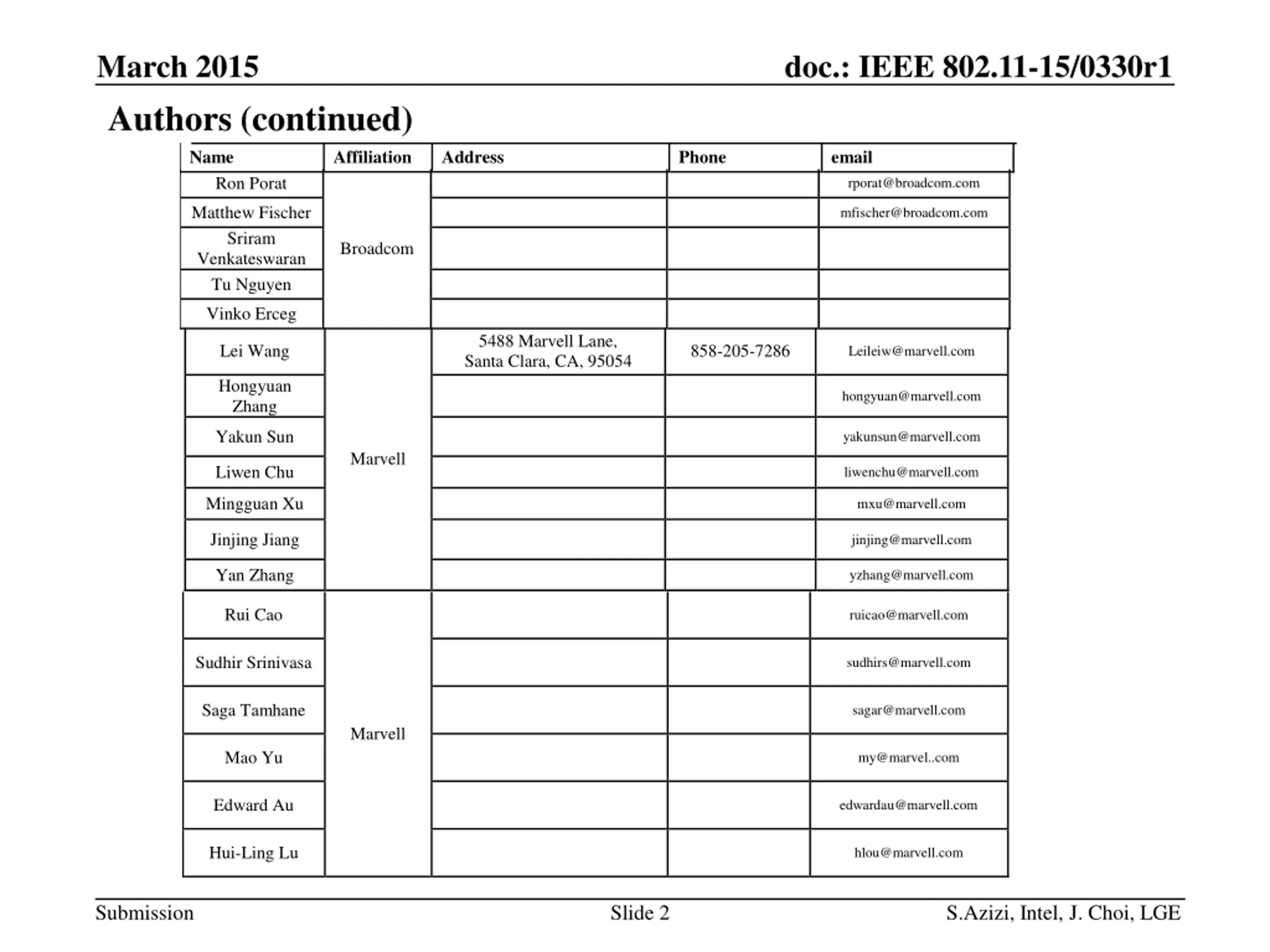 March 2015 doc.: IEEE 802.11-15/0330r1 Authors (continued) Name Ron Porat Matthew Fischer Sriram Venkateswaran Tu Nguyen Affiliation Address Phone email rporat@broadcom.com mfischer@broadcom.com Broadcom Vinko Erceg 5488 Marvell Lane, Santa Clara, CA, 95054 Lei Wang 858-205-7286 Leileiw@marvell.com Hongyuan Zhang hongyuan@marvell.com Yakun Sun yakunsun@marvell.com Marvell Liwen Chu liwenchu@marvell.com Mingguan Xu mxu@marvell.com Jinjing Jiang jinjing@marvell.com Yan Zhang yzhang@marvell.com Rui Cao ruicao@marvell.com Sudhir Srinivasa sudhirs@marvell.com Saga Tamhane sagar@marvell.com Marvell Mao Yu my@marvel..com Edward Au edwardau@marvell.com Hui-Ling Lu hlou@marvell.com Submission Slide 2 S.Azizi, Intel, J. Choi, LGE