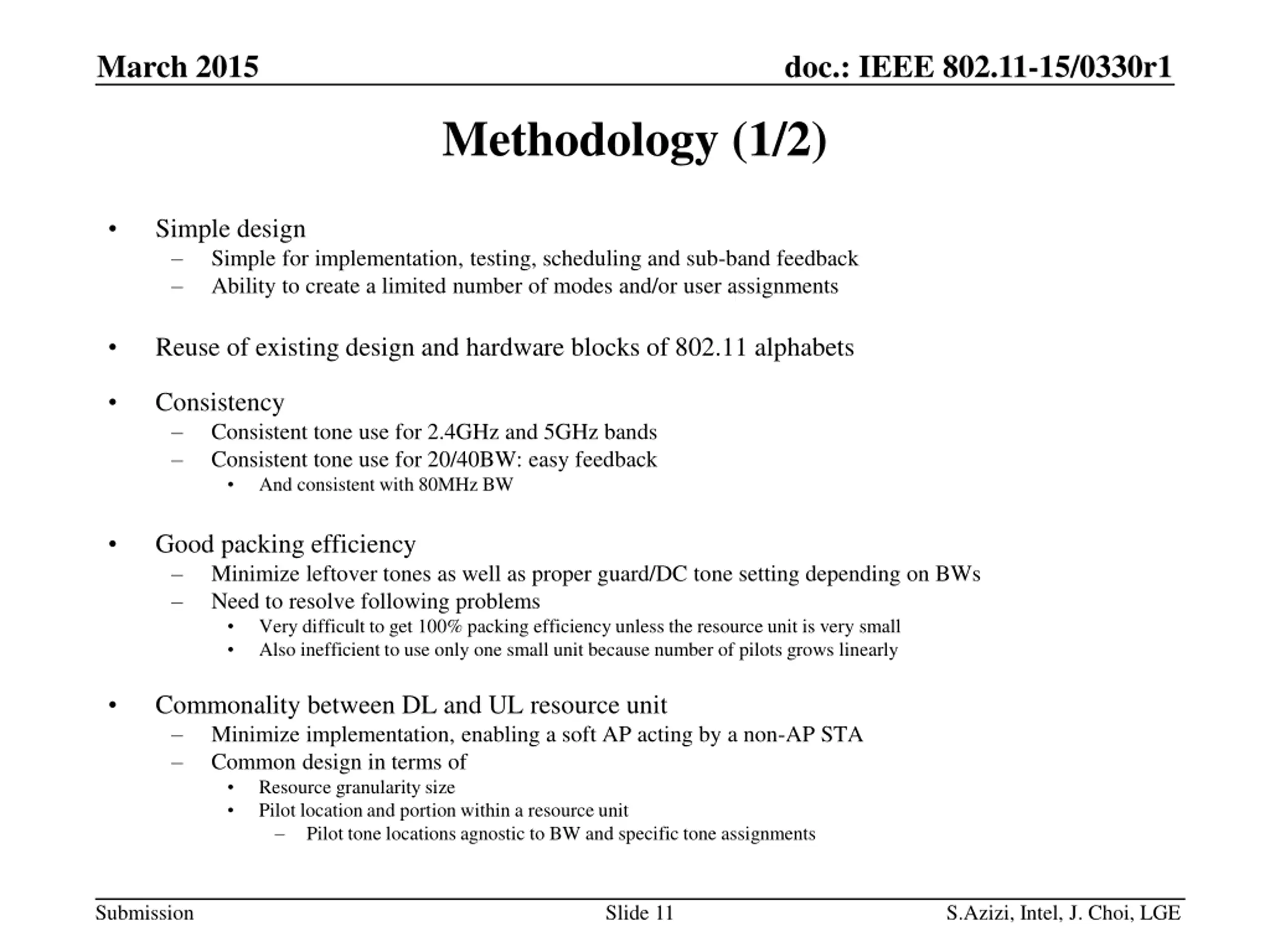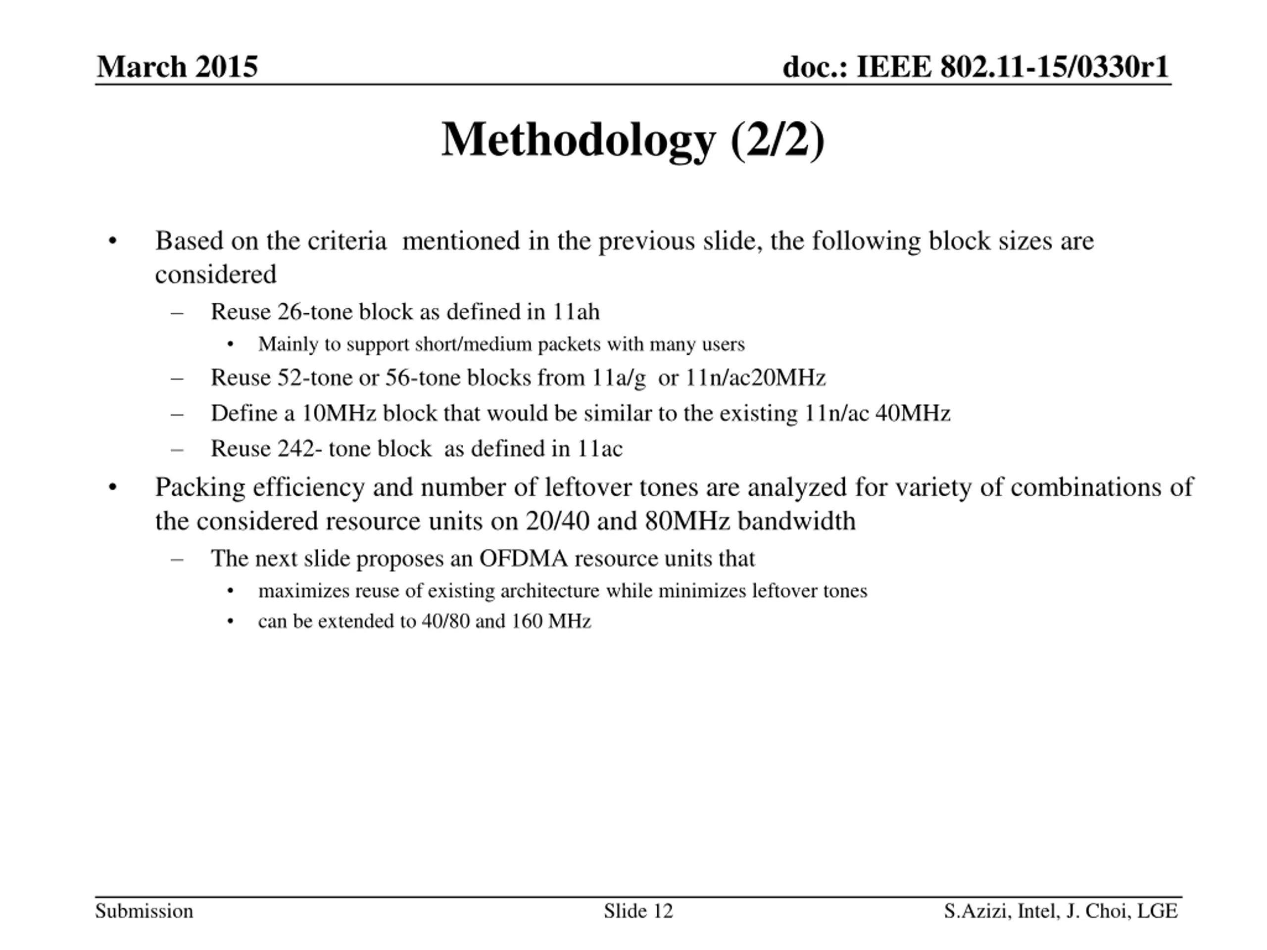 March 2015 doc.: IEEE 802.11-15/0330r1 Methodology (1/2) Simple design Simple for implementation, testing, scheduling and sub-band feedback Ability to create a limited number of modes and/or user assignments Reuse of existing design and hardware blocks of 802.11 alphabets Consistency Consistent tone use for 2.4GHz and 5GHz bands Consistent tone use for 20/40BW: easy feedback And consistent with 80MHz BW Good packing efficiency Minimize leftover tones as well as proper guard/DC tone setting depending on BWs Need to resolve following problems Very difficult to get 100% packing efficiency unless the resource unit is very small Also inefficient to use only one small unit because number of pilots grows linearly Commonality between DL and UL resource unit Minimize implementation, enabling a soft AP acting by a non-AP STA Common design in terms of Resource granularity size Pilot location and portion within a resource unit Pilot tone locations agnostic to BW and specific tone assignments Submission Slide 11 S.Azizi, Intel, J. Choi, LGE