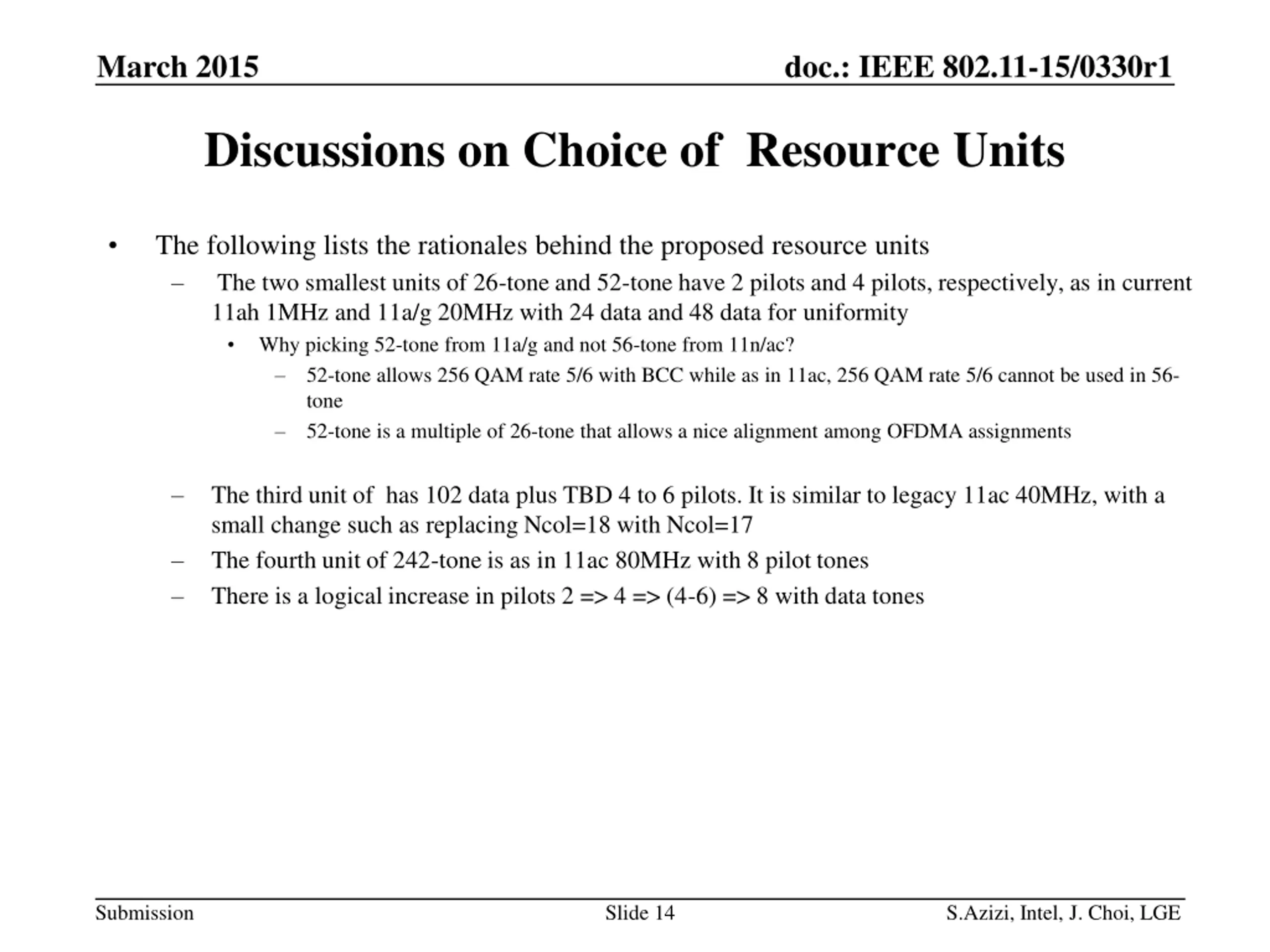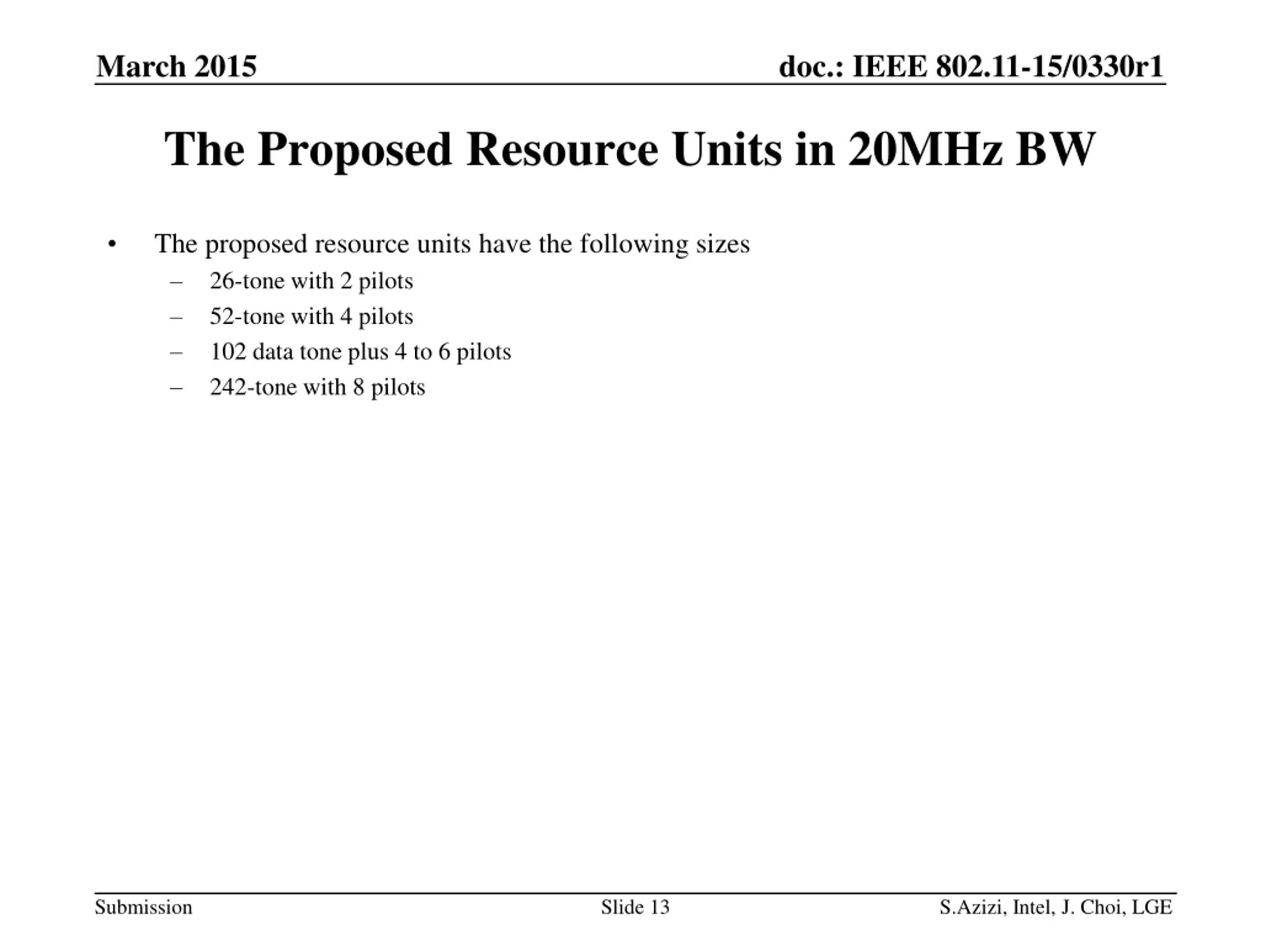 March 2015 doc.: IEEE 802.11-15/0330r1 The Proposed Resource Units in 20MHz BW The proposed resource units have the following sizes 26-tone with 2 pilots 52-tone with 4 pilots 102 data tone plus 4 to 6 pilots 242-tone with 8 pilots Submission Slide 13 S.Azizi, Intel, J. Choi, LGE
