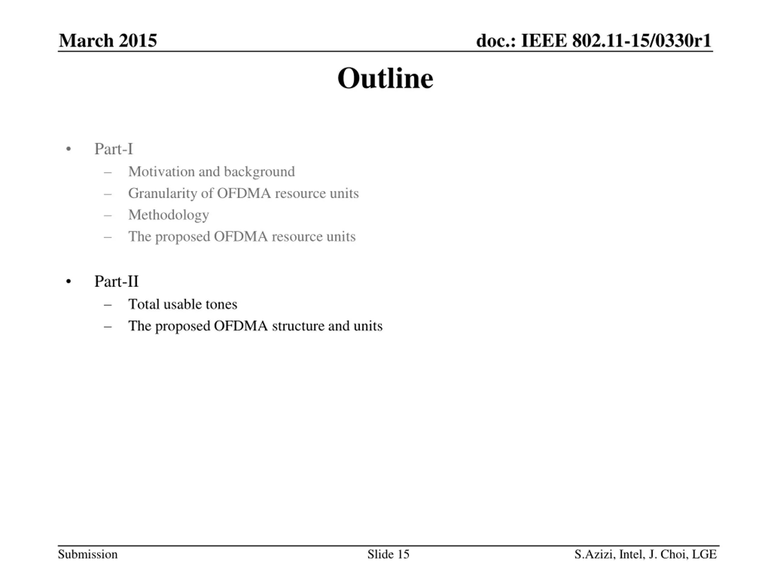 March 2015 doc.: IEEE 802.11-15/0330r1 Outline Part-I Motivation and background Granularity of OFDMA resource units Methodology The proposed OFDMA resource units Part-II Total usable tones The proposed OFDMA structure and units Submission Slide 15 S.Azizi, Intel, J. Choi, LGE