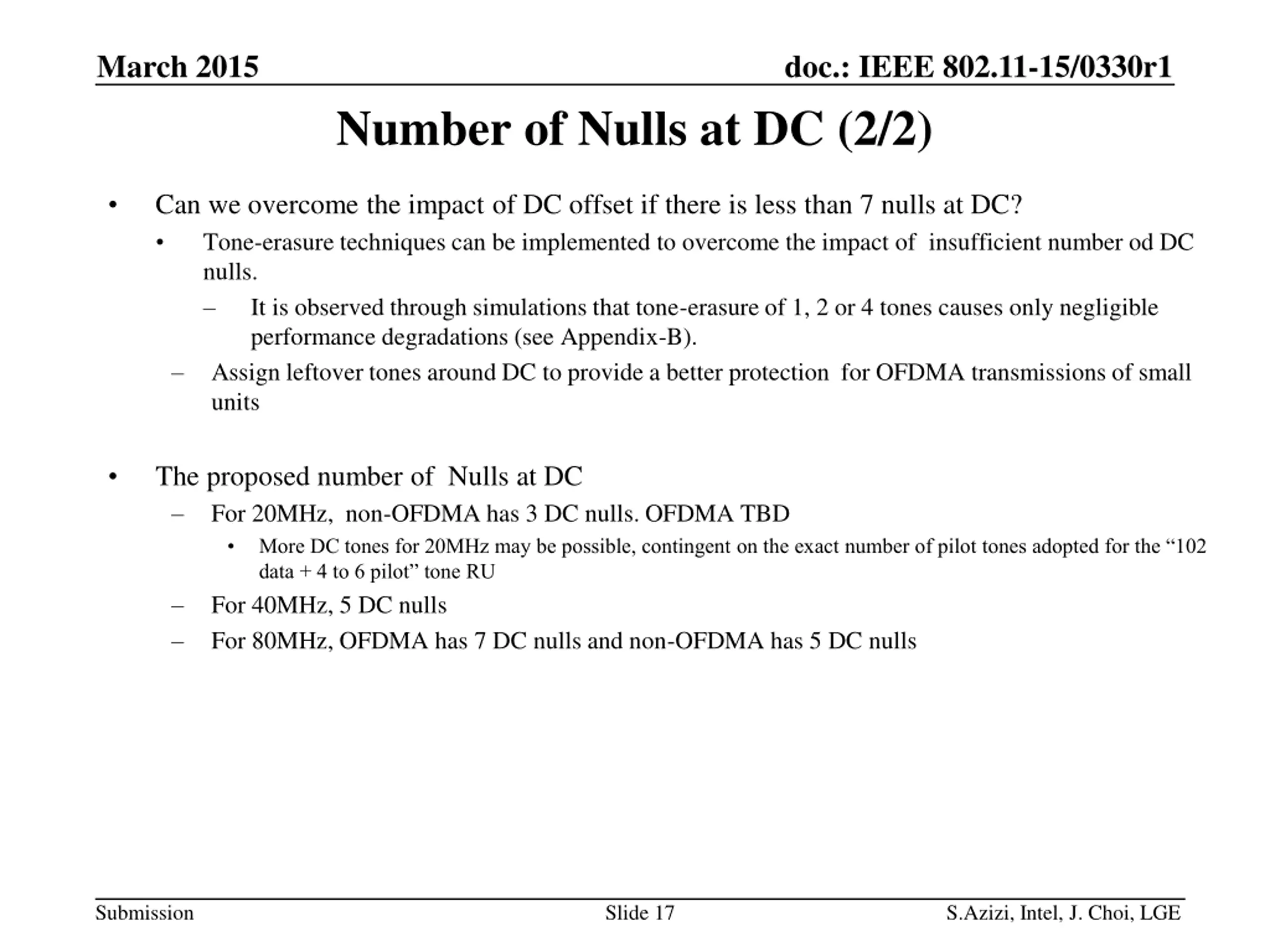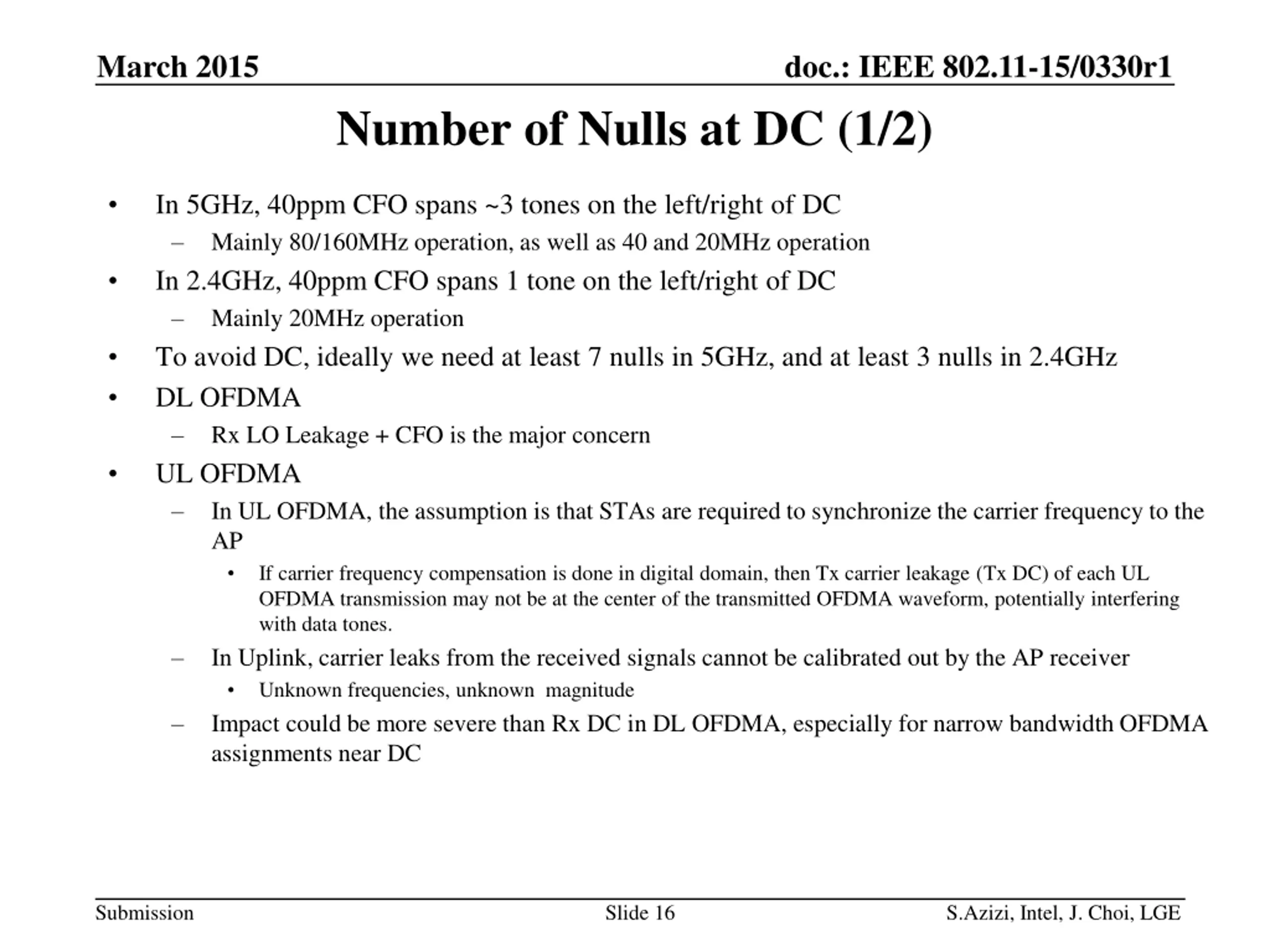 March 2015 doc.: IEEE 802.11-15/0330r1 Number of Nulls at DC (1/2) In 5GHz, 40ppm CFO spans ~3 tones on the left/right of DC Mainly 80/160MHz operation, as well as 40 and 20MHz operation In 2.4GHz, 40ppm CFO spans 1 tone on the left/right of DC Mainly 20MHz operation To avoid DC, ideally we need at least 7 nulls in 5GHz, and at least 3 nulls in 2.4GHz DL OFDMA Rx LO Leakage + CFO is the major concern UL OFDMA In UL OFDMA, the assumption is that STAs are required to synchronize the carrier frequency to the AP If carrier frequency compensation is done in digital domain, then Tx carrier leakage (Tx DC) of each UL OFDMA transmission may not be at the center of the transmitted OFDMA waveform, potentially interfering with data tones. In Uplink, carrier leaks from the received signals cannot be calibrated out by the AP receiver Unknown frequencies, unknown magnitude Impact could be more severe than Rx DC in DL OFDMA, especially for narrow bandwidth OFDMA assignments near DC Submission Slide 16 S.Azizi, Intel, J. Choi, LGE