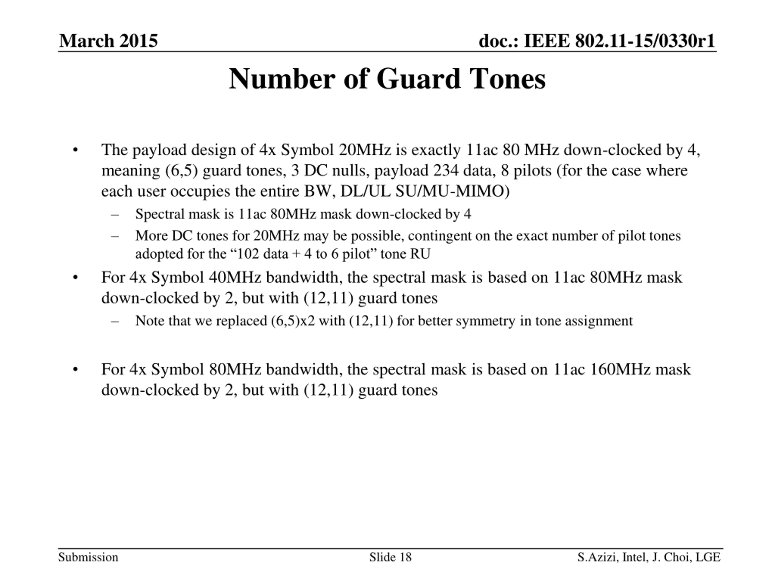 March 2015 doc.: IEEE 802.11-15/0330r1 Number of Guard Tones The payload design of 4x Symbol 20MHz is exactly 11ac 80 MHz down-clocked by 4, meaning (6,5) guard tones, 3 DC nulls, payload 234 data, 8 pilots (for the case where each user occupies the entire BW, DL/UL SU/MU-MIMO) Spectral mask is 11ac 80MHz mask down-clocked by 4 More DC tones for 20MHz may be possible, contingent on the exact number of pilot tones adopted for the 102 data + 4 to 6 pilot tone RU For 4x Symbol 40MHz bandwidth, the spectral mask is based on 11ac 80MHz mask down-clocked by 2, but with (12,11) guard tones Note that we replaced (6,5)x2 with (12,11) for better symmetry in tone assignment For 4x Symbol 80MHz bandwidth, the spectral mask is based on 11ac 160MHz mask down-clocked by 2, but with (12,11) guard tones Submission Slide 18 S.Azizi, Intel, J. Choi, LGE