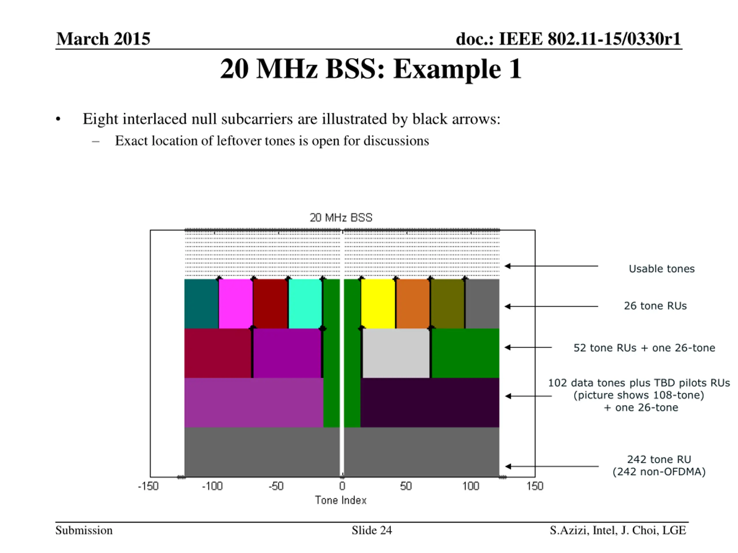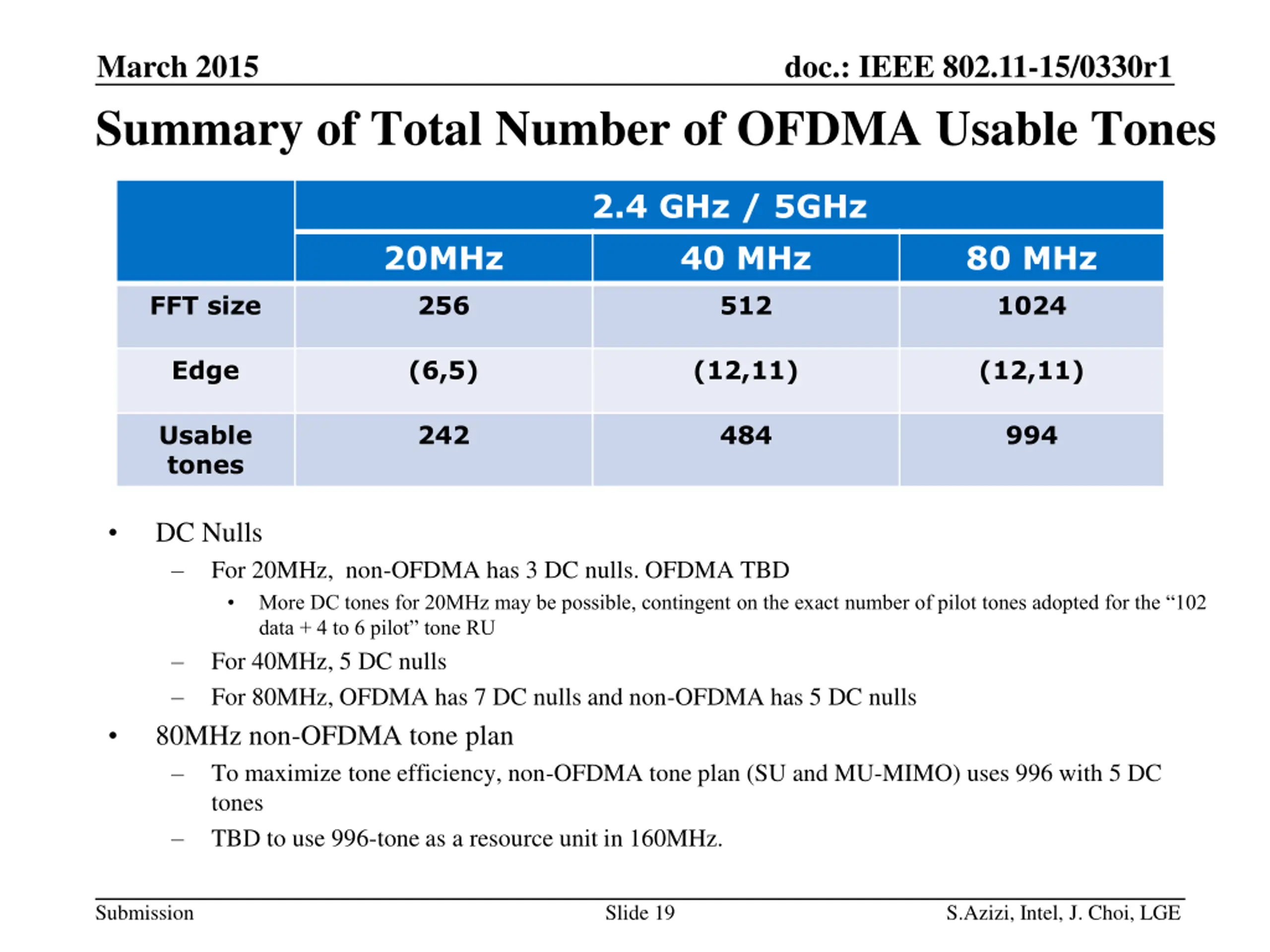 March 2015 doc.: IEEE 802.11-15/0330r1 Summary of Total Number of OFDMA Usable Tones 2.4 GHz / 5GHz 40 MHz 20MHz 80 MHz FFT size 256 512 1024 Edge (6,5) (12,11) (12,11) Usable tones 242 484 994 DC Nulls For 20MHz, non-OFDMA has 3 DC nulls. OFDMA TBD More DC tones for 20MHz may be possible, contingent on the exact number of pilot tones adopted for the 102 data + 4 to 6 pilot tone RU For 40MHz, 5 DC nulls For 80MHz, OFDMA has 7 DC nulls and non-OFDMA has 5 DC nulls 80MHz non-OFDMA tone plan To maximize tone efficiency, non-OFDMA tone plan (SU and MU-MIMO) uses 996 with 5 DC tones TBD to use 996-tone as a resource unit in 160MHz. Submission Slide 19 S.Azizi, Intel, J. Choi, LGE