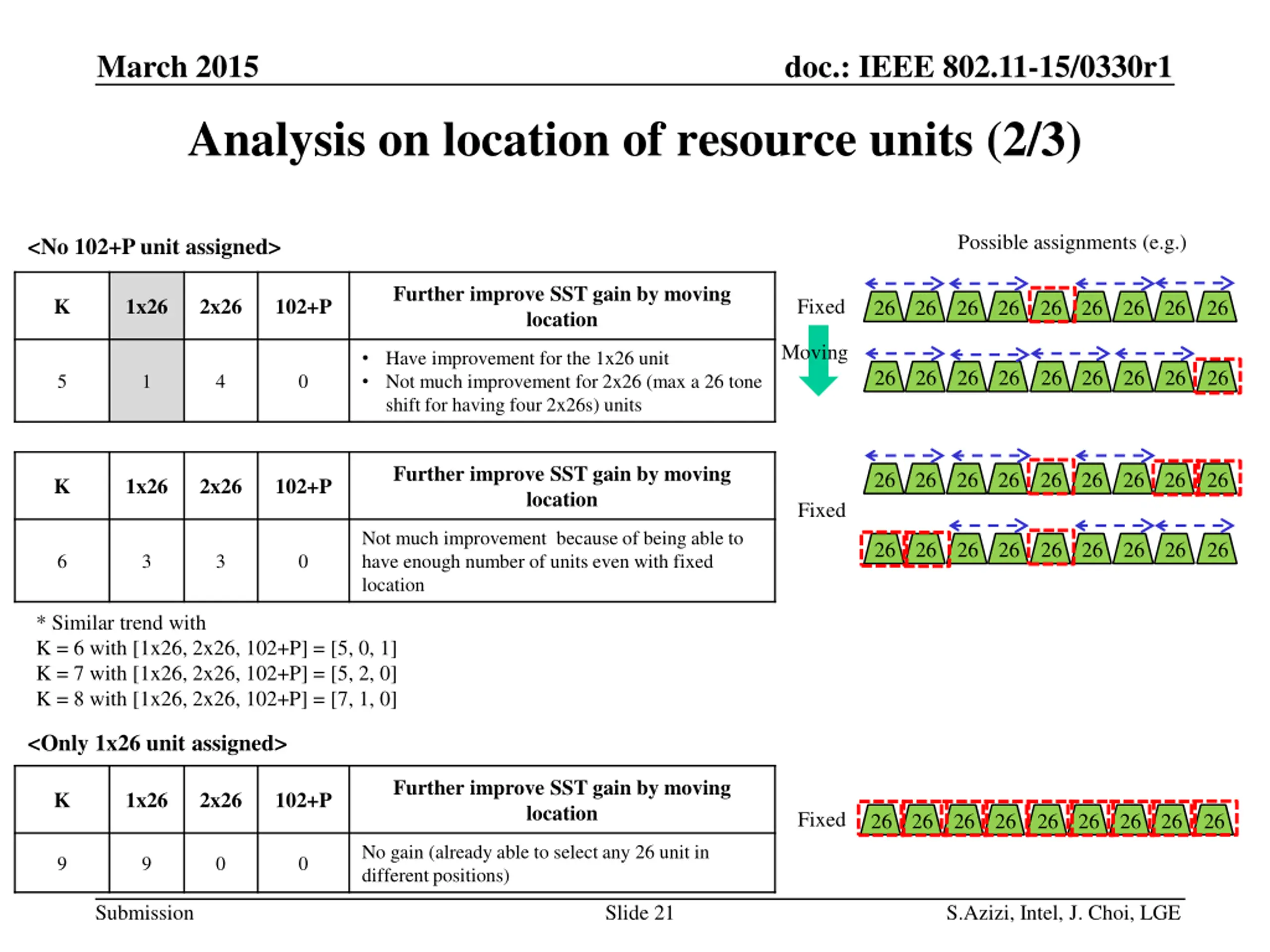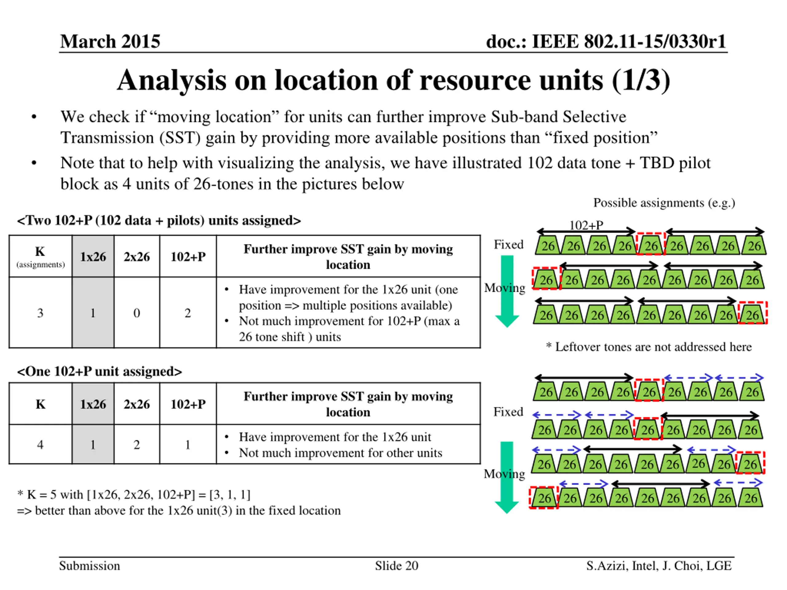 March 2015 doc.: IEEE 802.11-15/0330r1 Analysis on location of resource units (1/3) We check if moving location for units can further improve Sub-band Selective Transmission (SST) gain by providing more available positions than fixed position Note that to help with visualizing the analysis, we have illustrated 102 data tone + TBD pilot block as 4 units of 26-tones in the pictures below Possible assignments (e.g.) <Two 102+P (102 data + pilots) units assigned> 102+P Fixed 26 26 26 26 26 26 26 26 26 Further improve SST gain by moving location K 1x26 2x26 102+P (assignments) 26 26 26 26 26 26 26 26 26 Moving Have improvement for the 1x26 unit (one position => multiple positions available) Not much improvement for 102+P (max a 26 tone shift ) units 3 1 0 2 26 26 26 26 26 26 26 26 26 * Leftover tones are not addressed here <One 102+P unit assigned> 26 26 26 26 26 26 26 26 26 Further improve SST gain by moving location K 1x26 2x26 102+P Fixed 26 26 26 26 26 26 26 26 26 Have improvement for the 1x26 unit Not much improvement for other units 4 1 2 1 26 26 26 26 26 26 26 26 26 Moving * K = 5 with [1x26, 2x26, 102+P] = [3, 1, 1] => better than above for the 1x26 unit(3) in the fixed location 26 26 26 26 26 26 26 26 26 Submission Slide 20 S.Azizi, Intel, J. Choi, LGE