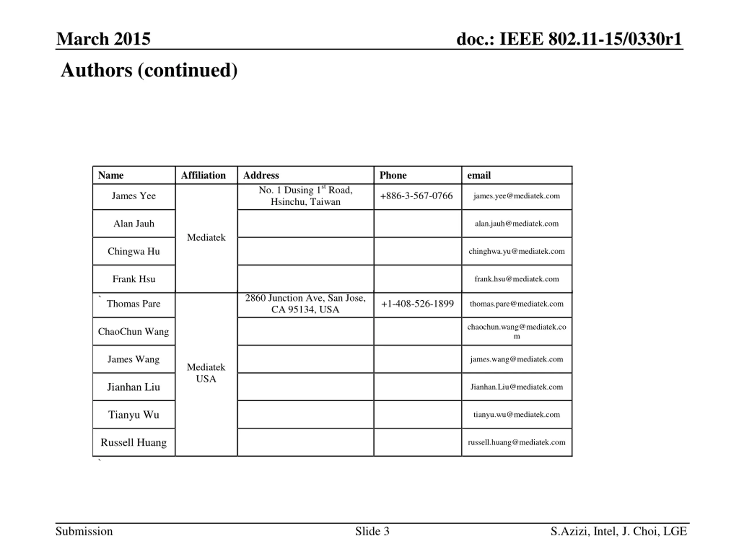 March 2015 doc.: IEEE 802.11-15/0330r1 Authors (continued) Name Affiliation Address Phone email No. 1 Dusing 1st Road, Hsinchu, Taiwan James Yee +886-3-567-0766 james.yee@mediatek.com Alan Jauh alan.jauh@mediatek.com Mediatek Chingwa Hu chinghwa.yu@mediatek.com Frank Hsu frank.hsu@mediatek.com 2860 Junction Ave, San Jose, CA 95134, USA `Thomas Pare +1-408-526-1899 thomas.pare@mediatek.com chaochun.wang@mediatek.co m ChaoChun Wang James Wang james.wang@mediatek.com Mediatek USA Jianhan Liu Jianhan.Liu@mediatek.com Tianyu Wu tianyu.wu@mediatek.com Russell Huang russell.huang@mediatek.com ` Submission Slide 3 S.Azizi, Intel, J. Choi, LGE