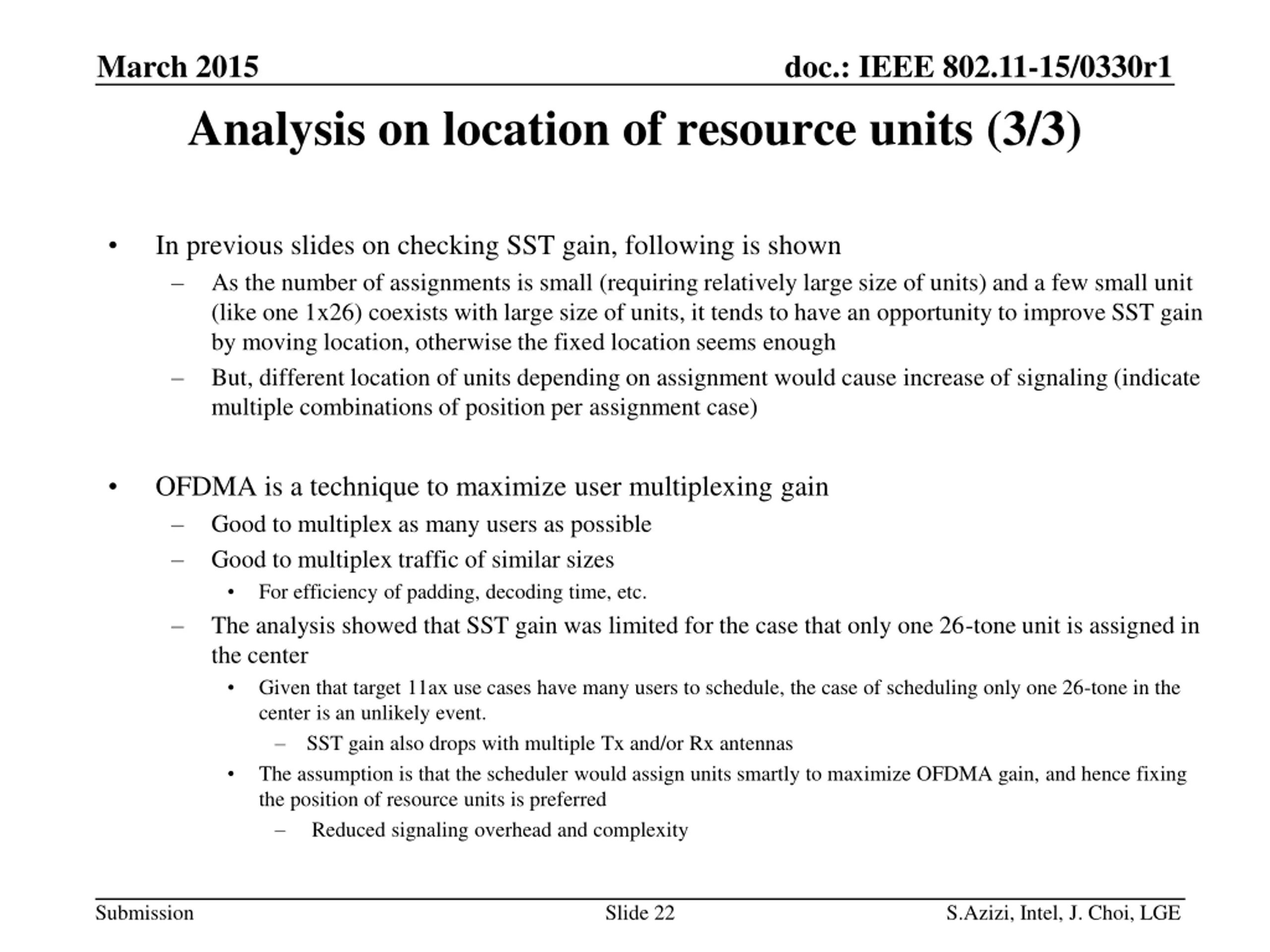March 2015 doc.: IEEE 802.11-15/0330r1 Analysis on location of resource units (3/3) In previous slides on checking SST gain, following is shown As the number of assignments is small (requiring relatively large size of units) and a few small unit (like one 1x26) coexists with large size of units, it tends to have an opportunity to improve SST gain by moving location, otherwise the fixed location seems enough But, different location of units depending on assignment would cause increase of signaling (indicate multiple combinations of position per assignment case) OFDMA is a technique to maximize user multiplexing gain Good to multiplex as many users as possible Good to multiplex traffic of similar sizes For efficiency of padding, decoding time, etc. The analysis showed that SST gain was limited for the case that only one 26-tone unit is assigned in the center Given that target 11ax use cases have many users to schedule, the case of scheduling only one 26-tone in the center is an unlikely event. SST gain also drops with multiple Tx and/or Rx antennas The assumption is that the scheduler would assign units smartly to maximize OFDMA gain, and hence fixing the position of resource units is preferred Reduced signaling overhead and complexity Submission Slide 22 S.Azizi, Intel, J. Choi, LGE