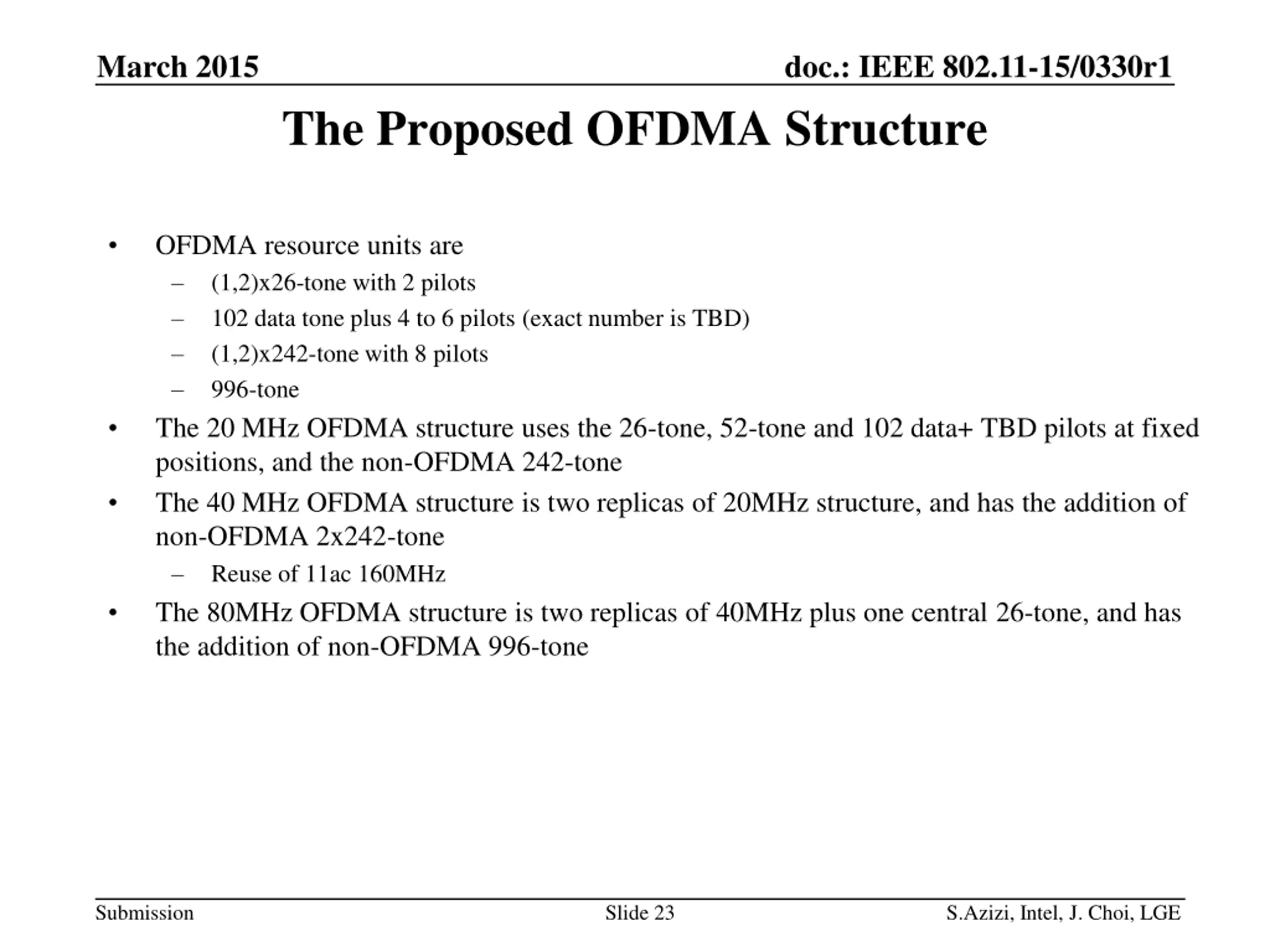 March 2015 doc.: IEEE 802.11-15/0330r1 The Proposed OFDMA Structure OFDMA resource units are (1,2)x26-tone with 2 pilots 102 data tone plus 4 to 6 pilots (exact number is TBD) (1,2)x242-tone with 8 pilots 996-tone The 20 MHz OFDMA structure uses the 26-tone, 52-tone and 102 data+ TBD pilots at fixed positions, and the non-OFDMA 242-tone The 40 MHz OFDMA structure is two replicas of 20MHz structure, and has the addition of non-OFDMA 2x242-tone Reuse of 11ac 160MHz The 80MHz OFDMA structure is two replicas of 40MHz plus one central 26-tone, and has the addition of non-OFDMA 996-tone Submission Slide 23 S.Azizi, Intel, J. Choi, LGE