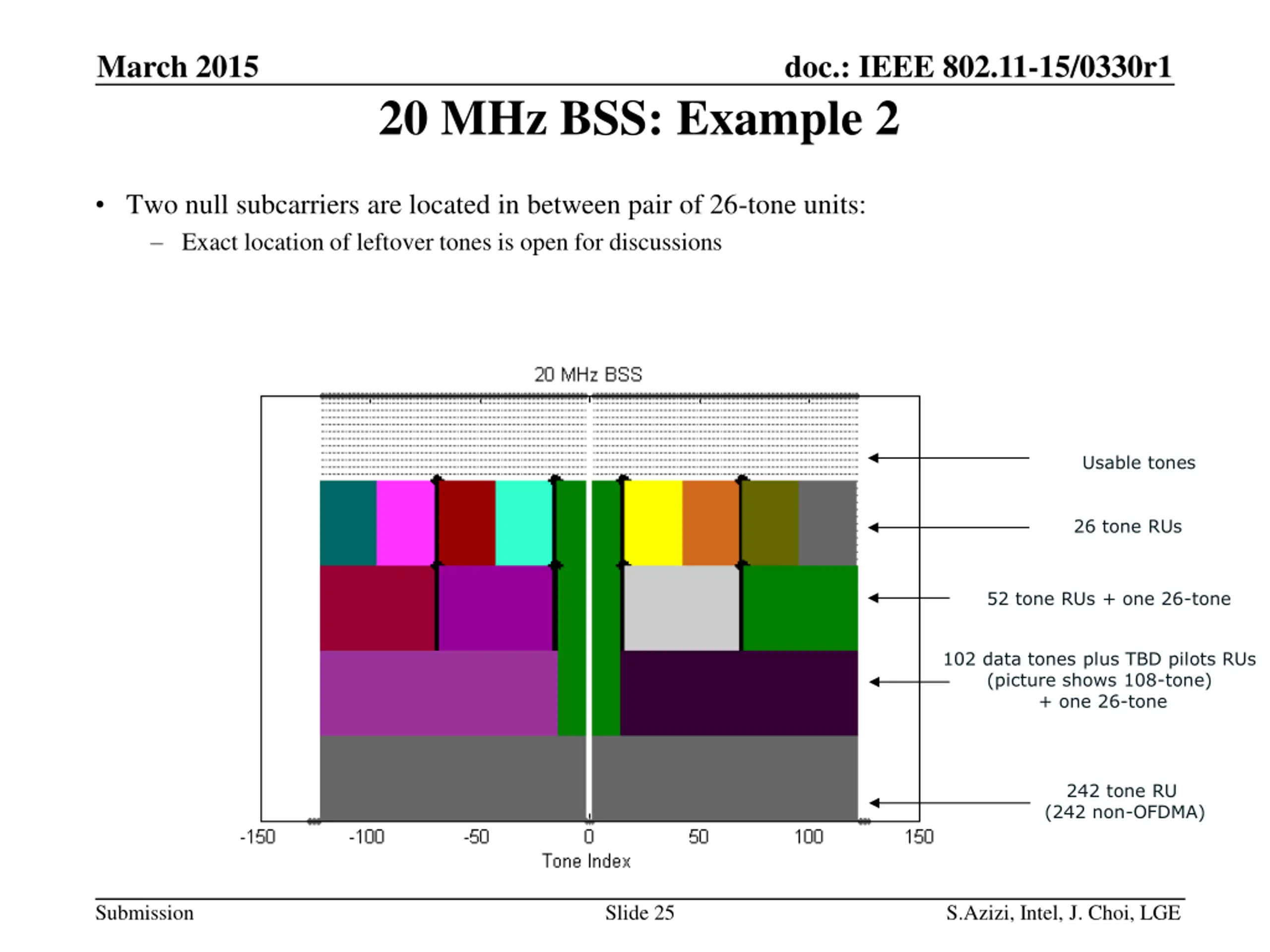 March 2015 doc.: IEEE 802.11-15/0330r1 20 MHz BSS: Example 1 Eight interlaced null subcarriers are illustrated by black arrows: Exact location of leftover tones is open for discussions Usable tones 26 tone RUs 52 tone RUs + one 26-tone 102 data tones plus TBD pilots RUs (picture shows 108-tone) + one 26-tone 242 tone RU (242 non-OFDMA) Submission Slide 24 S.Azizi, Intel, J. Choi, LGE