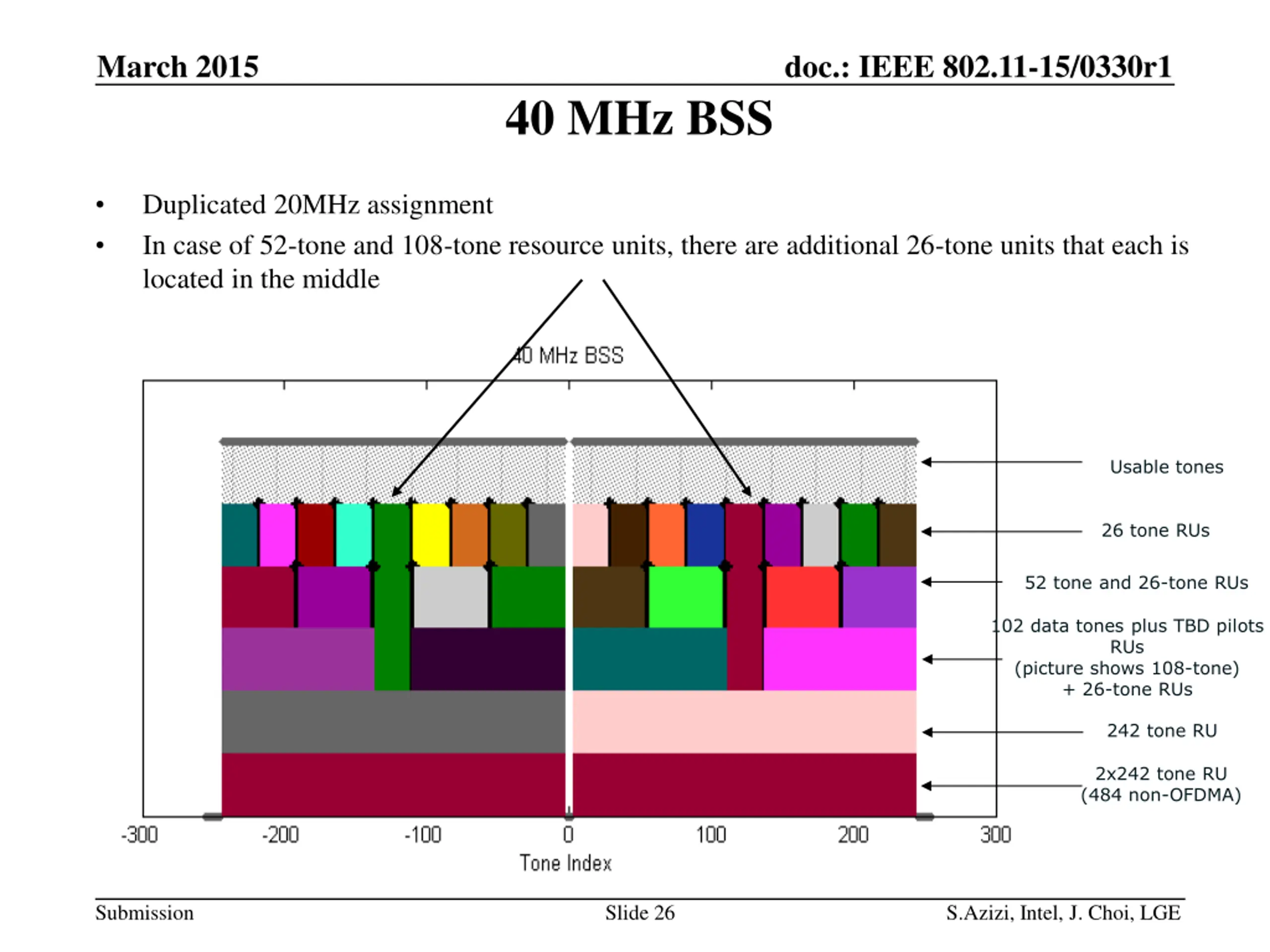 March 2015 doc.: IEEE 802.11-15/0330r1 20 MHz BSS: Example 2 Two null subcarriers are located in between pair of 26-tone units: Exact location of leftover tones is open for discussions Usable tones 26 tone RUs 52 tone RUs + one 26-tone 102 data tones plus TBD pilots RUs (picture shows 108-tone) + one 26-tone 242 tone RU (242 non-OFDMA) Submission Slide 25 S.Azizi, Intel, J. Choi, LGE