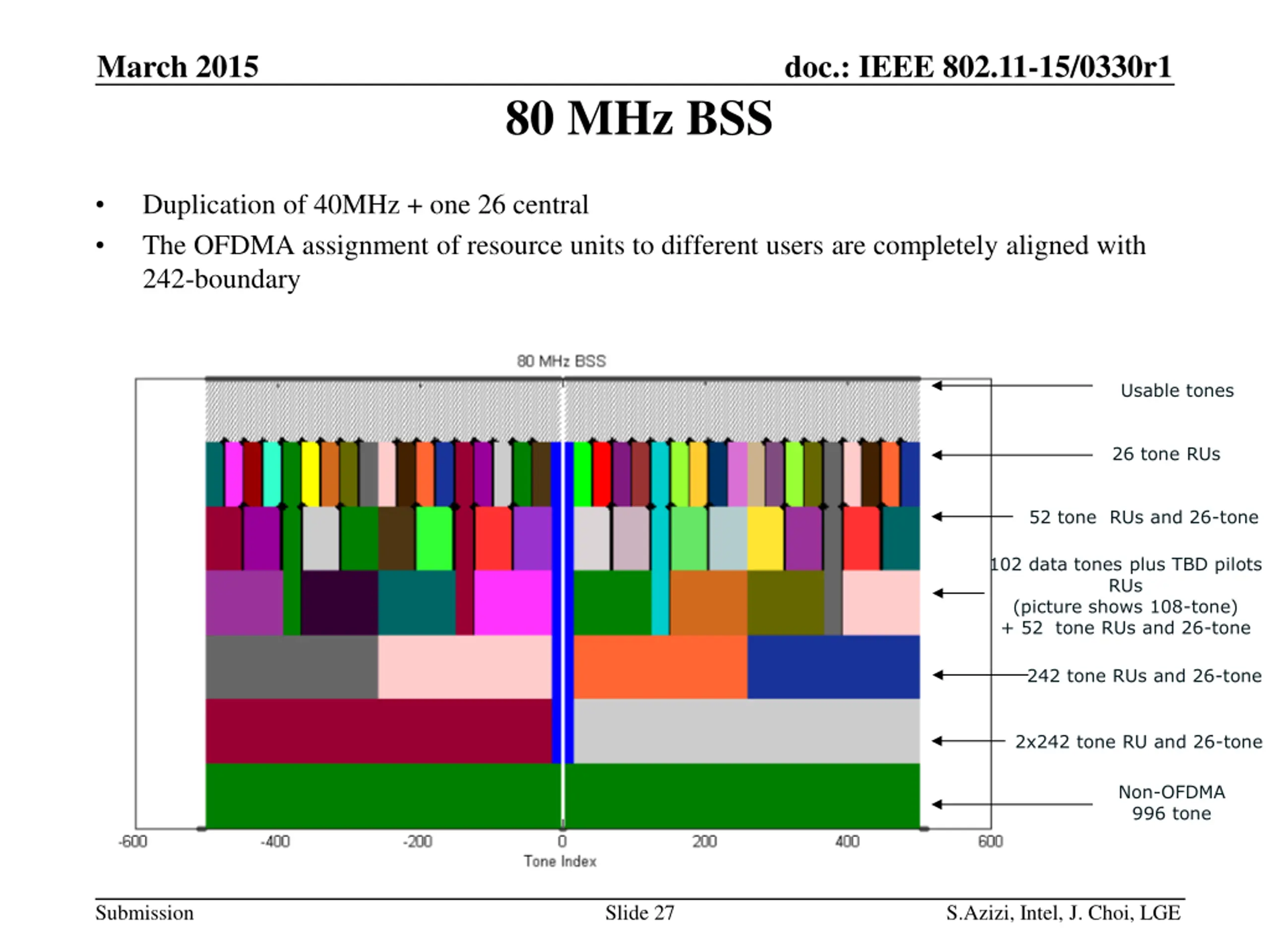 March 2015 doc.: IEEE 802.11-15/0330r1 40 MHz BSS Duplicated 20MHz assignment In case of 52-tone and 108-tone resource units, there are additional 26-tone units that each is located in the middle Usable tones 26 tone RUs 52 tone and 26-tone RUs 102 data tones plus TBD pilots RUs (picture shows 108-tone) + 26-tone RUs 242 tone RU 2x242 tone RU (484 non-OFDMA) Submission Slide 26 S.Azizi, Intel, J. Choi, LGE