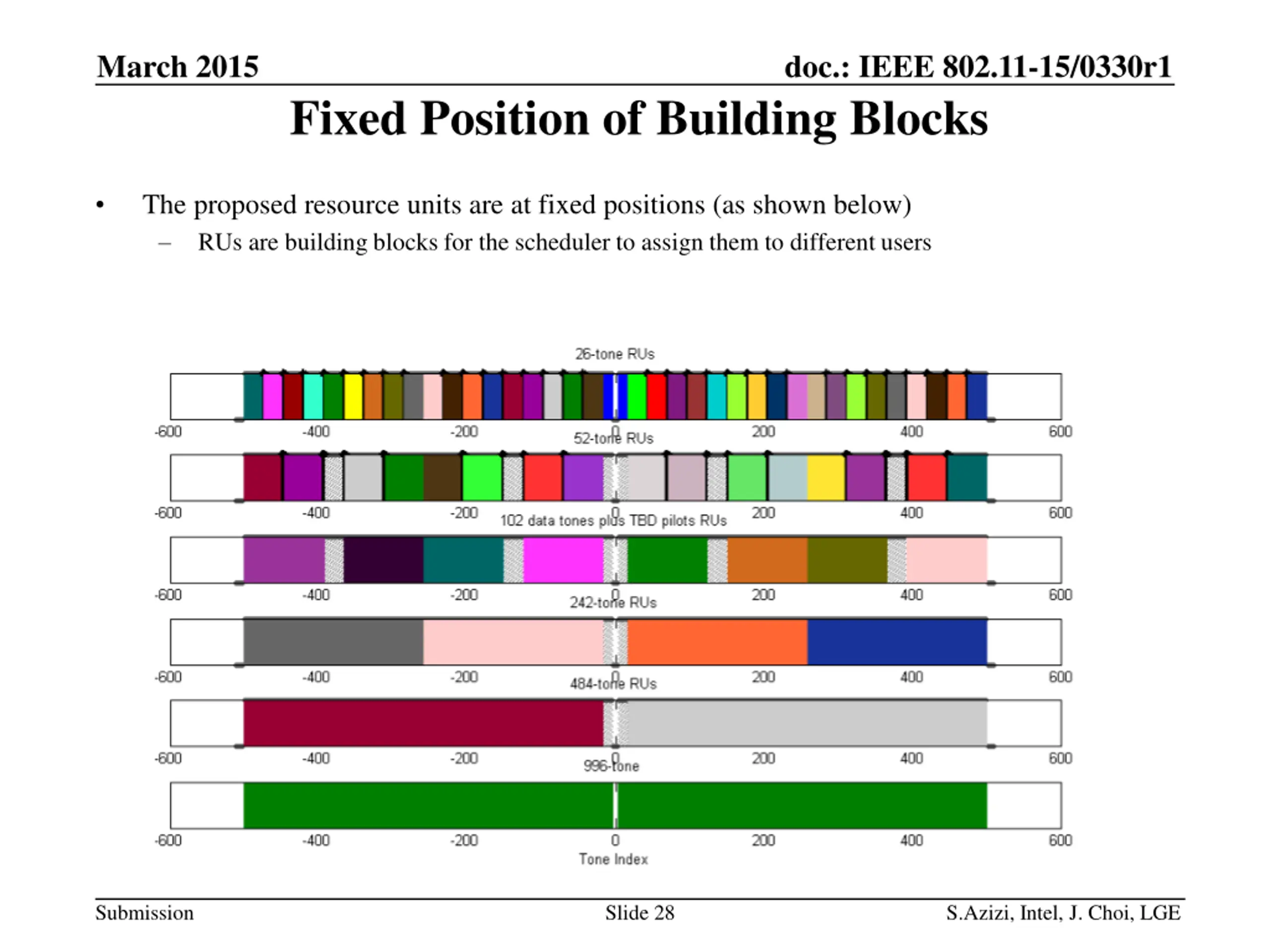 March 2015 doc.: IEEE 802.11-15/0330r1 Fixed Position of Building Blocks The proposed resource units are at fixed positions (as shown below) RUs are building blocks for the scheduler to assign them to different users Submission Slide 28 S.Azizi, Intel, J. Choi, LGE