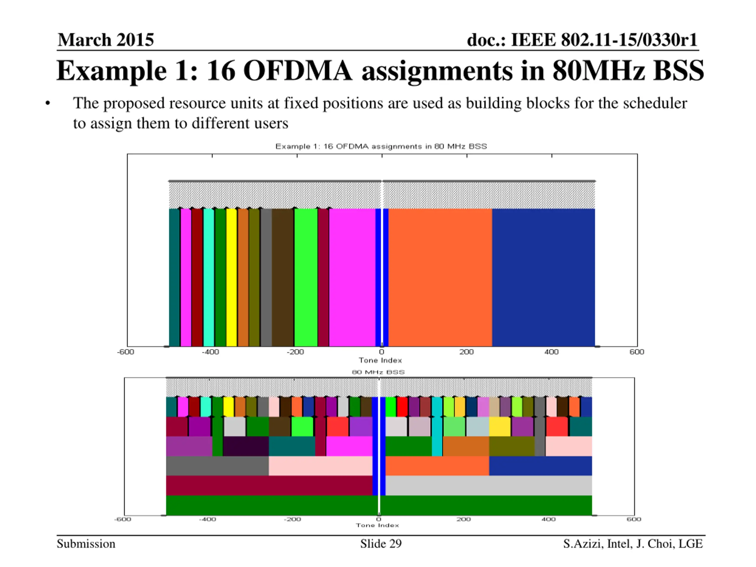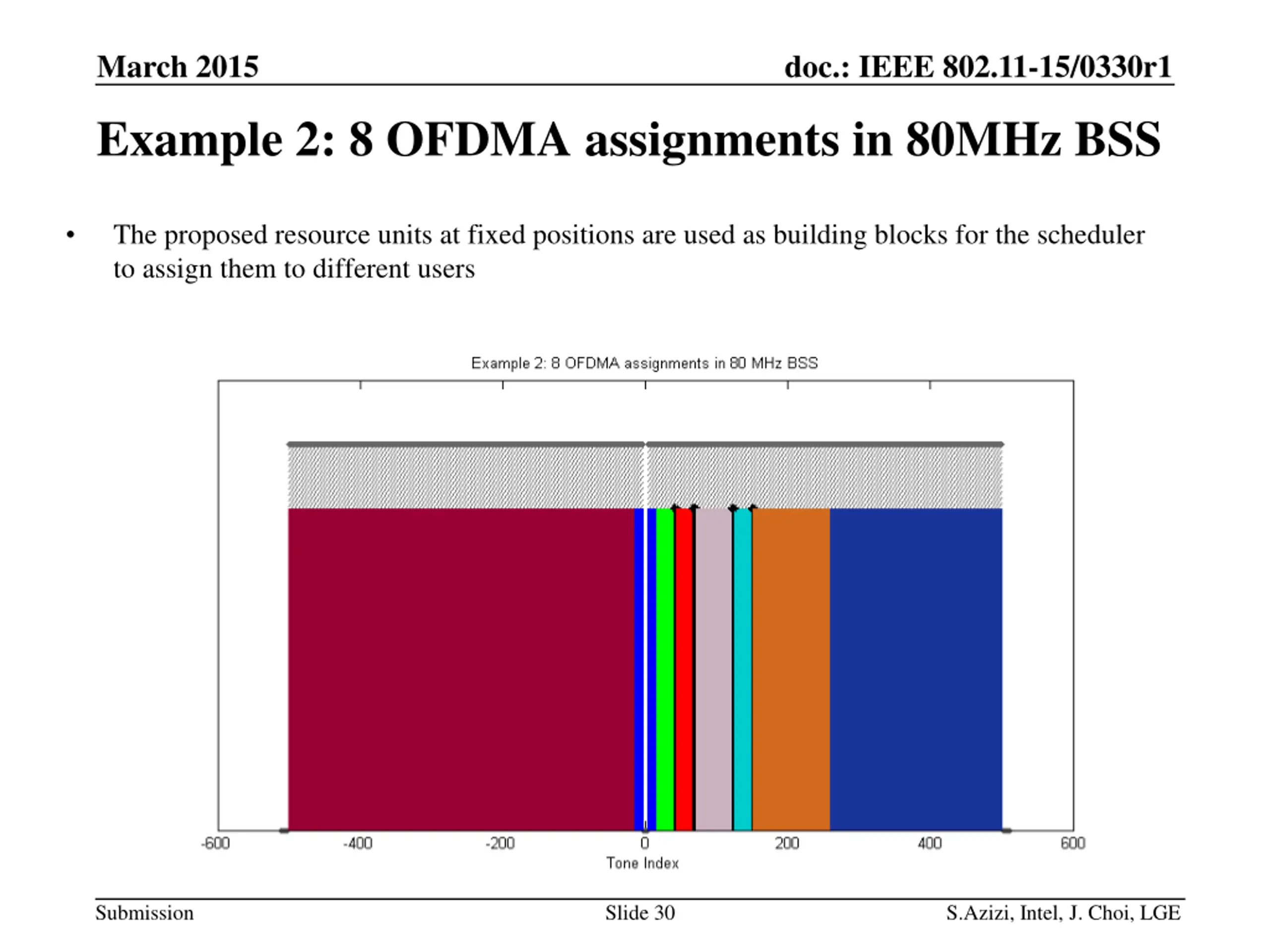 March 2015 doc.: IEEE 802.11-15/0330r1 Example 1: 16 OFDMA assignments in 80MHz BSS The proposed resource units at fixed positions are used as building blocks for the scheduler to assign them to different users Submission Slide 29 S.Azizi, Intel, J. Choi, LGE