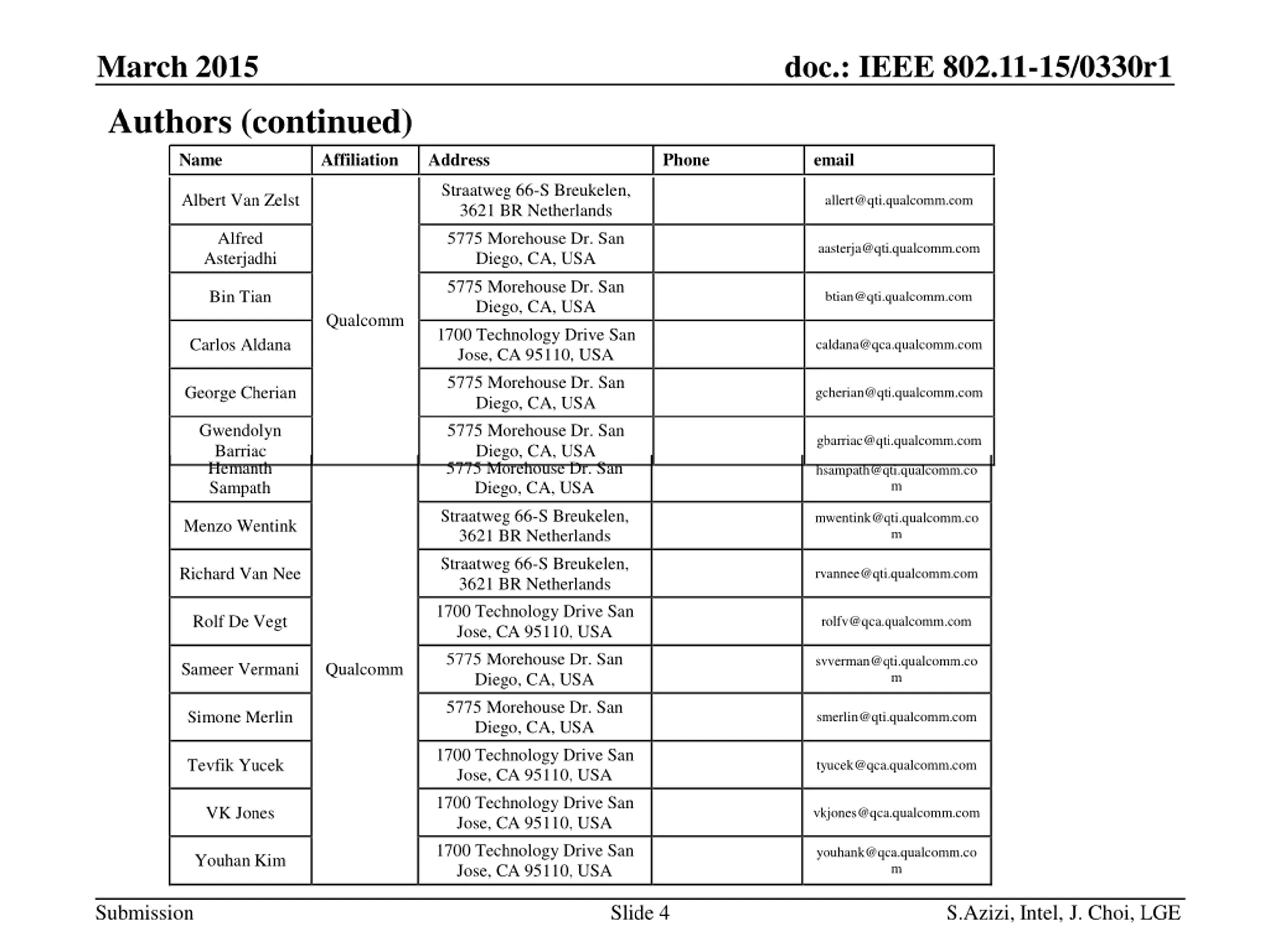 March 2015 doc.: IEEE 802.11-15/0330r1 Authors (continued) Name Albert Van Zelst Affiliation Address Phone email Straatweg 66-S Breukelen, 3621 BR Netherlands 5775 Morehouse Dr. San Diego, CA, USA 5775 Morehouse Dr. San Diego, CA, USA 1700 Technology Drive San Jose, CA 95110, USA 5775 Morehouse Dr. San Diego, CA, USA 5775 Morehouse Dr. San Diego, CA, USA 5775 Morehouse Dr. San Diego, CA, USA Straatweg 66-S Breukelen, 3621 BR Netherlands Straatweg 66-S Breukelen, 3621 BR Netherlands 1700 Technology Drive San Jose, CA 95110, USA 5775 Morehouse Dr. San Diego, CA, USA 5775 Morehouse Dr. San Diego, CA, USA 1700 Technology Drive San Jose, CA 95110, USA 1700 Technology Drive San Jose, CA 95110, USA 1700 Technology Drive San Jose, CA 95110, USA allert@qti.qualcomm.com Alfred Asterjadhi aasterja@qti.qualcomm.com Bin Tian btian@qti.qualcomm.com Qualcomm Carlos Aldana caldana@qca.qualcomm.com George Cherian gcherian@qti.qualcomm.com Gwendolyn Barriac Hemanth Sampath gbarriac@qti.qualcomm.com hsampath@qti.qualcomm.co m mwentink@qti.qualcomm.co m Menzo Wentink Richard Van Nee rvannee@qti.qualcomm.com Rolf De Vegt rolfv@qca.qualcomm.com svverman@qti.qualcomm.co m Sameer Vermani Qualcomm Simone Merlin smerlin@qti.qualcomm.com Tevfik Yucek tyucek@qca.qualcomm.com VK Jones vkjones@qca.qualcomm.com youhank@qca.qualcomm.co m Youhan Kim Submission Slide 4 S.Azizi, Intel, J. Choi, LGE