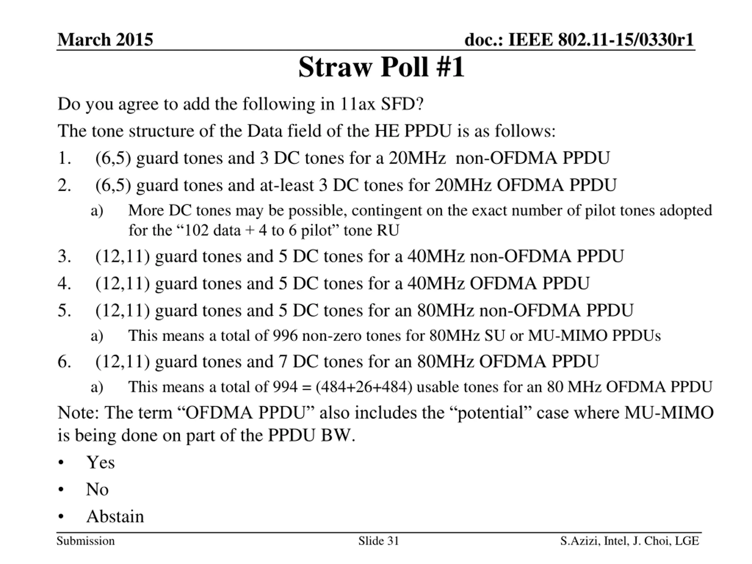 March 2015 doc.: IEEE 802.11-15/0330r1 Straw Poll #1 Do you agree to add the following in 11ax SFD? The tone structure of the Data field of the HE PPDU is as follows: 1. (6,5) guard tones and 3 DC tones for a 20MHz non-OFDMA PPDU 2. (6,5) guard tones and at-least 3 DC tones for 20MHz OFDMA PPDU a) More DC tones may be possible, contingent on the exact number of pilot tones adopted for the 102 data + 4 to 6 pilot tone RU 3. (12,11) guard tones and 5 DC tones for a 40MHz non-OFDMA PPDU 4. (12,11) guard tones and 5 DC tones for a 40MHz OFDMA PPDU 5. (12,11) guard tones and 5 DC tones for an 80MHz non-OFDMA PPDU a) This means a total of 996 non-zero tones for 80MHz SU or MU-MIMO PPDUs 6. (12,11) guard tones and 7 DC tones for an 80MHz OFDMA PPDU a) This means a total of 994 = (484+26+484) usable tones for an 80 MHz OFDMA PPDU Note: The term OFDMA PPDU also includes the potential case where MU-MIMO is being done on part of the PPDU BW. Yes No Abstain Submission Slide 31 S.Azizi, Intel, J. Choi, LGE