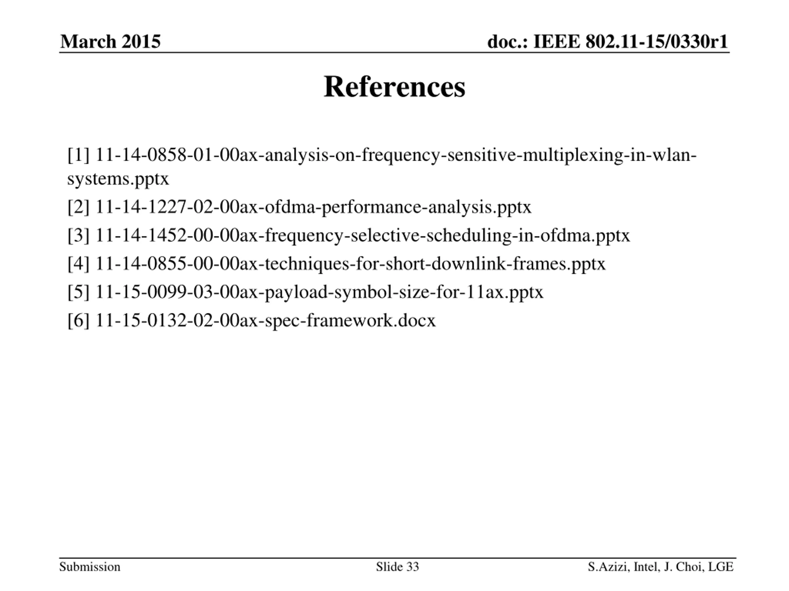 March 2015 doc.: IEEE 802.11-15/0330r1 References [1] 11-14-0858-01-00ax-analysis-on-frequency-sensitive-multiplexing-in-wlan- systems.pptx [2] 11-14-1227-02-00ax-ofdma-performance-analysis.pptx [3] 11-14-1452-00-00ax-frequency-selective-scheduling-in-ofdma.pptx [4] 11-14-0855-00-00ax-techniques-for-short-downlink-frames.pptx [5] 11-15-0099-03-00ax-payload-symbol-size-for-11ax.pptx [6] 11-15-0132-02-00ax-spec-framework.docx Submission Slide 33 S.Azizi, Intel, J. Choi, LGE