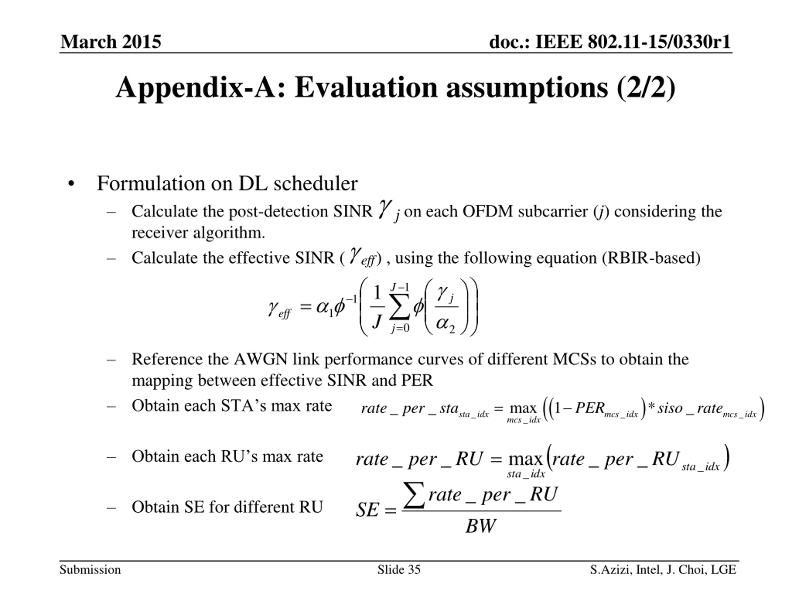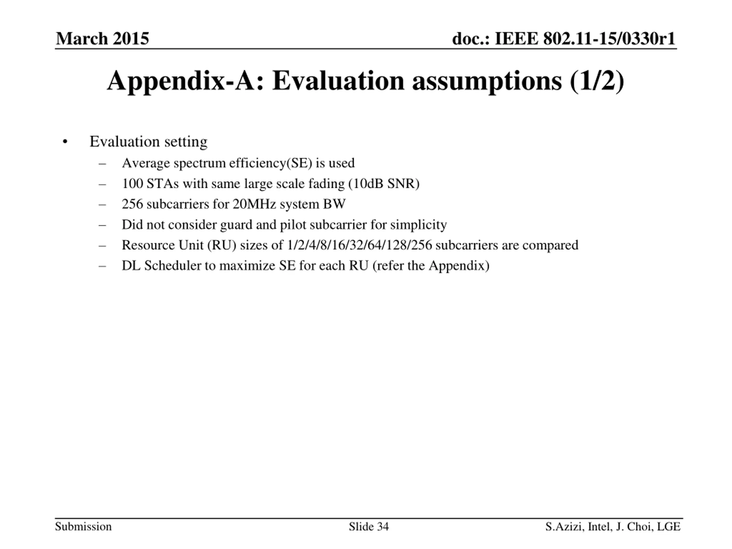 March 2015 doc.: IEEE 802.11-15/0330r1 Appendix-A: Evaluation assumptions (1/2) Evaluation setting Average spectrum efficiency(SE) is used 100 STAs with same large scale fading (10dB SNR) 256 subcarriers for 20MHz system BW Did not consider guard and pilot subcarrier for simplicity Resource Unit (RU) sizes of 1/2/4/8/16/32/64/128/256 subcarriers are compared DL Scheduler to maximize SE for each RU (refer the Appendix) Submission Slide 34 S.Azizi, Intel, J. Choi, LGE