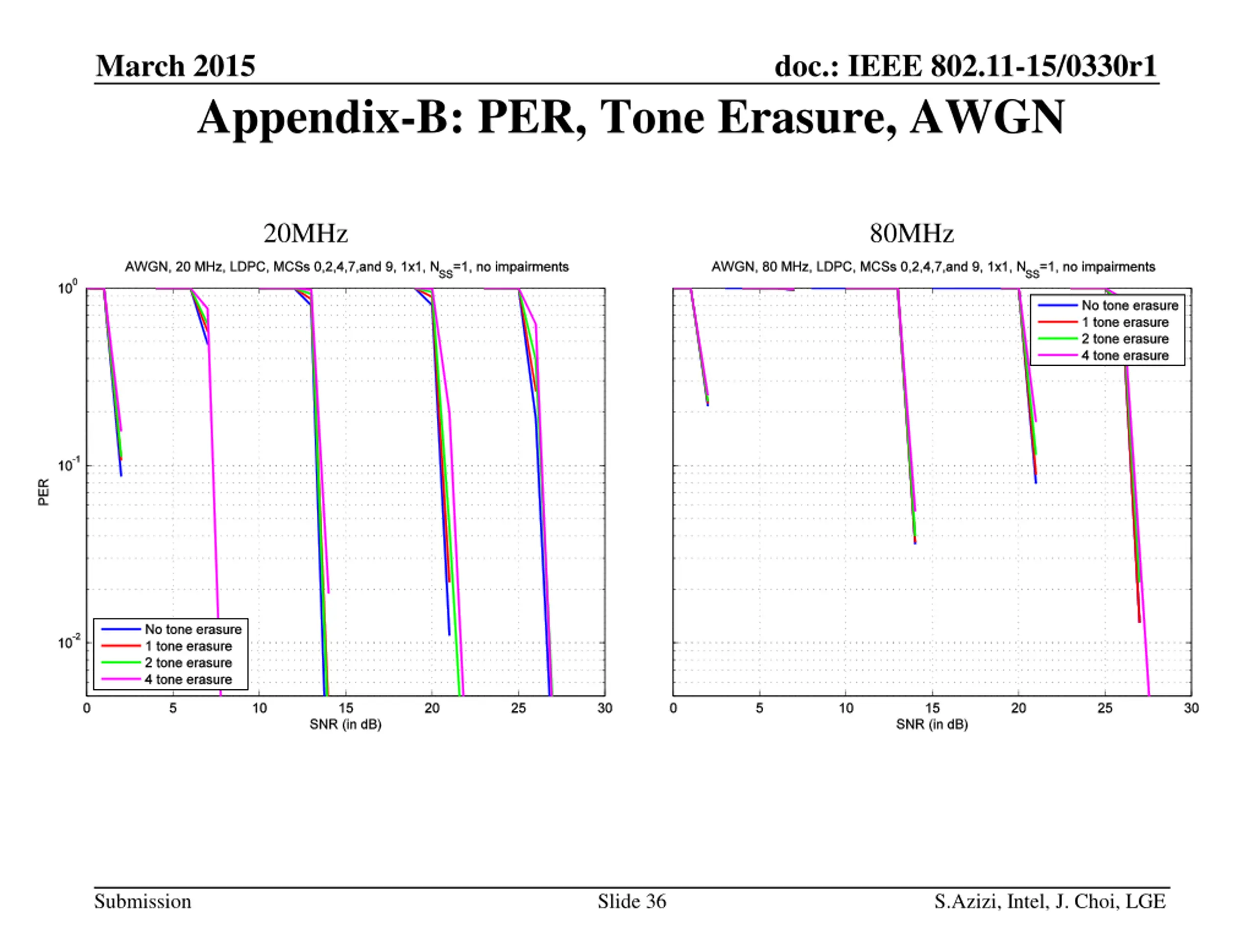 March 2015 doc.: IEEE 802.11-15/0330r1 Appendix-B: PER, Tone Erasure, AWGN 20MHz 80MHz Submission Slide 36 S.Azizi, Intel, J. Choi, LGE