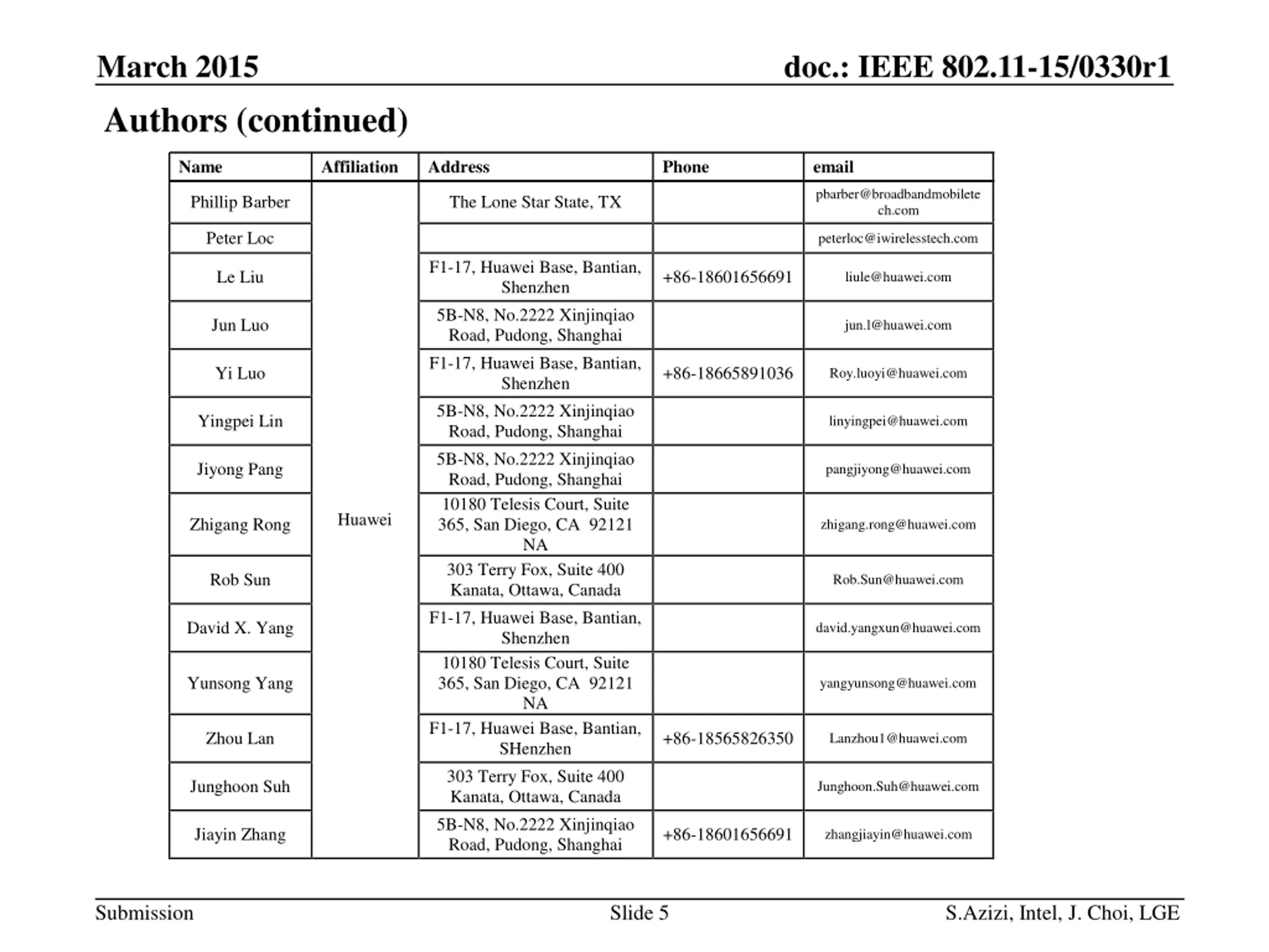 March 2015 doc.: IEEE 802.11-15/0330r1 Authors (continued) Name Phillip Barber Affiliation Address Phone email pbarber@broadbandmobilete ch.com The Lone Star State, TX Peter Loc peterloc@iwirelesstech.com F1-17, Huawei Base, Bantian, Shenzhen 5B-N8, No.2222 Xinjinqiao Road, Pudong, Shanghai F1-17, Huawei Base, Bantian, Shenzhen 5B-N8, No.2222 Xinjinqiao Road, Pudong, Shanghai 5B-N8, No.2222 Xinjinqiao Road, Pudong, Shanghai 10180 Telesis Court, Suite 365, San Diego, CA 92121 NA 303 Terry Fox, Suite 400 Kanata, Ottawa, Canada F1-17, Huawei Base, Bantian, Shenzhen 10180 Telesis Court, Suite 365, San Diego, CA 92121 NA F1-17, Huawei Base, Bantian, SHenzhen 303 Terry Fox, Suite 400 Kanata, Ottawa, Canada 5B-N8, No.2222 Xinjinqiao Road, Pudong, Shanghai Le Liu +86-18601656691 liule@huawei.com Jun Luo jun.l@huawei.com Yi Luo +86-18665891036 Roy.luoyi@huawei.com Yingpei Lin linyingpei@huawei.com Jiyong Pang pangjiyong@huawei.com Huawei Zhigang Rong zhigang.rong@huawei.com Rob Sun Rob.Sun@huawei.com David X. Yang david.yangxun@huawei.com Yunsong Yang yangyunsong@huawei.com Zhou Lan +86-18565826350 Lanzhou1@huawei.com Junghoon Suh Junghoon.Suh@huawei.com Jiayin Zhang +86-18601656691 zhangjiayin@huawei.com Submission Slide 5 S.Azizi, Intel, J. Choi, LGE