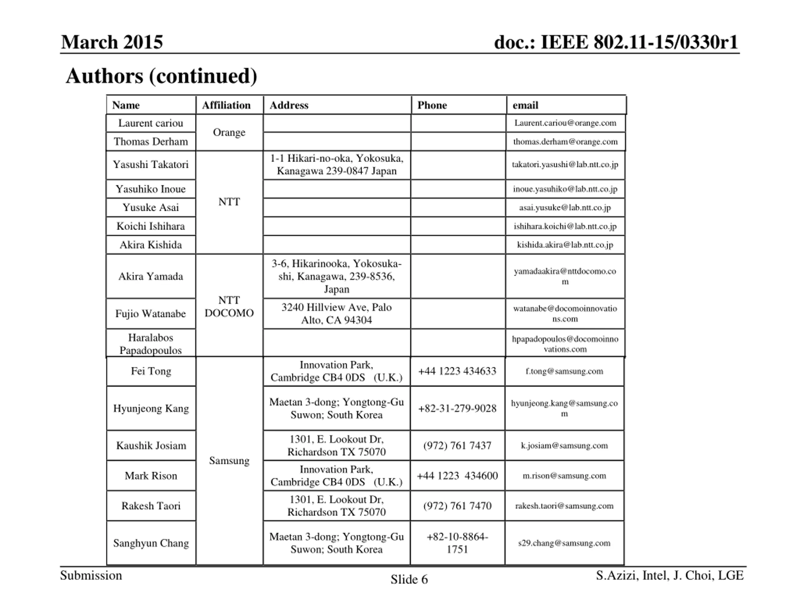 March 2015 doc.: IEEE 802.11-15/0330r1 Authors (continued) Name Affiliation Address Phone email Laurent cariou Laurent.cariou@orange.com Orange Thomas Derham Yasushi Takatori thomas.derham@orange.com 1-1 Hikari-no-oka, Yokosuka, Kanagawa 239-0847 Japan takatori.yasushi@lab.ntt.co.jp Yasuhiko Inoue inoue.yasuhiko@lab.ntt.co.jp NTT Yusuke Asai asai.yusuke@lab.ntt.co.jp Koichi Ishihara ishihara.koichi@lab.ntt.co.jp Akira Kishida kishida.akira@lab.ntt.co.jp 3-6, Hikarinooka, Yokosuka- shi, Kanagawa, 239-8536, Japan yamadaakira@nttdocomo.co m Akira Yamada NTT 3240 Hillview Ave, Palo Alto, CA 94304 watanabe@docomoinnovatio ns.com DOCOMO Fujio Watanabe Haralabos Papadopoulos hpapadopoulos@docomoinno vations.com Innovation Park, Cambridge CB4 0DS (U.K.) Fei Tong +44 1223 434633 f.tong@samsung.com Maetan 3-dong; Yongtong-Gu Suwon; South Korea hyunjeong.kang@samsung.co m Hyunjeong Kang +82-31-279-9028 1301, E. Lookout Dr, Richardson TX 75070 Innovation Park, Cambridge CB4 0DS (U.K.) +44 1223 434600 1301, E. Lookout Dr, Richardson TX 75070 Kaushik Josiam (972) 761 7437 k.josiam@samsung.com Samsung Mark Rison m.rison@samsung.com Rakesh Taori (972) 761 7470 rakesh.taori@samsung.com Maetan 3-dong; Yongtong-Gu Suwon; South Korea +82-10-8864- 1751 Sanghyun Chang s29.chang@samsung.com Submission S.Azizi, Intel, J. Choi, LGE Slide 6