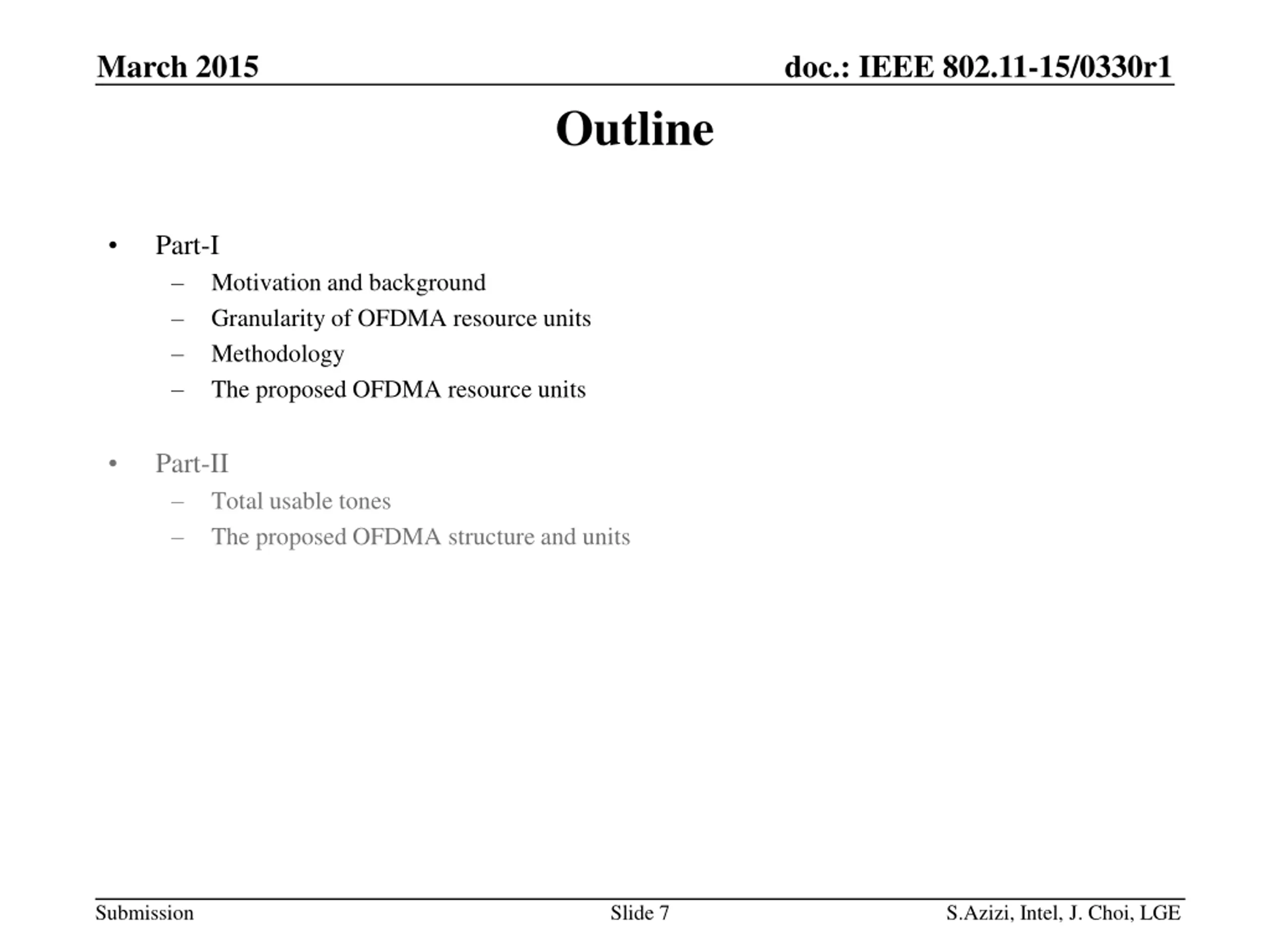 March 2015 doc.: IEEE 802.11-15/0330r1 Outline Part-I Motivation and background Granularity of OFDMA resource units Methodology The proposed OFDMA resource units Part-II Total usable tones The proposed OFDMA structure and units Submission Slide 7 S.Azizi, Intel, J. Choi, LGE