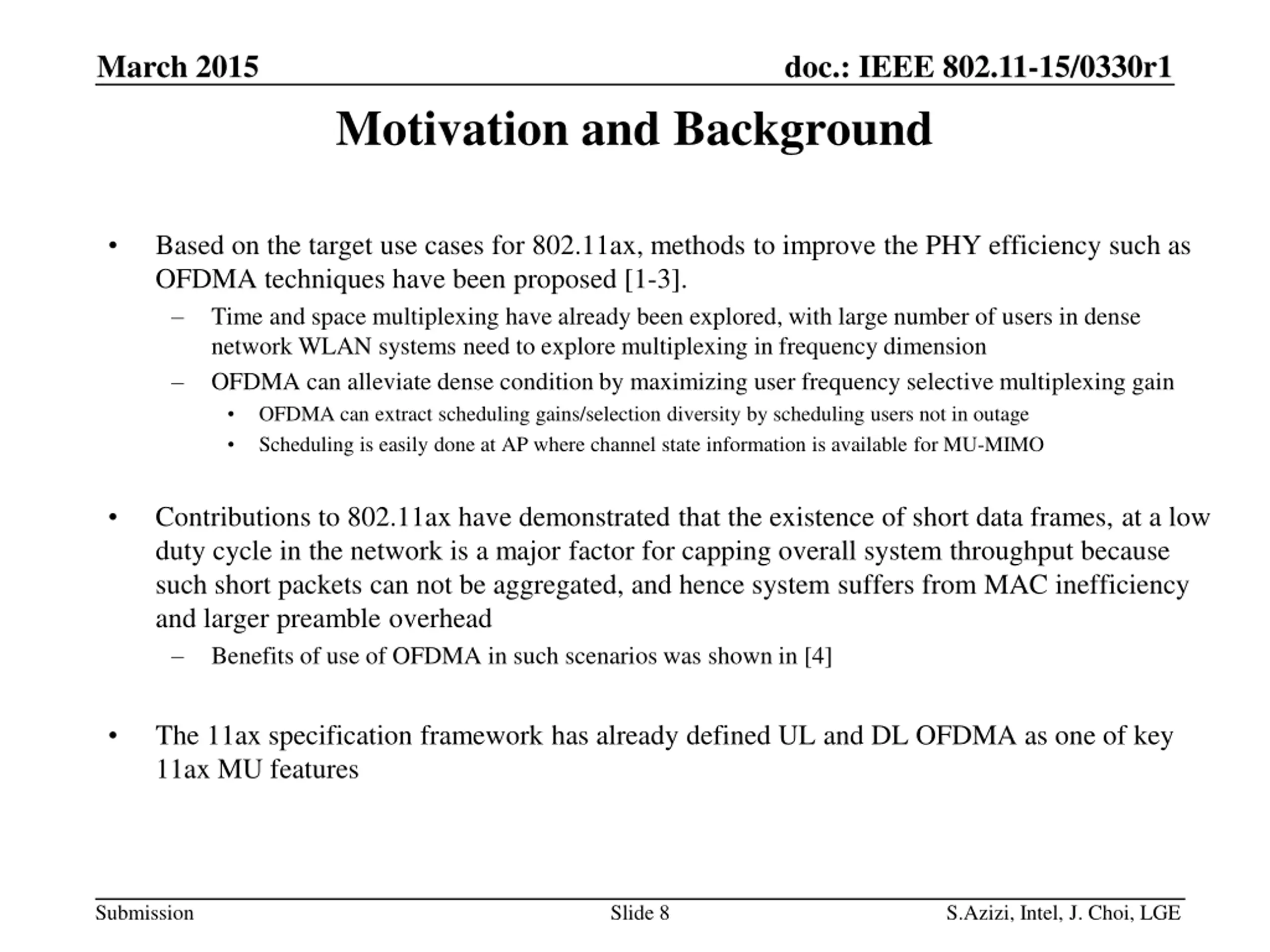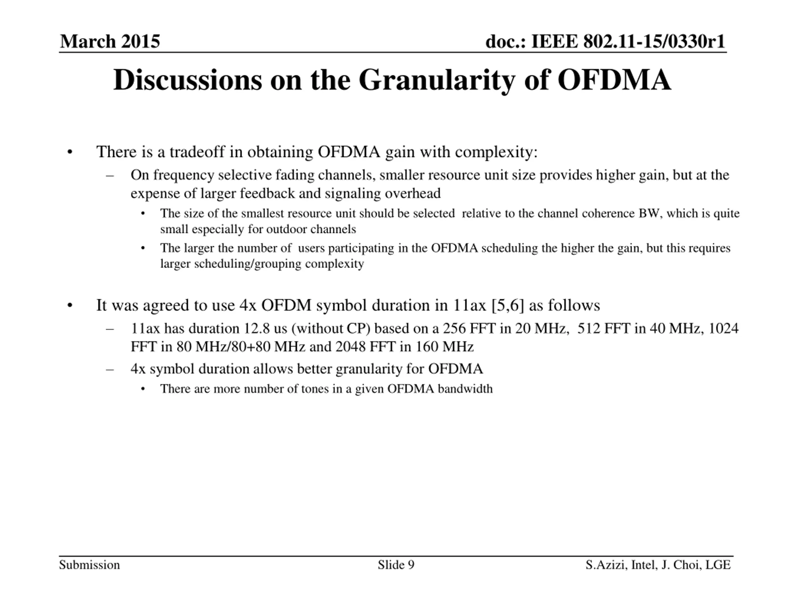 March 2015 doc.: IEEE 802.11-15/0330r1 Motivation and Background Based on the target use cases for 802.11ax, methods to improve the PHY efficiency such as OFDMA techniques have been proposed [1-3]. Time and space multiplexing have already been explored, with large number of users in dense network WLAN systems need to explore multiplexing in frequency dimension OFDMA can alleviate dense condition by maximizing user frequency selective multiplexing gain OFDMA can extract scheduling gains/selection diversity by scheduling users not in outage Scheduling is easily done at AP where channel state information is available for MU-MIMO Contributions to 802.11ax have demonstrated that the existence of short data frames, at a low duty cycle in the network is a major factor for capping overall system throughput because such short packets can not be aggregated, and hence system suffers from MAC inefficiency and larger preamble overhead Benefits of use of OFDMA in such scenarios was shown in [4] The 11ax specification framework has already defined UL and DL OFDMA as one of key 11ax MU features Submission Slide 8 S.Azizi, Intel, J. Choi, LGE
