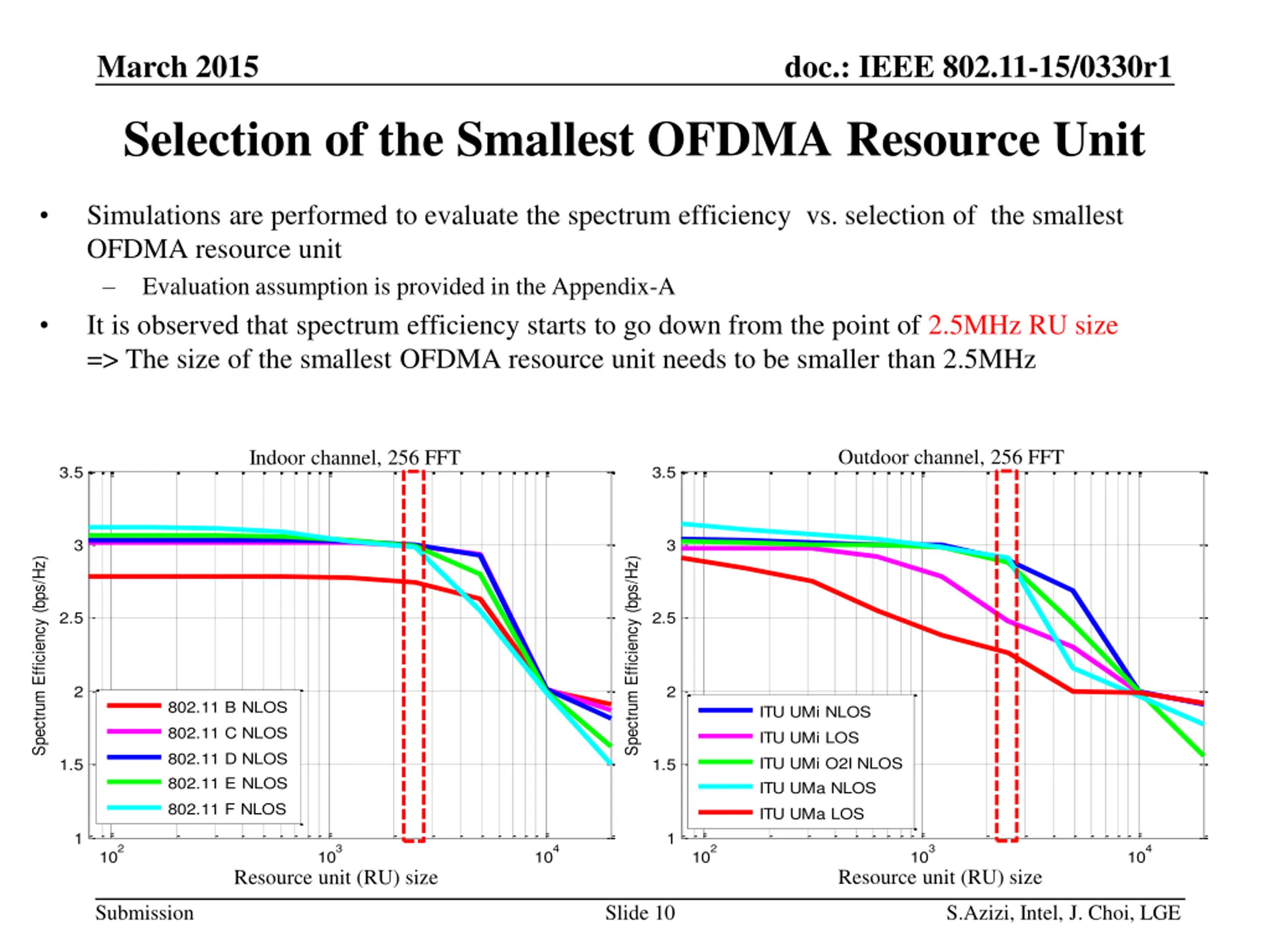 March 2015 doc.: IEEE 802.11-15/0330r1 Discussions on the Granularity of OFDMA There is a tradeoff in obtaining OFDMA gain with complexity: On frequency selective fading channels, smaller resource unit size provides higher gain, but at the expense of larger feedback and signaling overhead The size of the smallest resource unit should be selected relative to the channel coherence BW, which is quite small especially for outdoor channels The larger the number of users participating in the OFDMA scheduling the higher the gain, but this requires larger scheduling/grouping complexity It was agreed to use 4x OFDM symbol duration in 11ax [5,6] as follows 11ax has duration 12.8 us (without CP) based on a 256 FFT in 20 MHz, 512 FFT in 40 MHz, 1024 FFT in 80 MHz/80+80 MHz and 2048 FFT in 160 MHz 4x symbol duration allows better granularity for OFDMA There are more number of tones in a given OFDMA bandwidth Submission Slide 9 S.Azizi, Intel, J. Choi, LGE