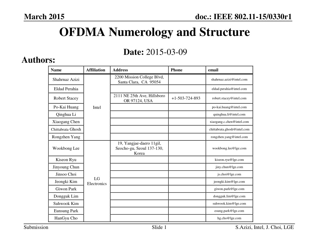 March 2015 doc.: IEEE 802.11-15/0330r1 OFDMA Numerology and Structure Date: 2015-03-09 Authors: Name Affiliation Address 2200 Mission College Blvd, Santa Clara, CA 95054 2111 NE 25th Ave, Hillsboro OR 97124, USA Phone email Shahrnaz Azizi shahrnaz.azizi@intel.com Eldad Perahia eldad.perahia@intel.com Robert Stacey +1-503-724-893 robert.stacey@intel.com Po-Kai Huang Intel po-kai.huang@intel.com Qinghua Li quinghua.li@intel.com Xiaogang Chen xiaogang.c.chen@intel.com Chittabrata Ghosh chittabrata.ghosh@intel.com Rongzhen Yang rongzhen.yang@intel.com 19, Yangjae-daero 11gil, Seocho-gu, Seoul 137-130, Korea Wookbong Lee wookbong.lee@lge.com Kiseon Ryu kiseon.ryu@lge.com Jinyoung Chun jiny.chun@lge.com Jinsoo Choi js.choi@lge.com LG Jeongki Kim jeongki.kim@lge.com Electronics Giwon Park giwon.park@lge.com Dongguk Lim dongguk.lim@lge.com Suhwook Kim suhwook.kim@lge.com Eunsung Park esung.park@lge.com HanGyu Cho hg.cho@lge.com Submission Slide 1 S.Azizi, Intel, J. Choi, LGE