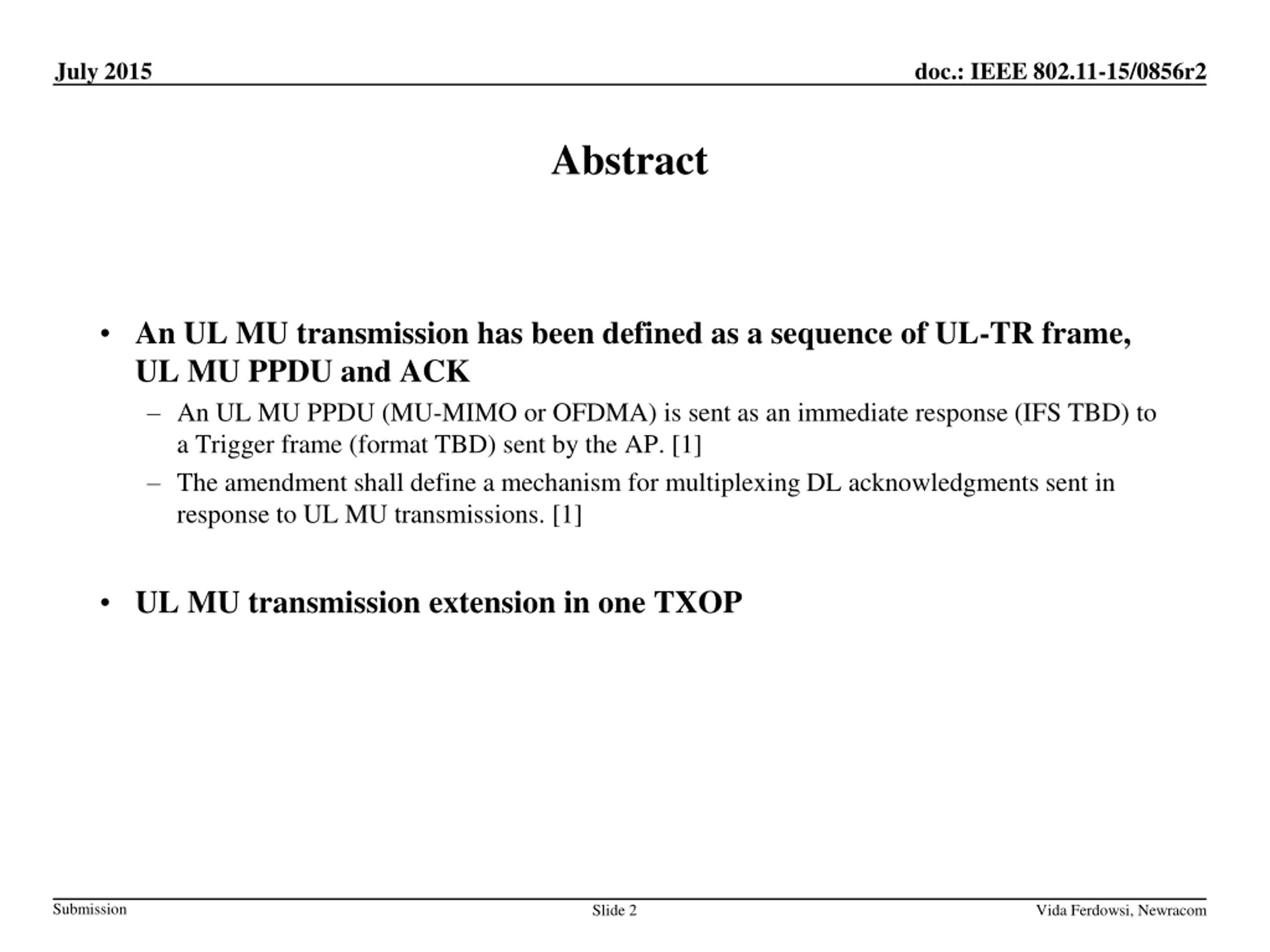 July 2015 doc.: IEEE 802.11-15/0856r2 Abstract An UL MU transmission has been defined as a sequence of UL-TR frame, UL MU PPDU and ACK An UL MU PPDU (MU-MIMO or OFDMA) is sent as an immediate response (IFS TBD) to a Trigger frame (format TBD) sent by the AP. [1] The amendment shall define a mechanism for multiplexing DL acknowledgments sent in response to UL MU transmissions. [1] UL MU transmission extension in one TXOP Submission Slide 2 Vida Ferdowsi, Newracom