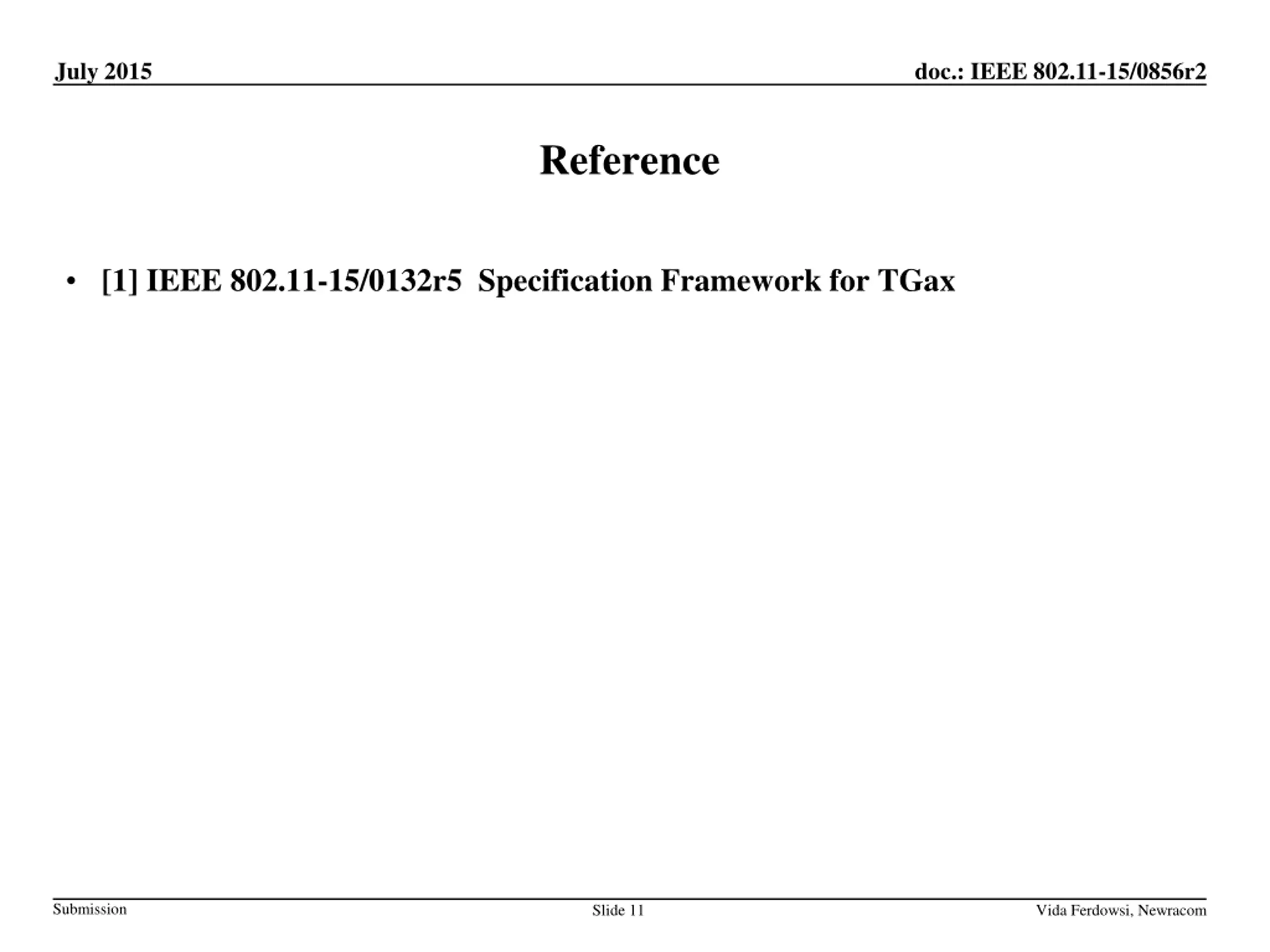 July 2015 doc.: IEEE 802.11-15/0856r2 Reference [1] IEEE 802.11-15/0132r5 Specification Framework for TGax Submission Slide 11 Vida Ferdowsi, Newracom