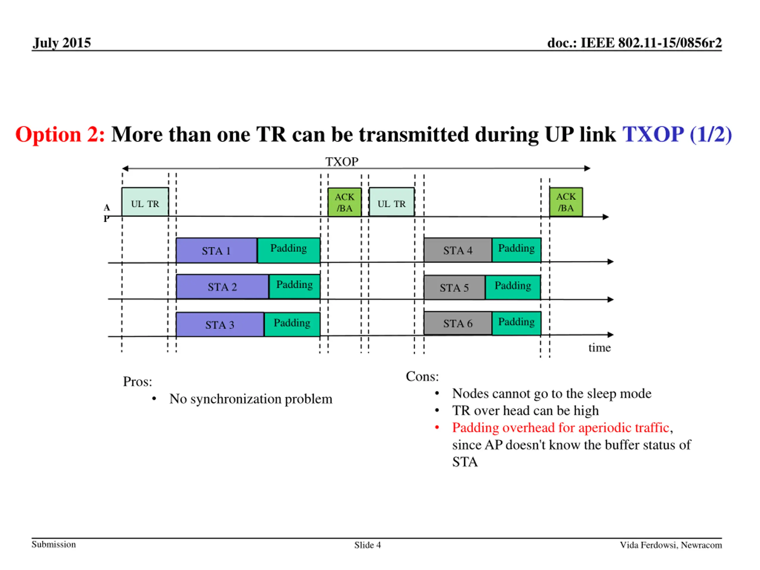July 2015 doc.: IEEE 802.11-15/0856r2 Option 1: A TR schedules all uplink transmissions TXOP ACK/ BA ACK/ BA ULTR AP Padding Padding STA 1 STA 4 Padding Padding STA 2 STA 5 Padding Padding STA 6 STA 3 time Cons: Pros: Synchronization problem Padding overhead for aperiodic traffic (since AP should know about STAs queue status) Nodes can go to the sleep mode Less TR overhead Useful for periodic traffic Submission Slide 3 Vida Ferdowsi, Newracom