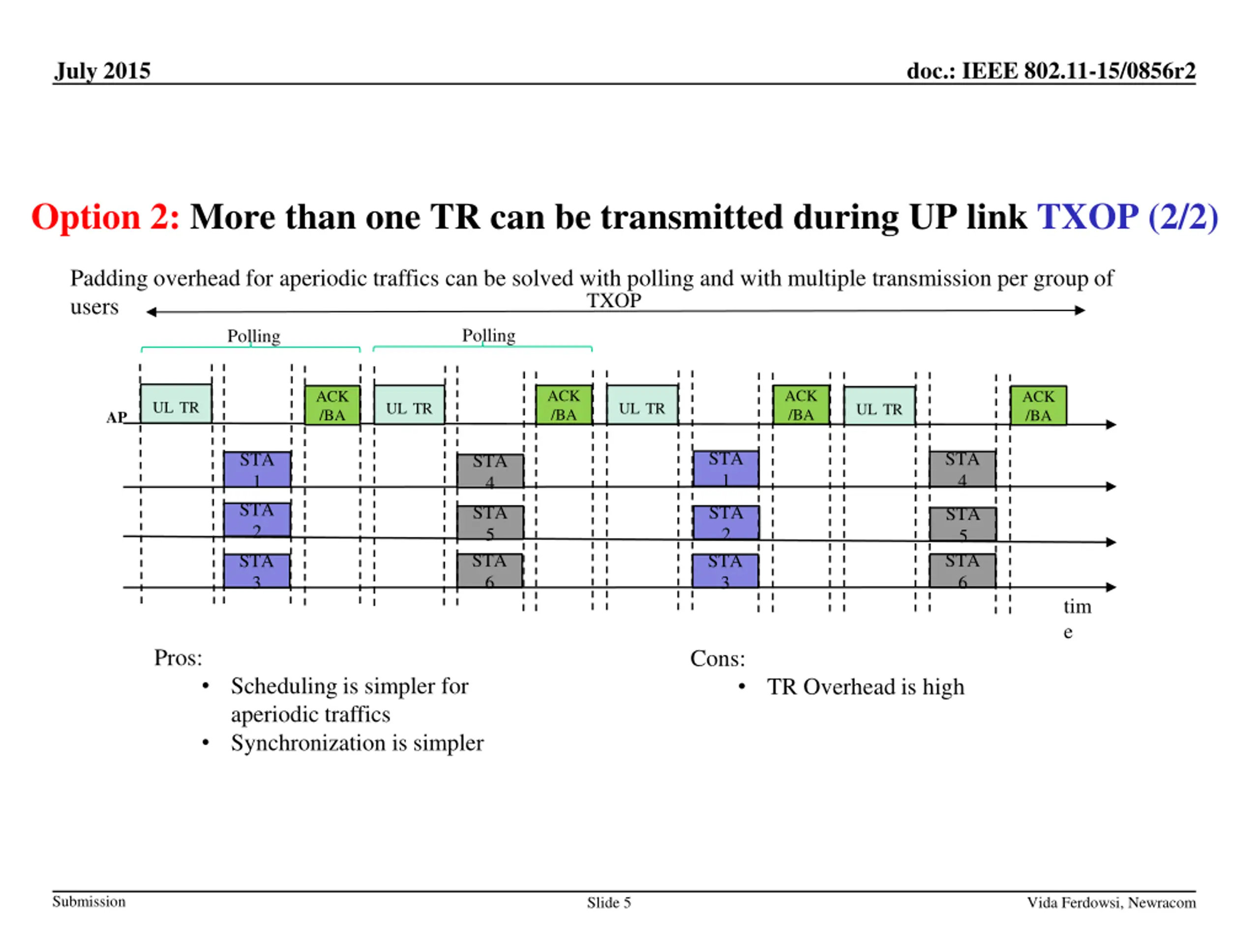 July 2015 doc.: IEEE 802.11-15/0856r2 Option 2: More than one TR can be transmitted during UP link TXOP (1/2) TXOP ACK /BA ACK /BA ULTR ULTR A P Padding Padding STA 4 STA 1 Padding Padding STA 2 STA 5 Padding Padding STA 6 STA 3 time Cons: Pros: Nodes cannot go to the sleep mode TR over head can be high Padding overhead for aperiodic traffic, since AP doesn't know the buffer status of STA No synchronization problem Submission Slide 4 Vida Ferdowsi, Newracom