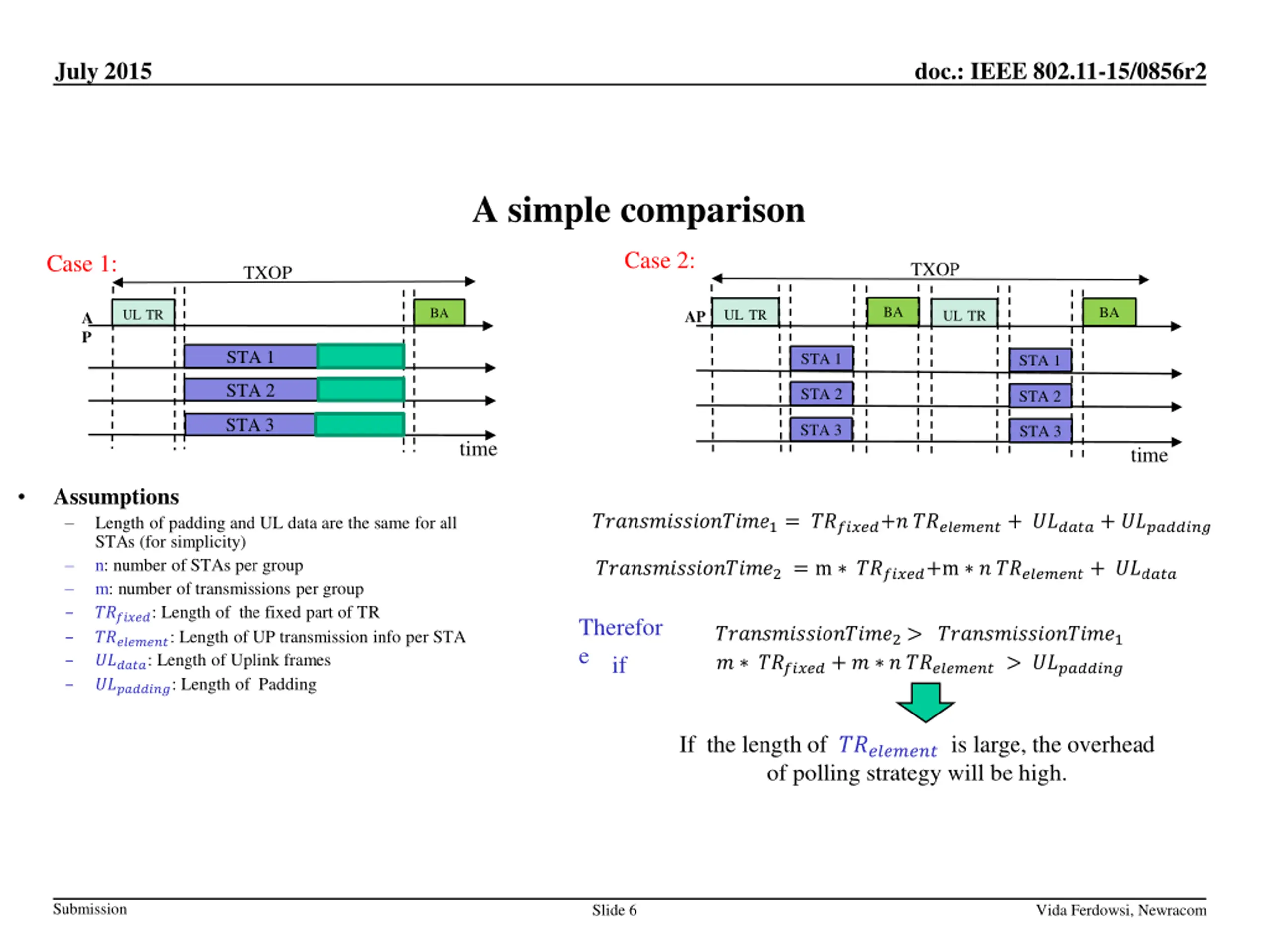 July 2015 doc.: IEEE 802.11-15/0856r2 A simple comparison Case 2: Case 1: TXOP TXOP ULTR ULTR ULTR BA BA BA AP A P STA 1 STA 1 STA 1 STA 2 STA 2 STA 2 STA 3 STA 3 STA 3 time time Assumptions Length of padding and UL data are the same for all STAs (for simplicity) n: number of STAs per group m: number of transmissions per group ???????: Length of the fixed part of TR ?????????: Length of UP transmission info per STA ??????: Length of Uplink frames ?????????: Length of Padding ????????????????1= ???????+? ?????????+ ??????+ ????????? ????????????????2 = m ???????+m ? ?????????+ ?????? Therefor e if ????????????????2 > ????????????????1 ? ???????+ ? ? ????????? > ????????? If the length of ????????? is large, the overhead of polling strategy will be high. Submission Slide 6 Vida Ferdowsi, Newracom