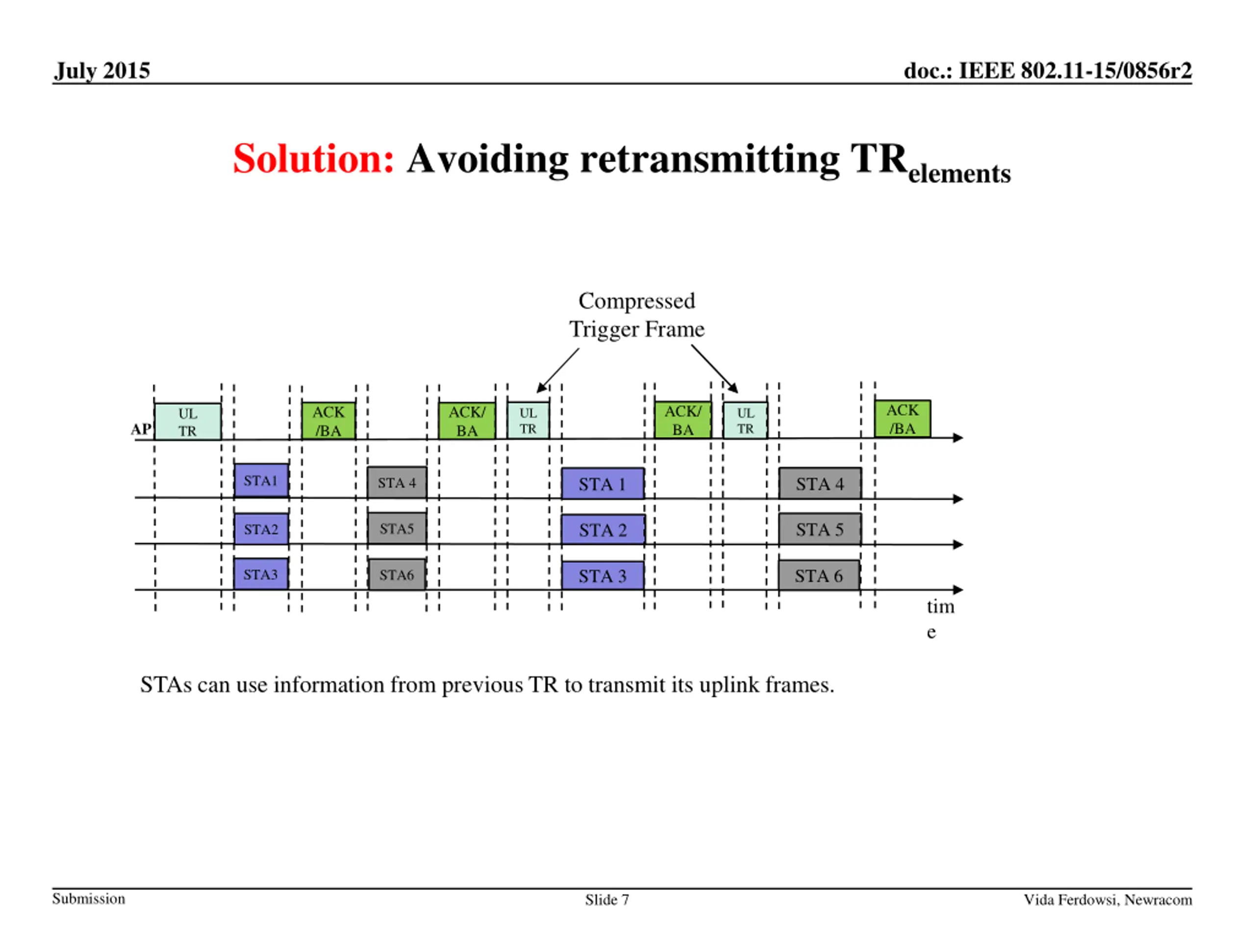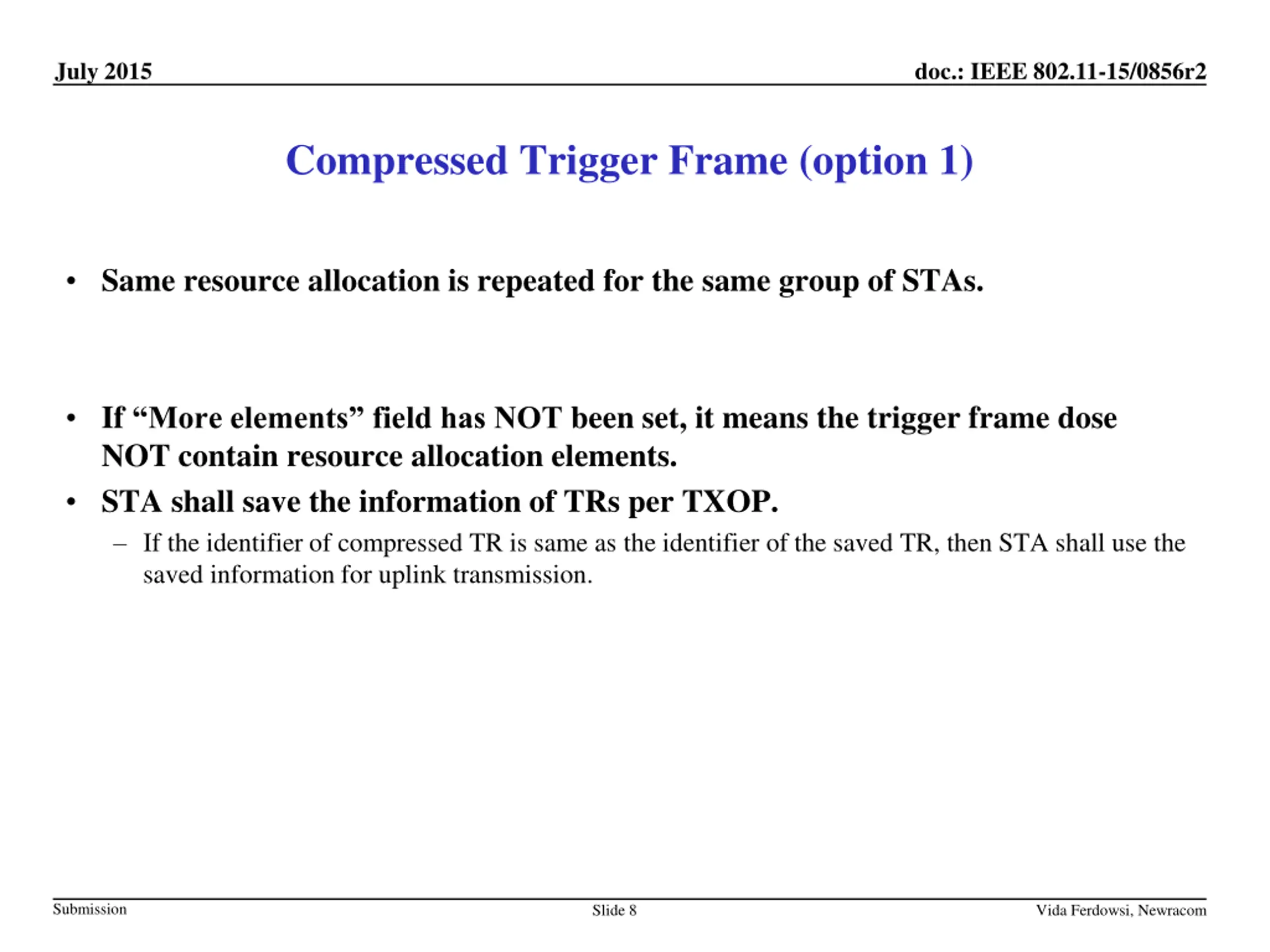 July 2015 doc.: IEEE 802.11-15/0856r2 Solution: Avoiding retransmitting TRelements Compressed Trigger Frame ACK /BA ACK/ BA ACK /BA ACK/ BA UL TR UL TR UL TR AP STA1 STA 4 STA 1 STA 4 STA 5 STA 2 STA5 STA2 STA 6 STA 3 STA3 STA6 tim e STAs can use information from previous TR to transmit its uplink frames. Submission Slide 7 Vida Ferdowsi, Newracom